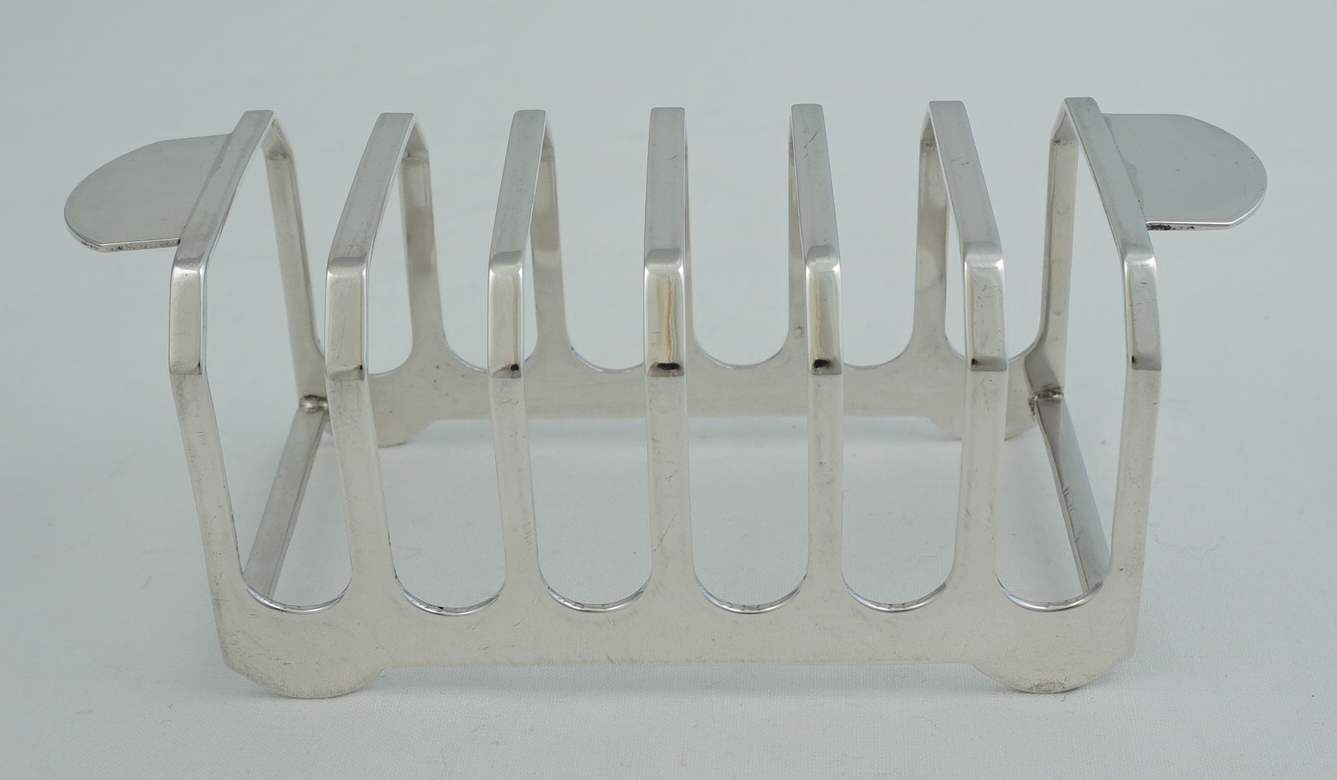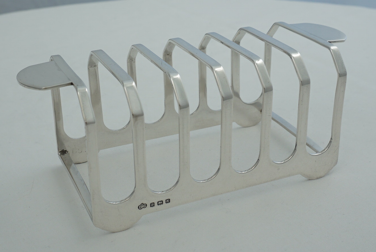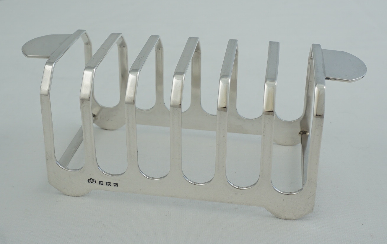 DESCRIPTION | Good quality vintage English solid sterling silver 7-bar toast rack very unusual/unique handles. Never seen these before yet they are such a good idea. Makes passing the toast so easy and avoids accidentally touching the toast whilst doing so. |