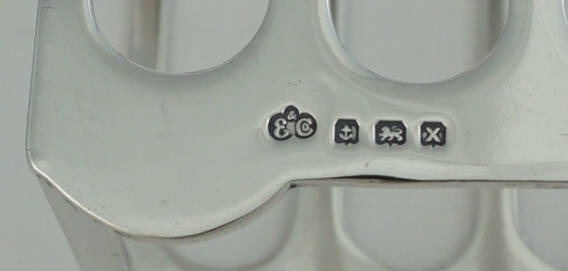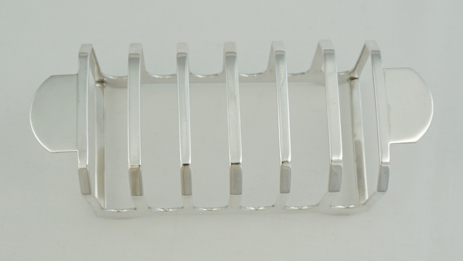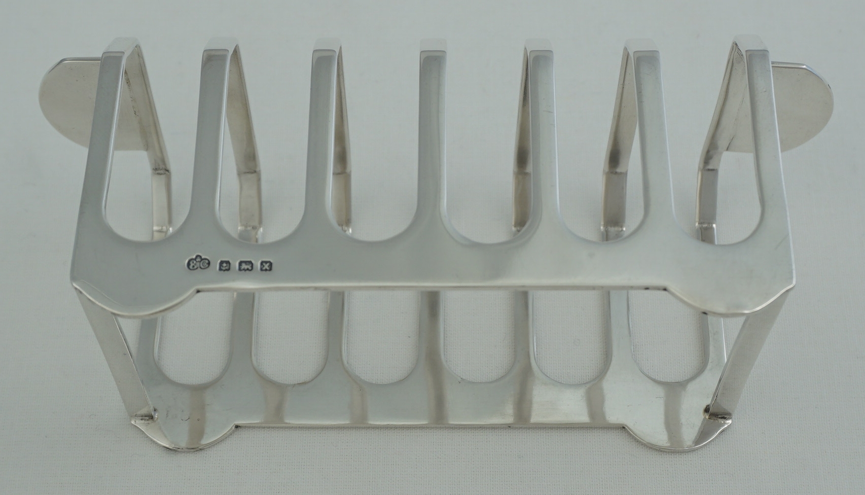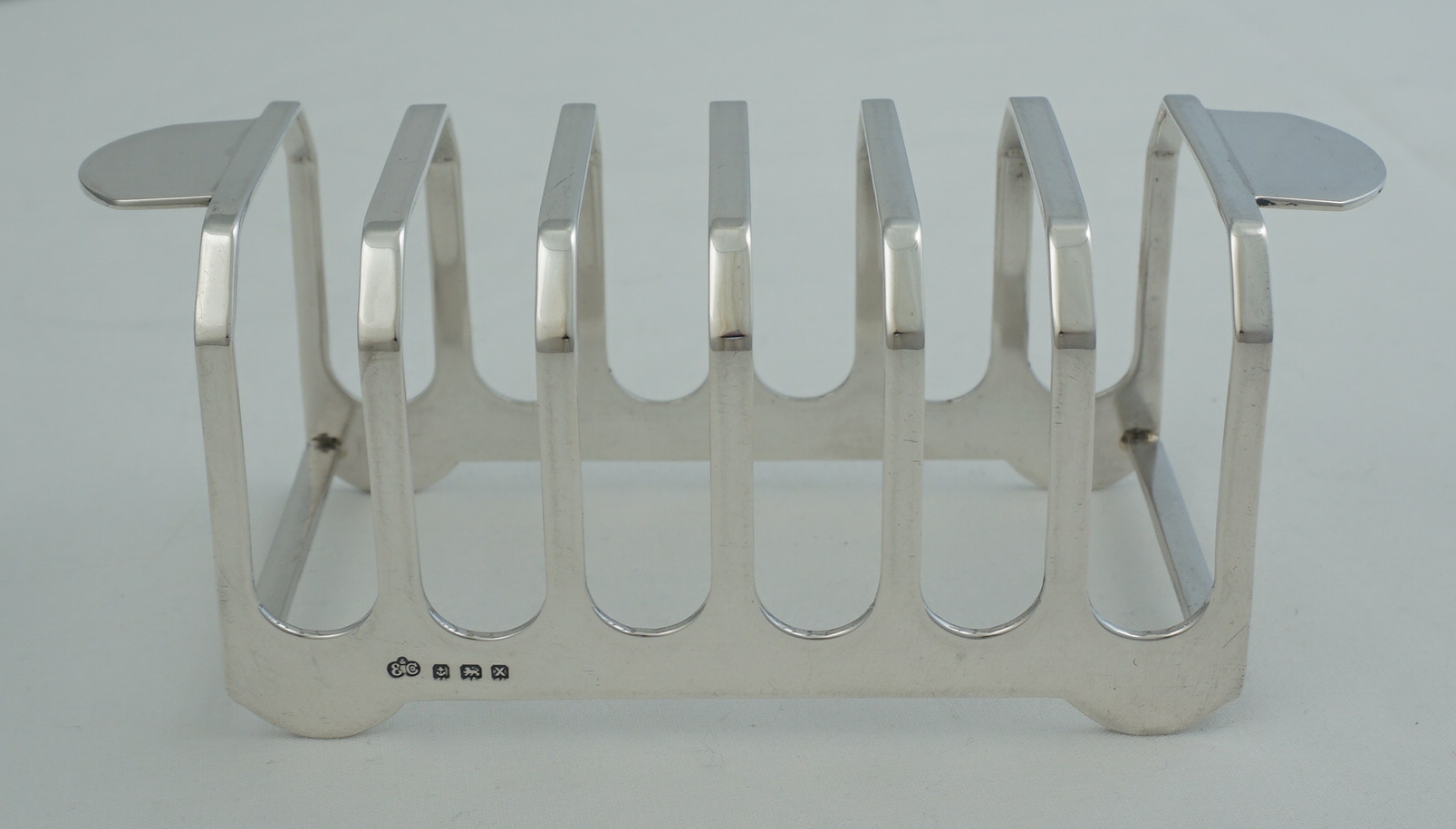 DESCRIPTION | Good quality vintage English solid sterling silver 7-bar toast rack very unusual/unique handles. Never seen these before yet they are such a good idea. Makes passing the toast so easy and avoids accidentally touching the toast whilst doing so. |