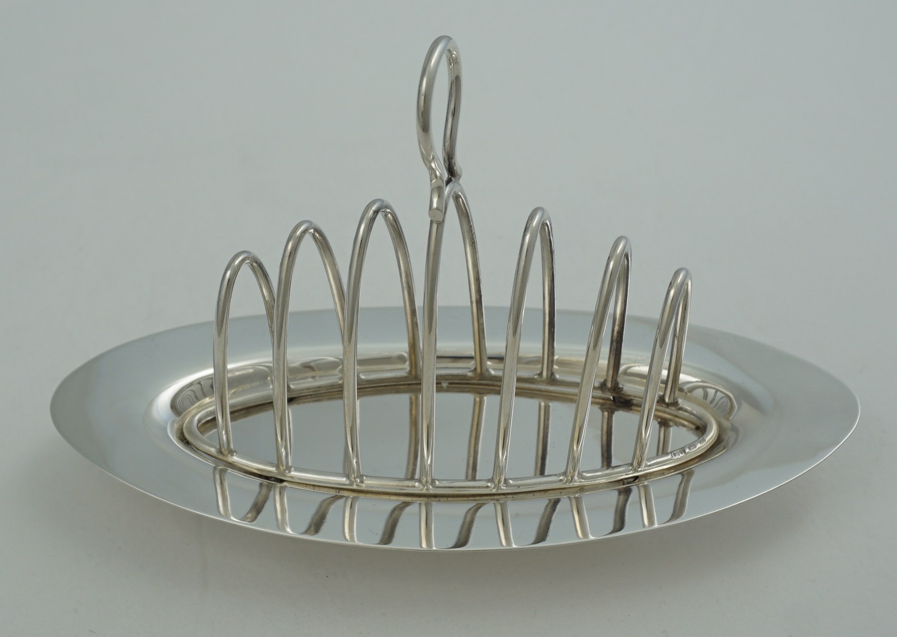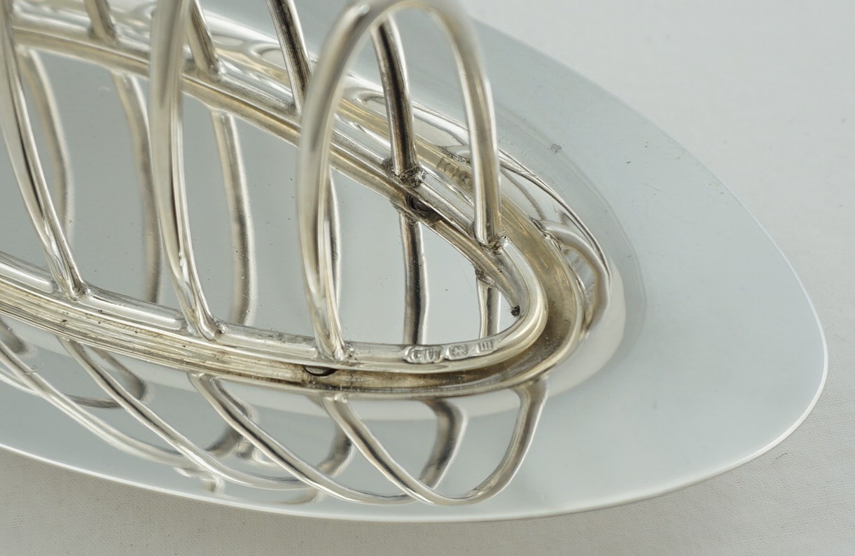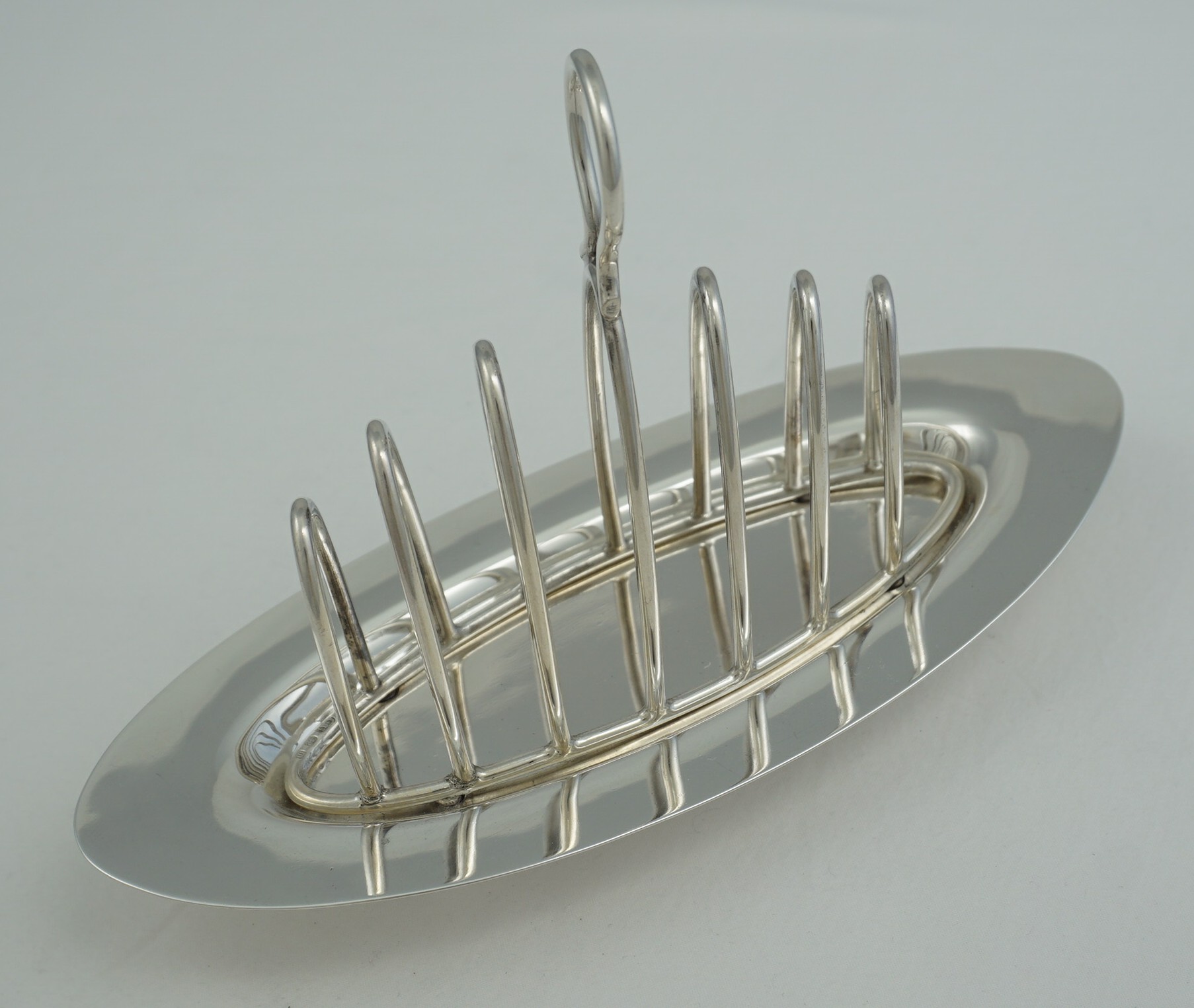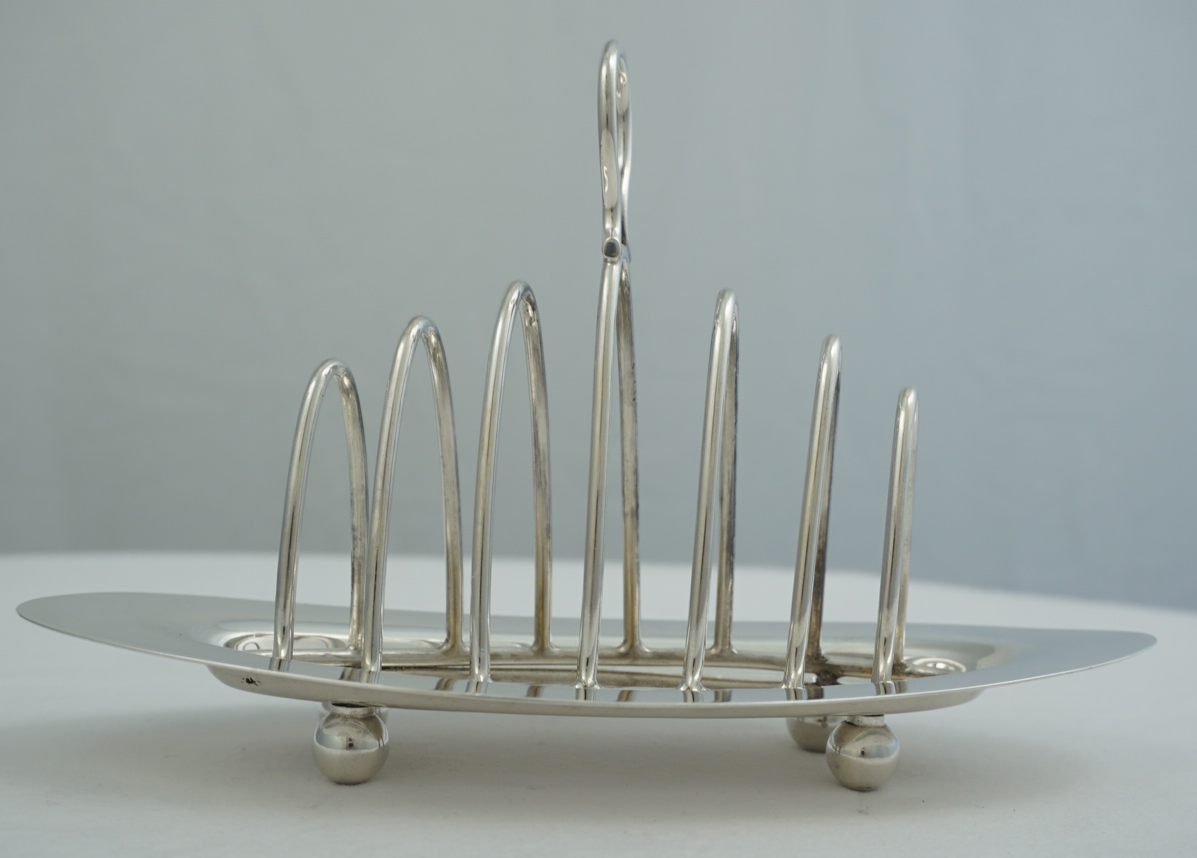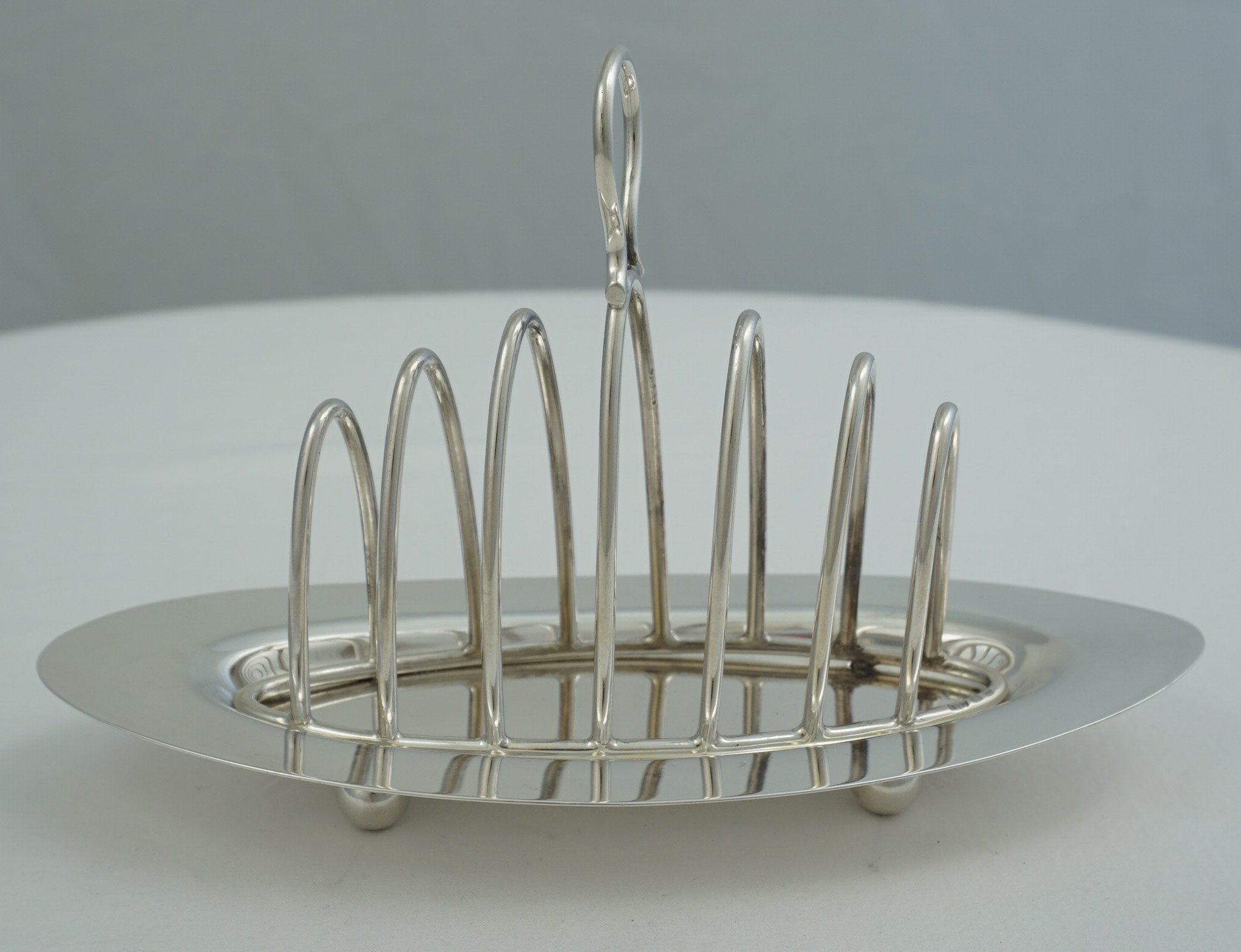| DESCRIPTION | High quality antique English solid sterling silver 7-bar toast rack with central carrying handle and integral stand. |