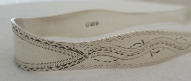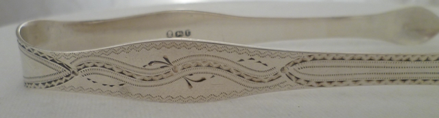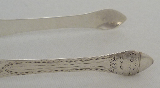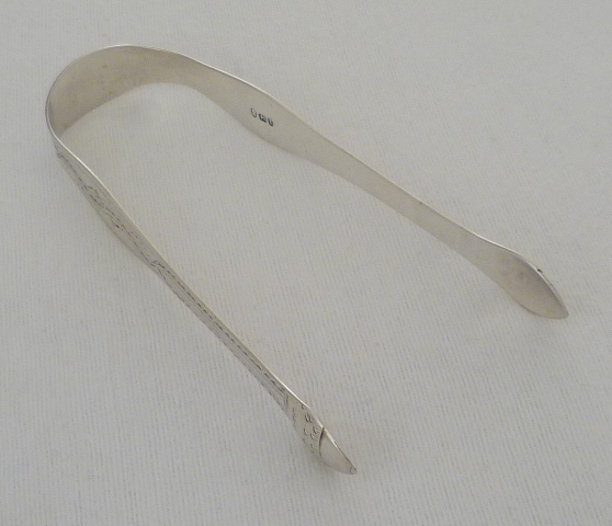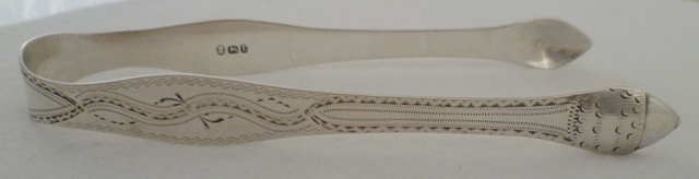 DESCRIPTION | Pretty and unusually broad pair of Georgian silver sugar tongs with bright cut engraved decoration, acorn grips and very lightly engraved original initials to the bow. |