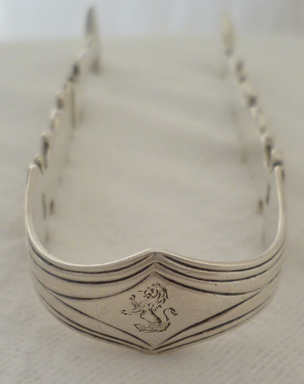 Attractive and early pair of Georgian cast silver sugar tongs with a crest engraved bow and five lobe grips. Unusually for cast tongs the arms are not pierced. |