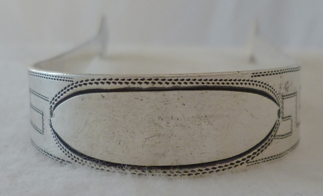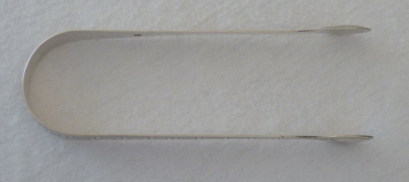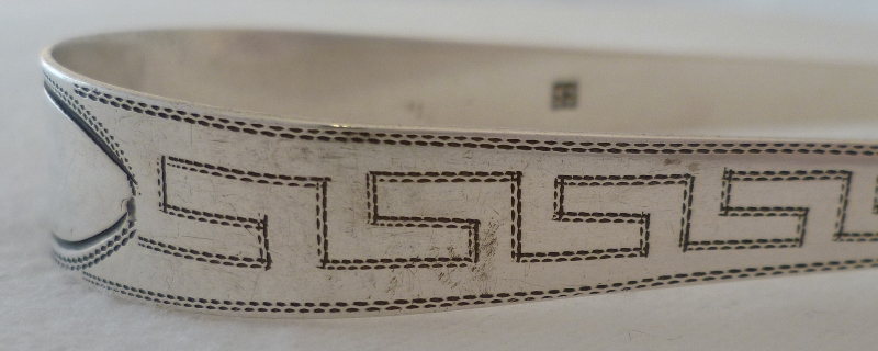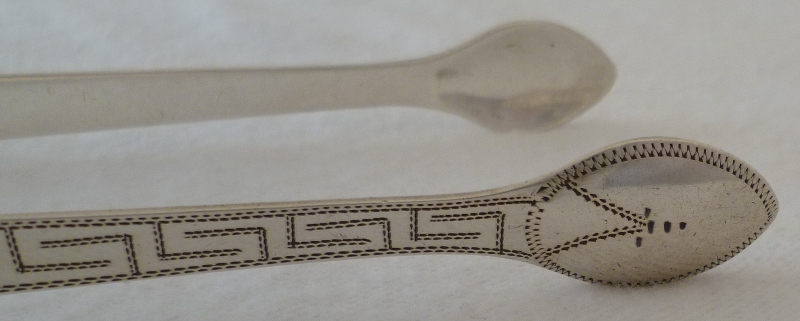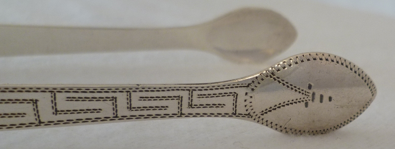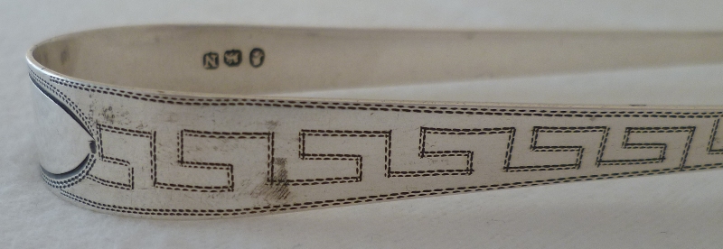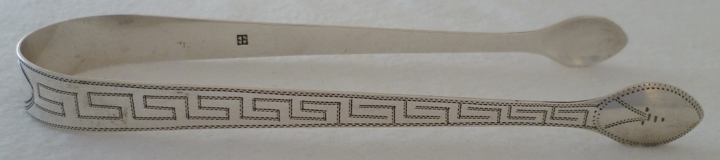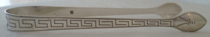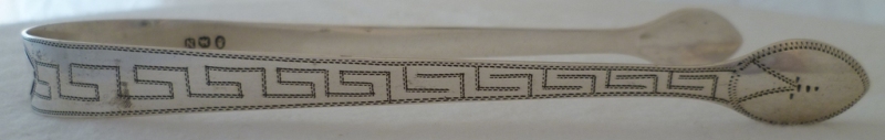 DESCRIPTION | Very good Georgian silver sugar tongs with Greek key engraved decoration and a blank cartouche to the bow. |