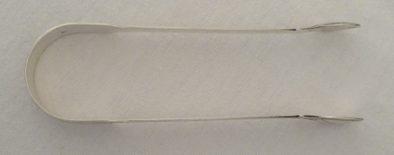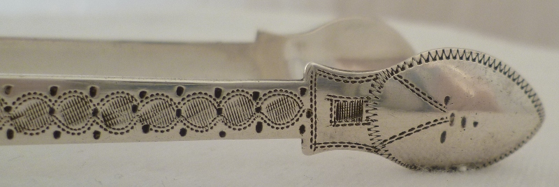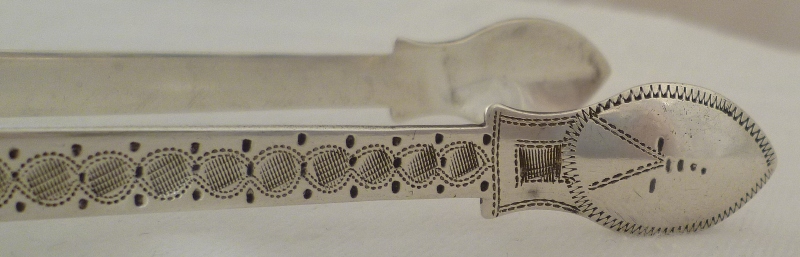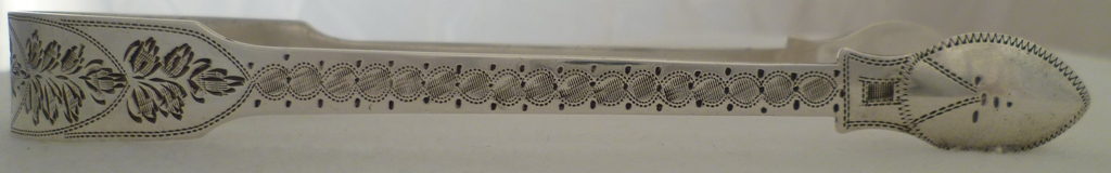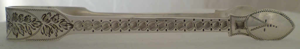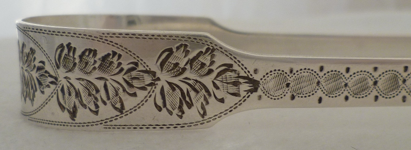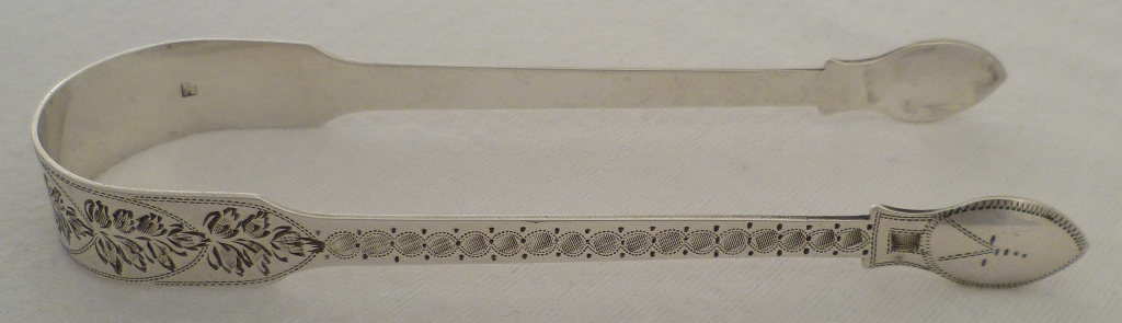 DESCRIPTION | Very good Georgian silver Fiddle pattern sugar tongs with bright cut engraved decoration and a monogram engraved cartouche to the bow. |
