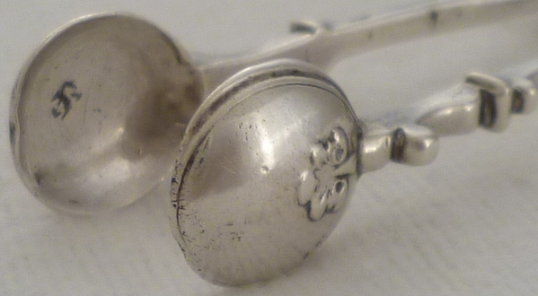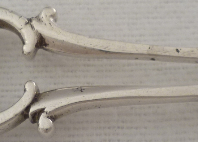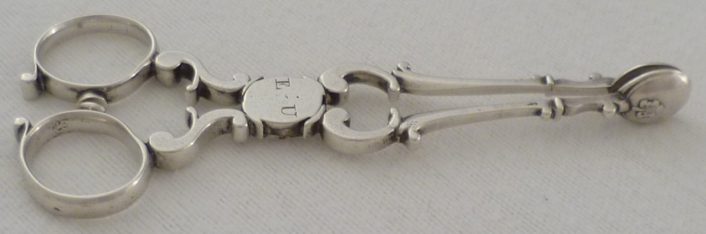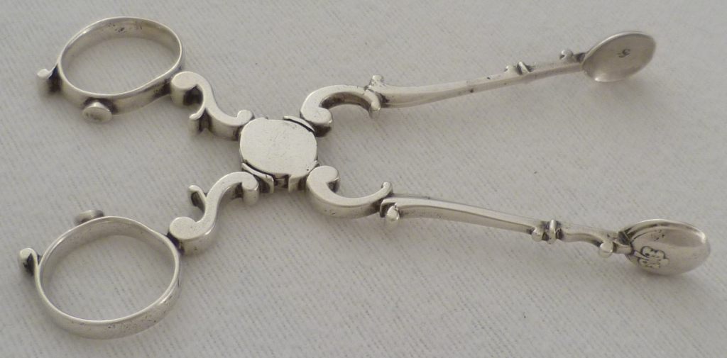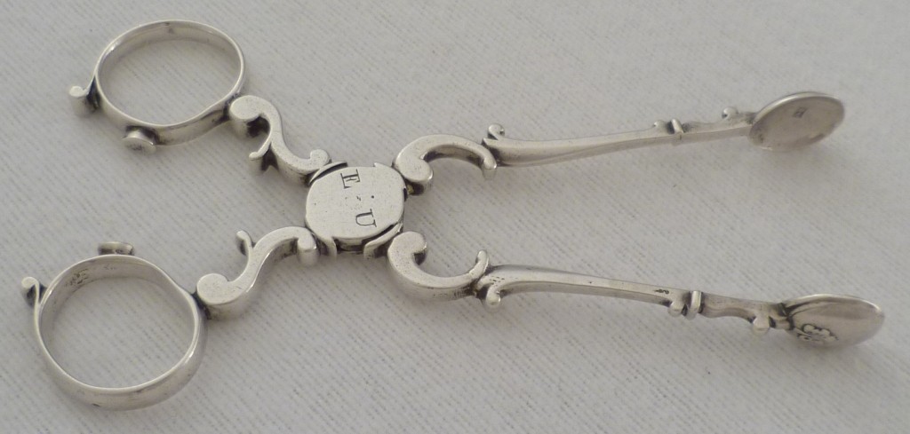 Good, very early Georgian silver sugar nips with rat tail fancy back spoon grips and initials E U engraved to the box hinge. Usual marking for nips of this period with maker's mark within one grip and lion passant within the