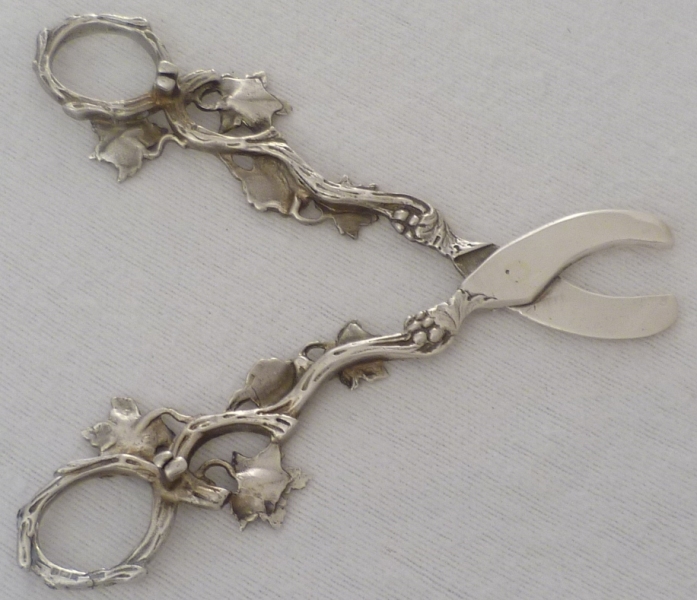 Pair of Netherlands cast silver grape scissors with vine decoration and two back legs to ease use. Made by a firm famous for reproduction and retrospective Dutch silver and imported through Birmingham in 1991. |
