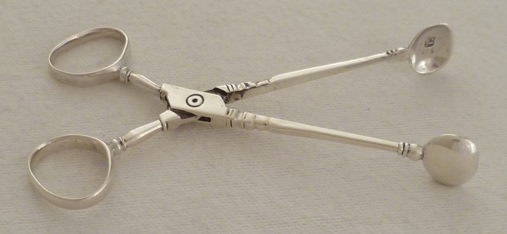 DESCRIPTION | Early Georgian silver sugar nips with fine, parallel baluster shafts and arms, ring cushions below the finger rings and an elegantly extended rectangular pin hinge. The form of the shaped, plain oval grips is repeated in the unusual finger rings. Typically marked for this period by maker only within each grip's bowl. |