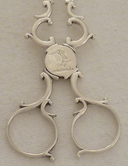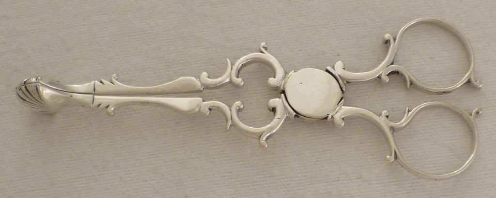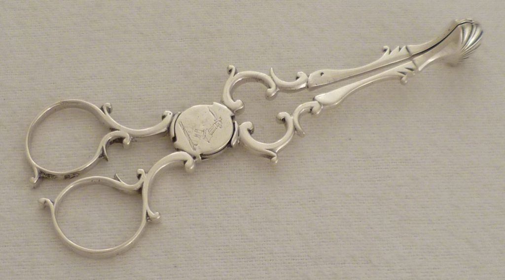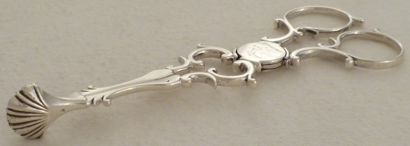 DESCRIPTION | Georgian silver rococo sugar nips with fancy finger rings, small round box hinge crested to one side and broad five lobe grips. |