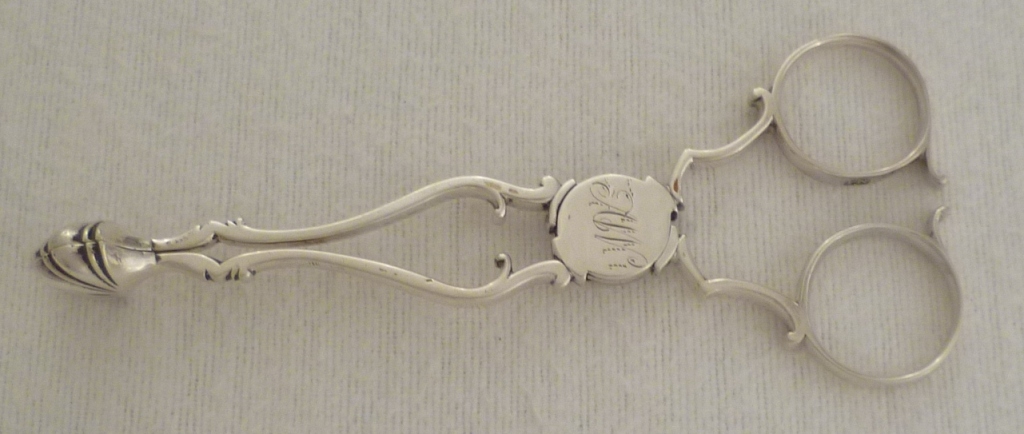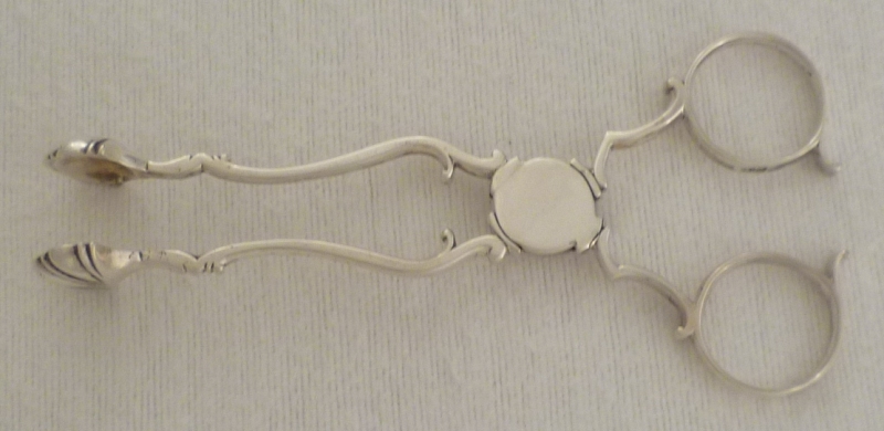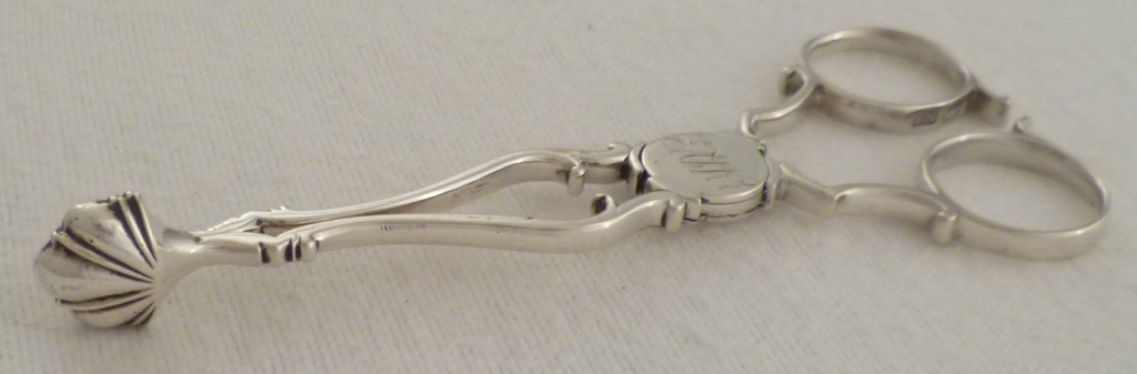 DESCRIPTION | Petite pair of Georgian silver sugar nips with a monogram engraved to the box hinge, early five lobed shell grips and clear hallmarks (maker and lion passant only as is usual) to both finger rings. Note that these are on the small side of average and my average man sized digits find the finger rings too small to use comfortably. |