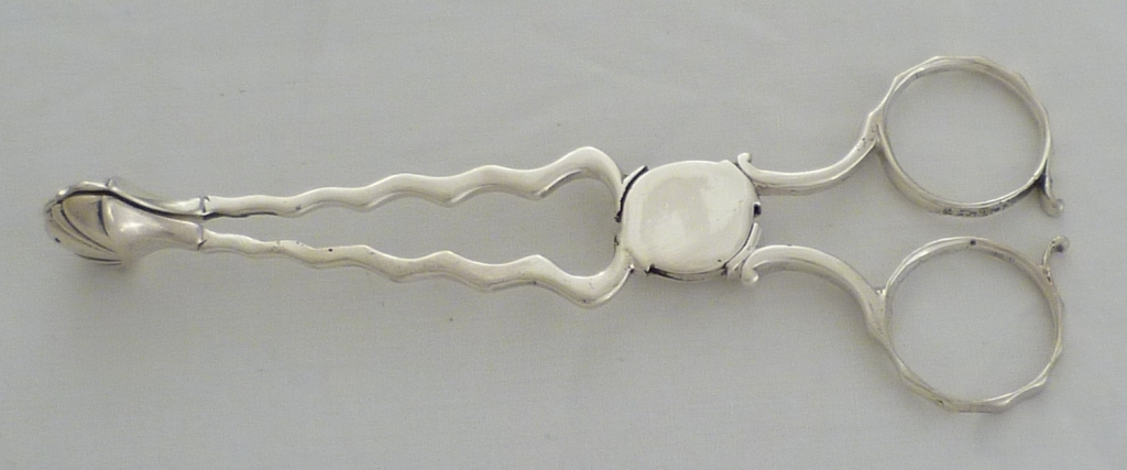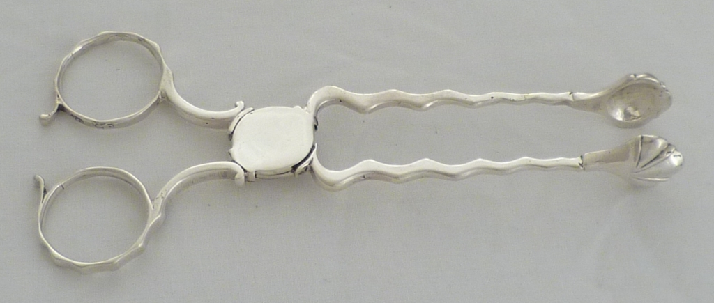 DESCRIPTION | Georgian silver sugar nips or tea tongs with broad trilobe grips, wavy shafts and unusually conforming wavy edge finger rings. |