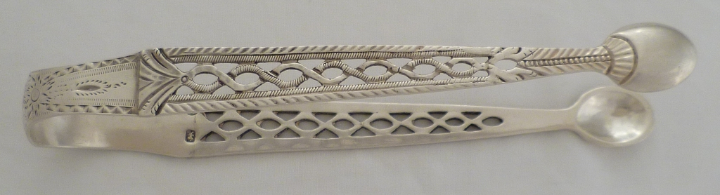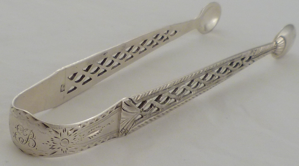 DESCRIPTION | Cast Georgian silver three section sugar tongs with pierced and bright cut engraved decoration and a monogram engraved to the bow. |