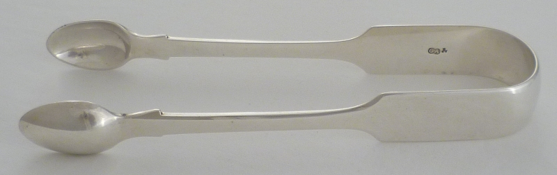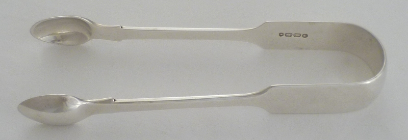 DESCRIPTION | Hefty pair of Victorian silver Fiddle pattern sugar tongs with a monogram engraved to the bow. |