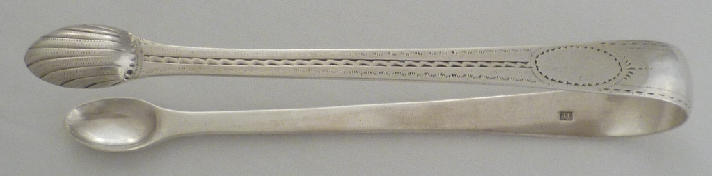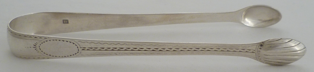 DESCRIPTION | Georgian silver sugar tongs with bright cut engraved decoration, interesting grips and no engraving to the bow. |
