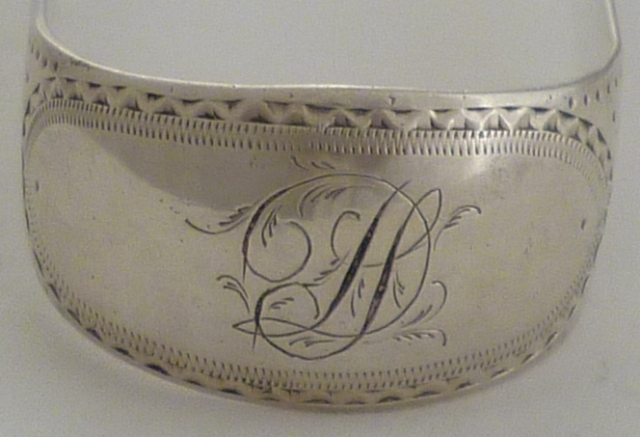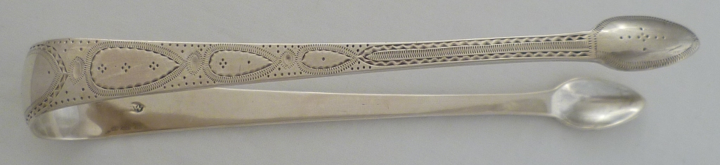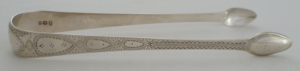 DESCRIPTION | Very pretty pair of Georgian silver sugar tongs with bright cut engraved decoration and a monogram engraved to the bow. |