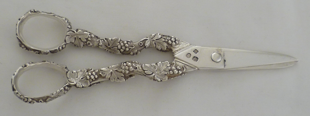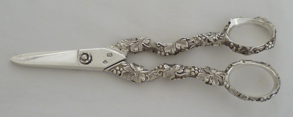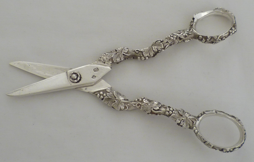 Superb and unusual pair of Georgian silver grape scissors with fruiting vine decorated cast silver arms and a single rose decorated hinge pin head. This is English silver casting at it's absolute peak, gone are the flaws due to