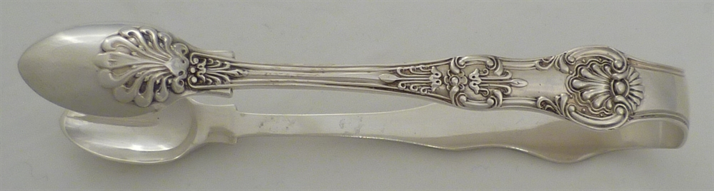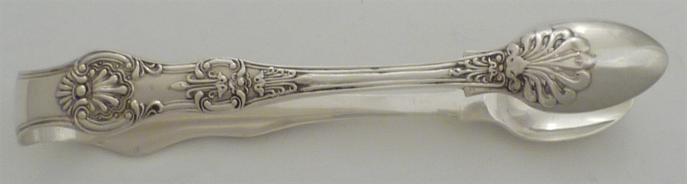 DESCRIPTION | Heavy Victorian silver Queen's pattern sugar tongs with an initial engraving to the bow. |