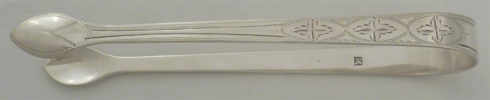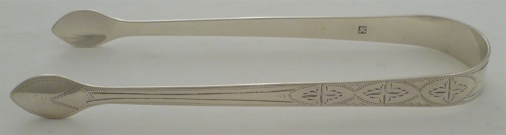 DESCRIPTION | Georgian silver bright cut Old English pattern sugar tongs with a monogram engraving to the bow. |