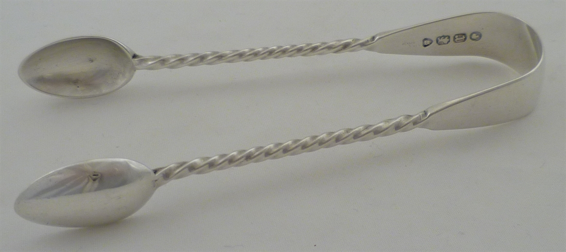 DESCRIPTION | Victorian solid silver sugar tongs with spiral twist arms and no engraving to the bow. |