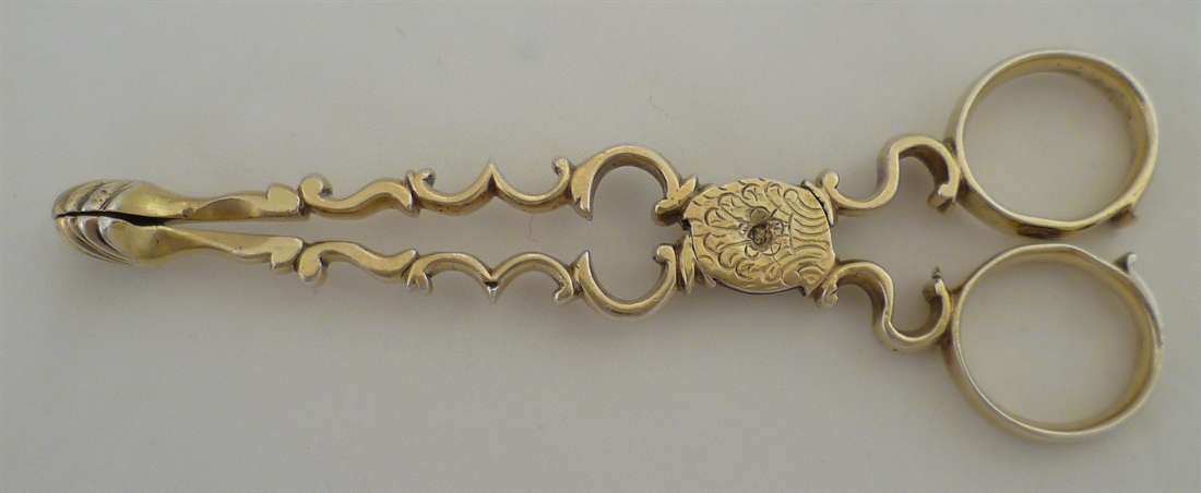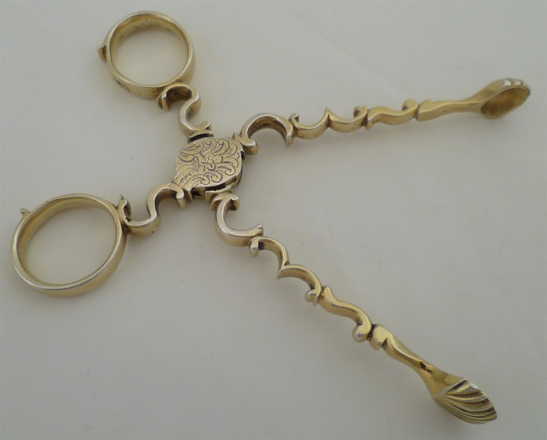 DESCRIPTION | Exceptionally heavy pair of fully gilded Georgian rococo solid silver sugar nips with decorative engraving to the box hinge and multi-lobe grips. |