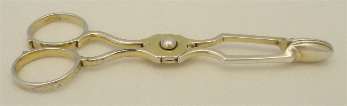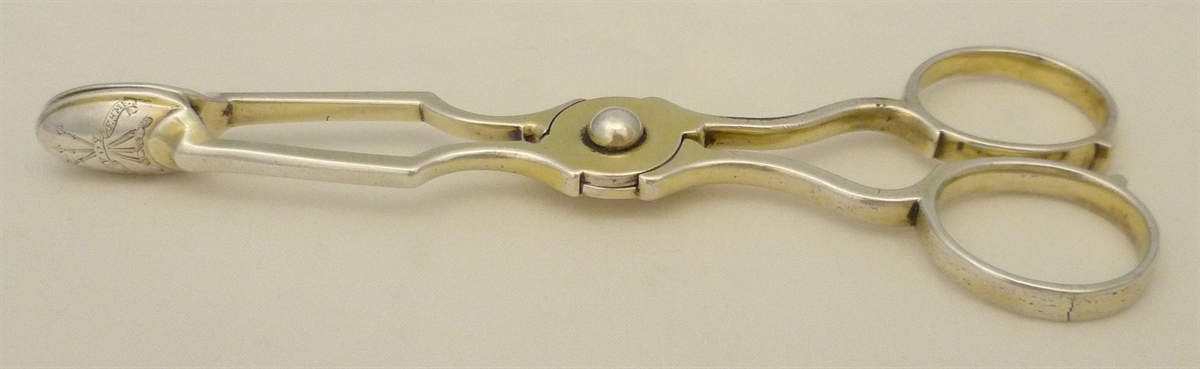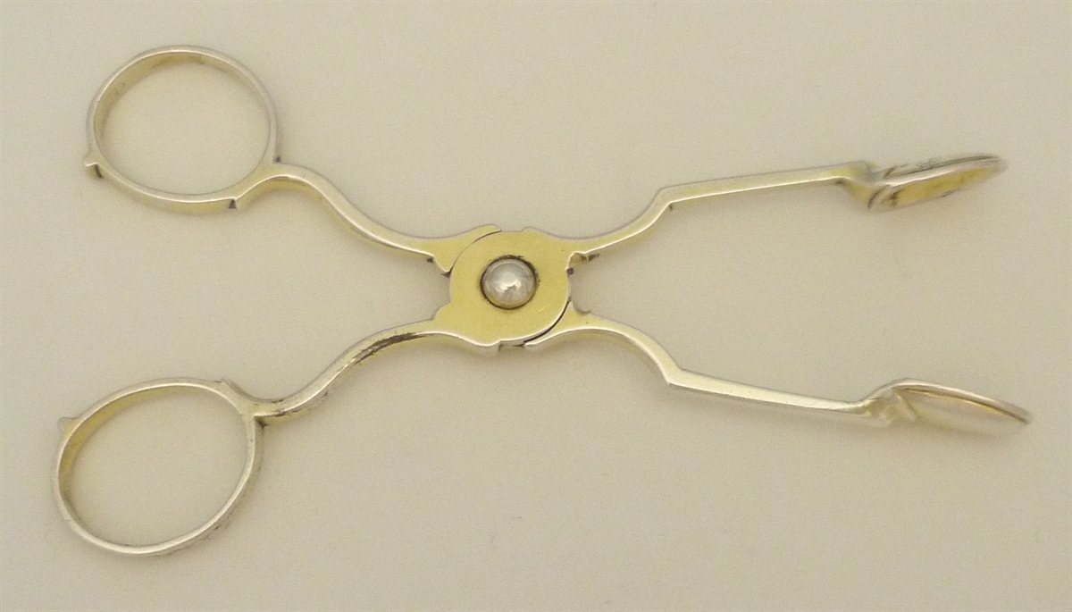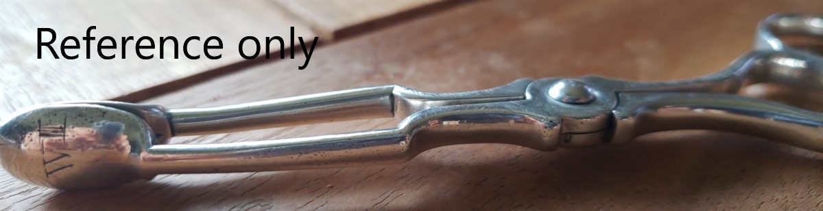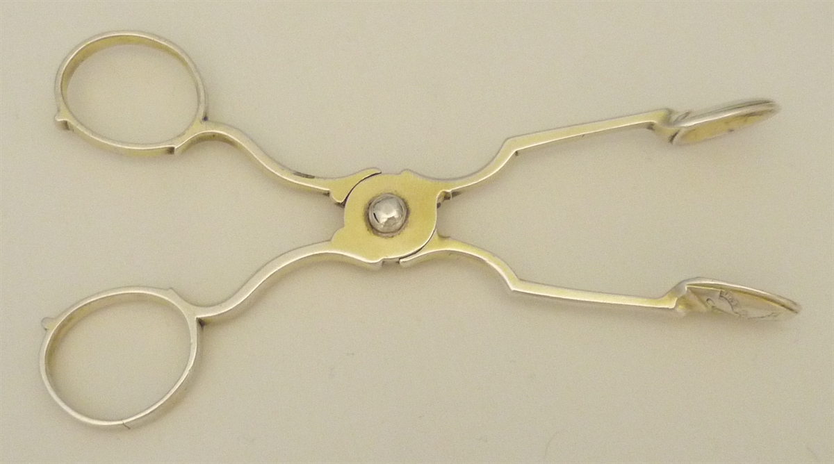 DESCRIPTION | Solid cast silver gilt sugar nips with an unusual bull's eye box hinge and a crest and motto engraving to one of the spoon shaped grips. Motto 'UNE FOY MESME' if for the Gilpin family and translates to 'one and the same faith'. The last three images, all with the brown wood background, are of a very similar pair of nips that are marked by one of the most prolific makers of this period. |