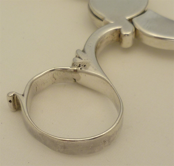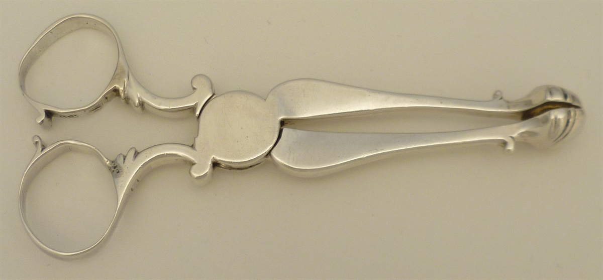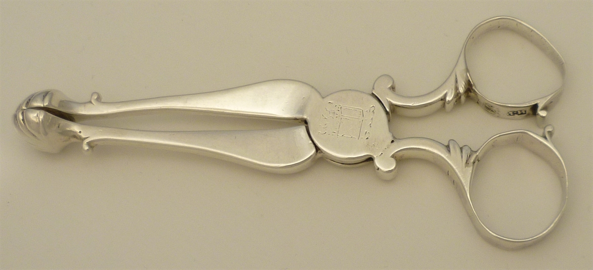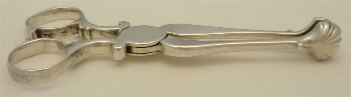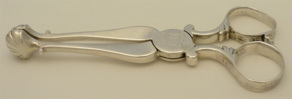 DESCRIPTION | Exceptionally heavy English Georgian cast solid sterling silver sugar nips with stout shafts, four lobed shell grips and a crest engraving to the large box hinge. |