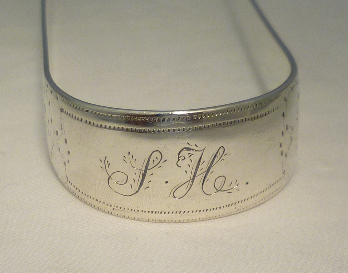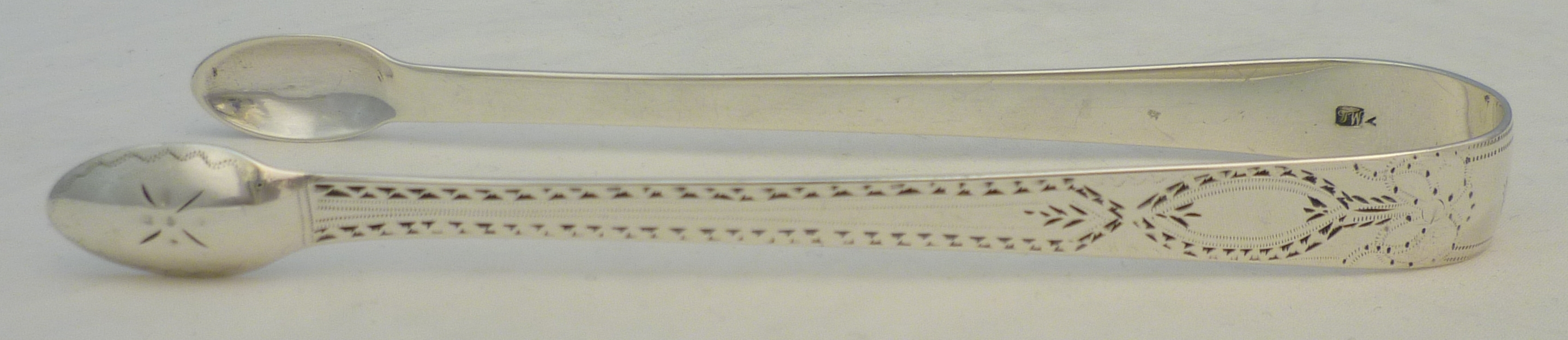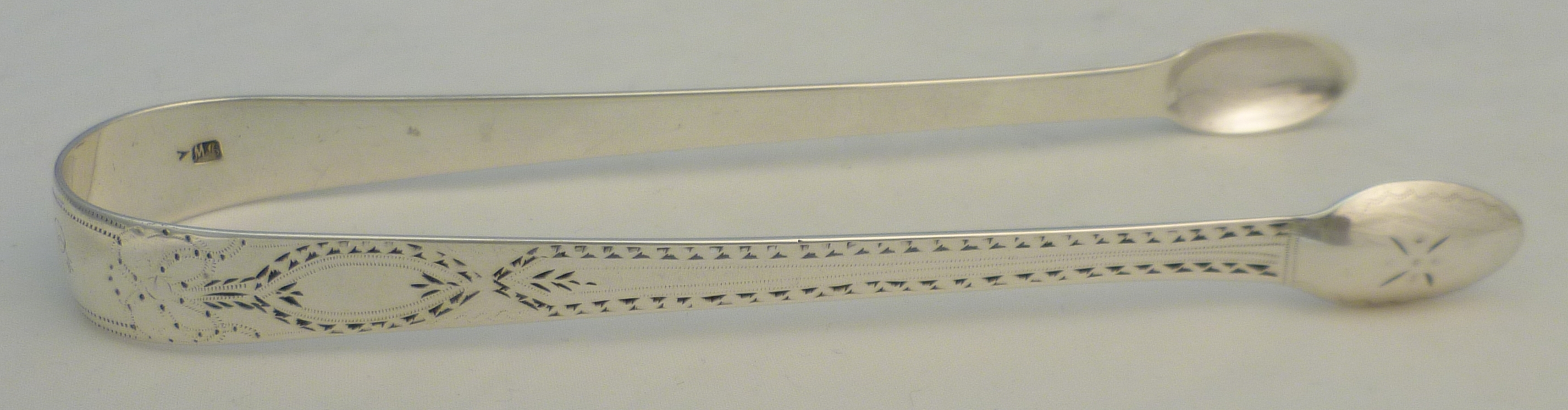 DESCRIPTION | English Georgian solid sterling silver bright cut Old English pattern sugar tongs with a monogram engraving to the bow. |