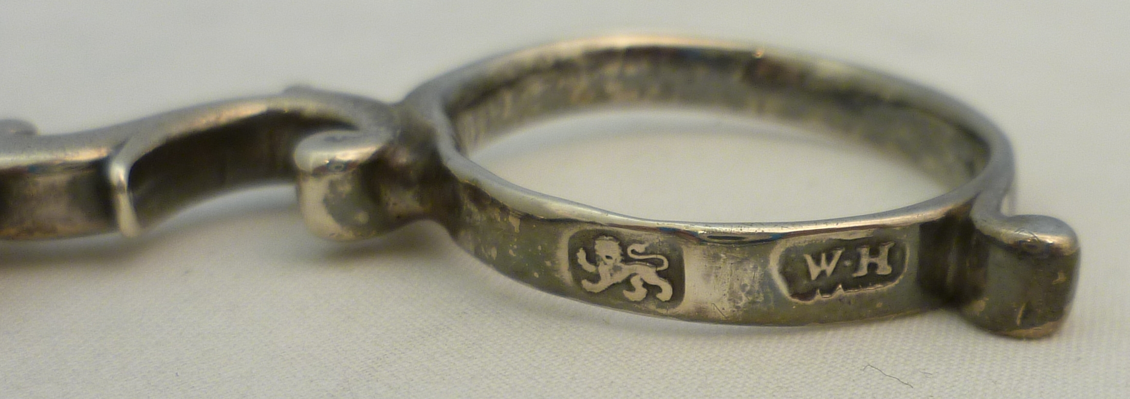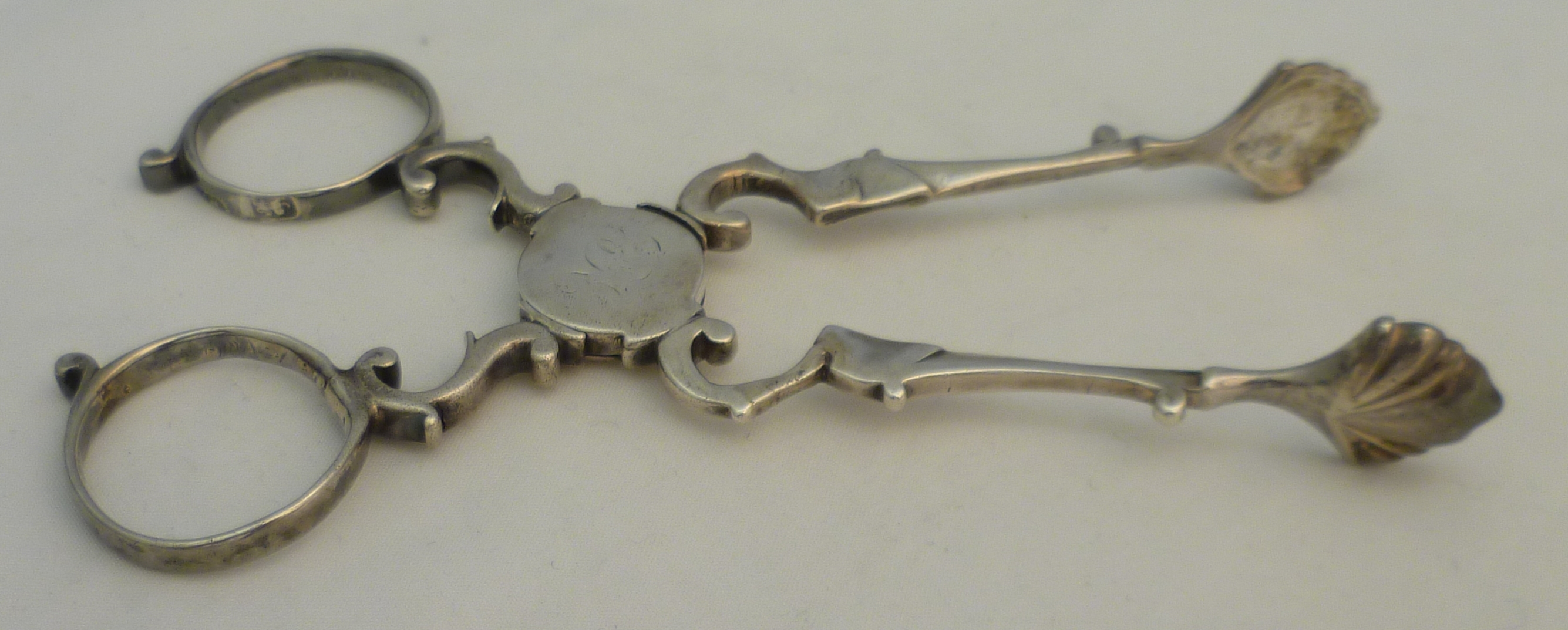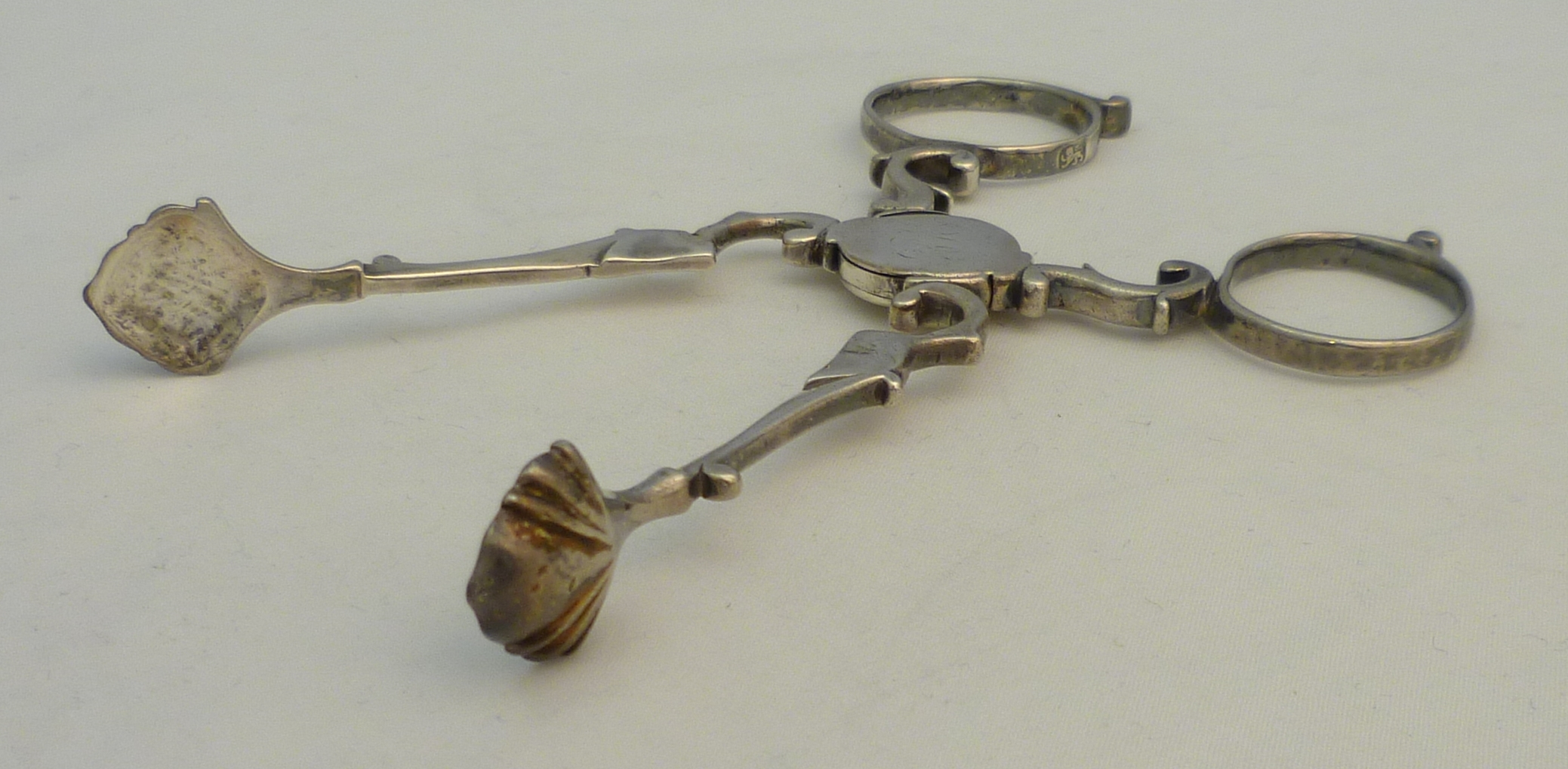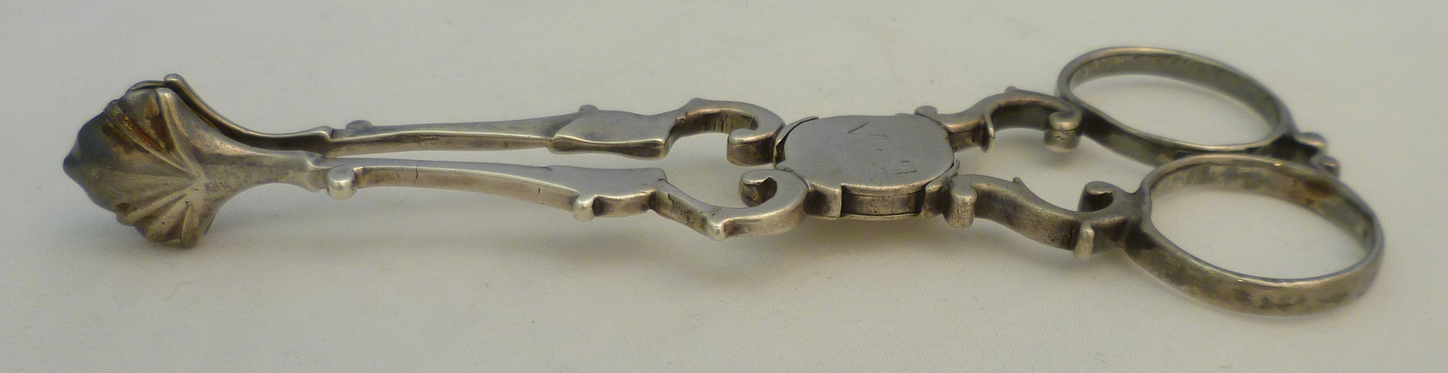 DESCRIPTION | Good pair of English Georgian solid sterling silver sugar nips or tea tongs with pointed trilobe grips, the original initial engraving to one side of the large box hinge and a slightly (perhaps 30 years) later monogram engraving to the other. Both finger rings have unusually well struck and clear hallmarks. |