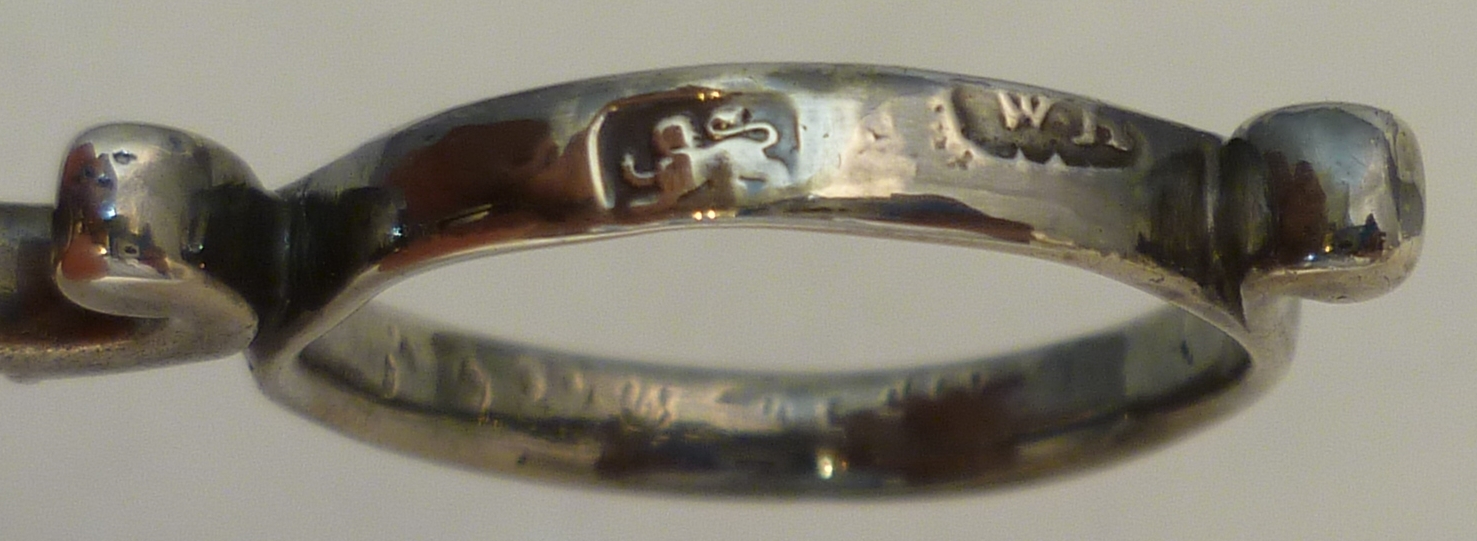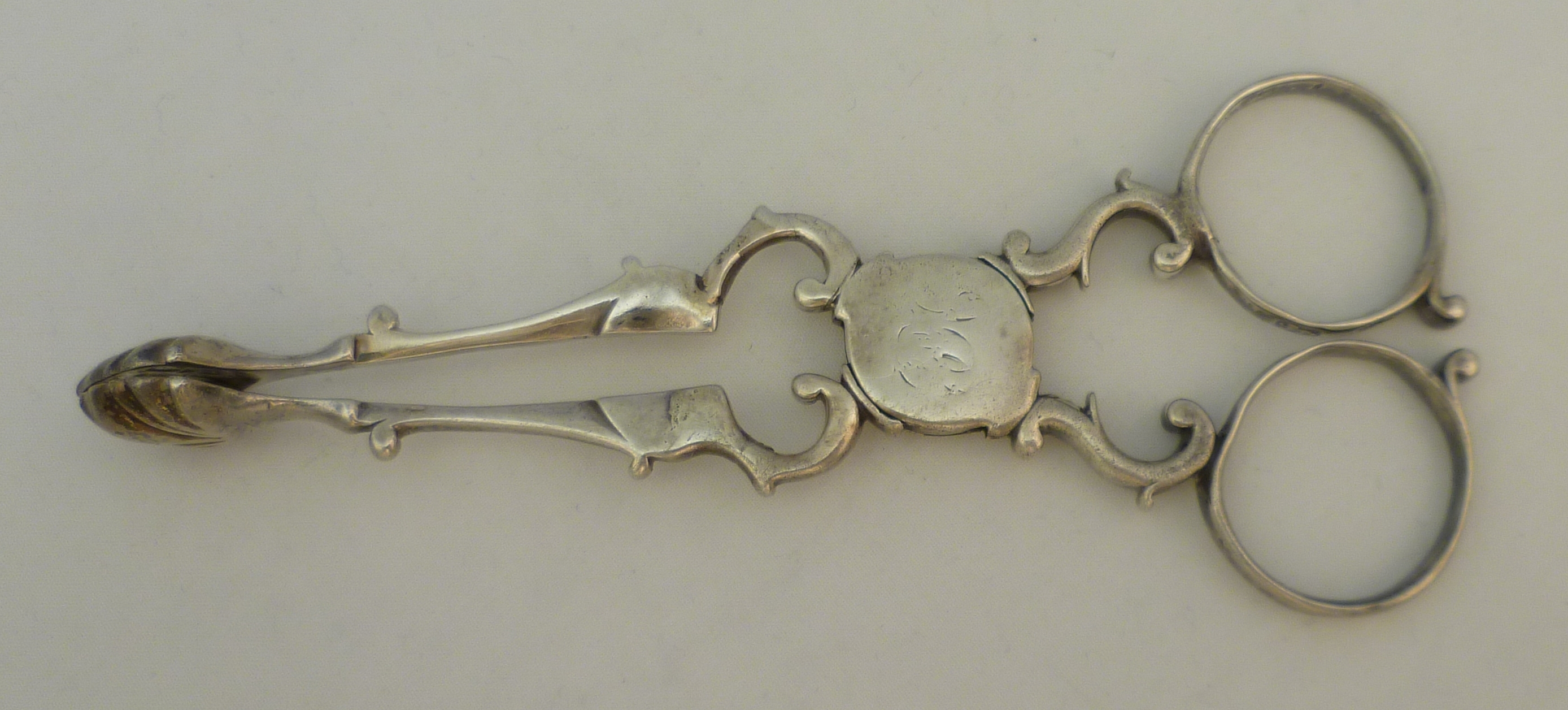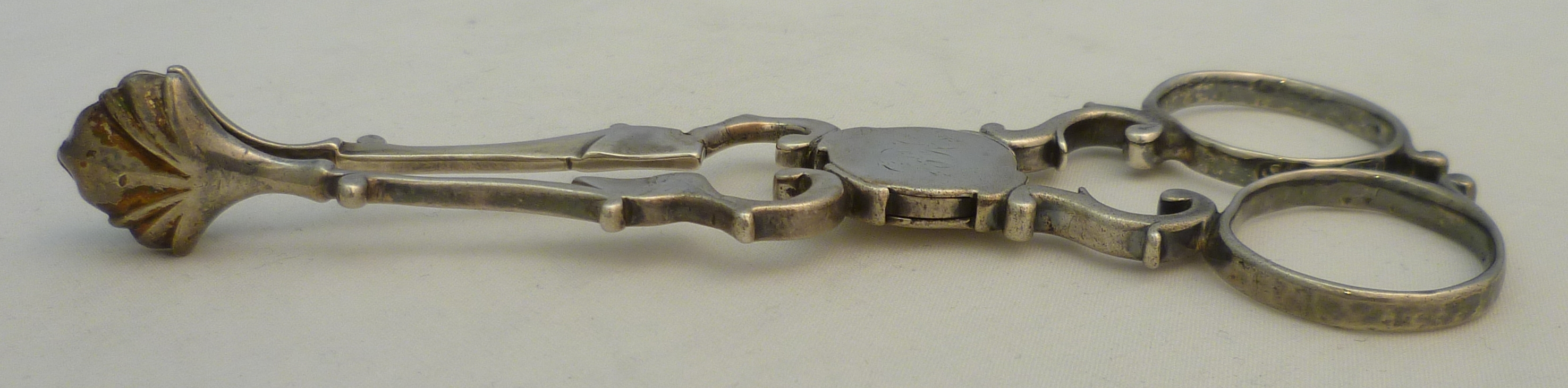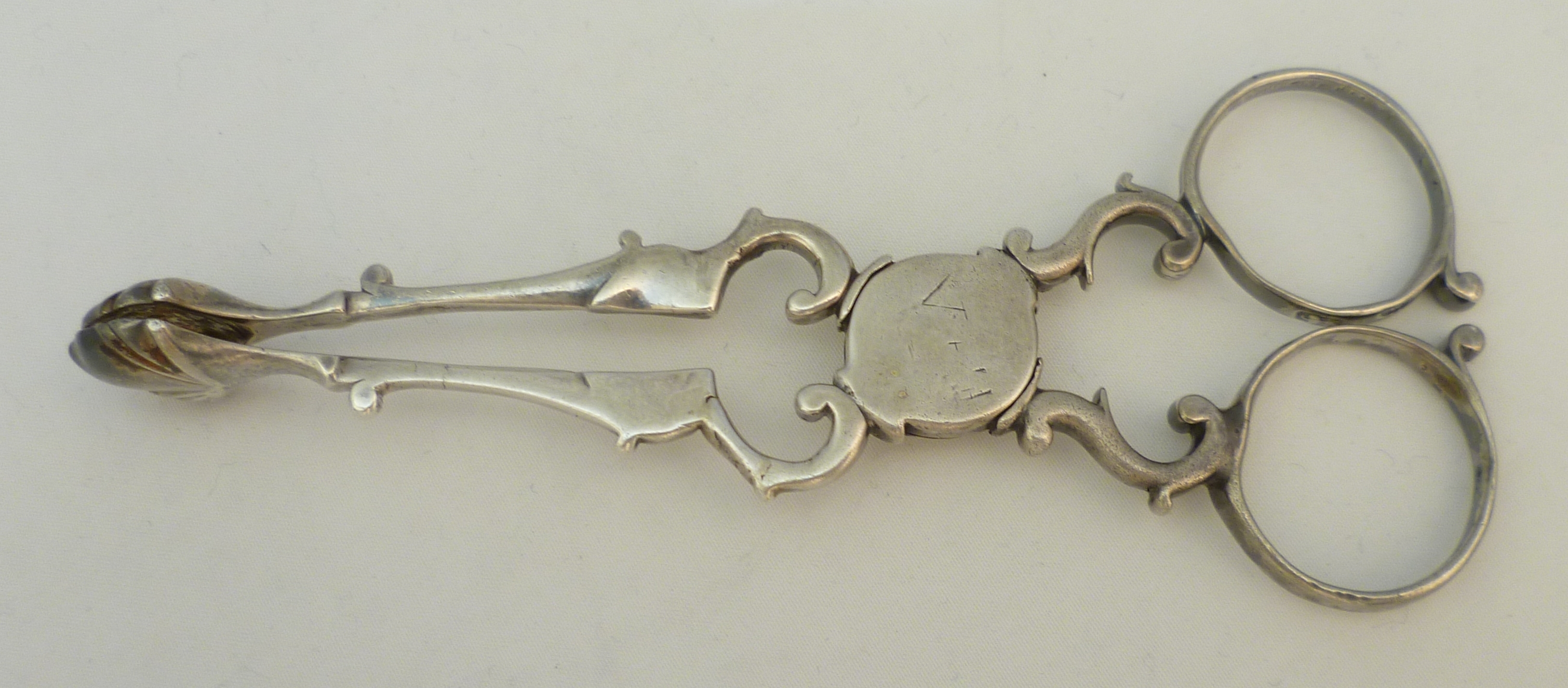 DESCRIPTION | Good pair of English Georgian solid sterling silver sugar nips or tea tongs with pointed trilobe grips, the original initial engraving to one side of the large box hinge and a slightly (perhaps 30 years) later monogram engraving to the other. Both finger rings have unusually well struck and clear hallmarks. |