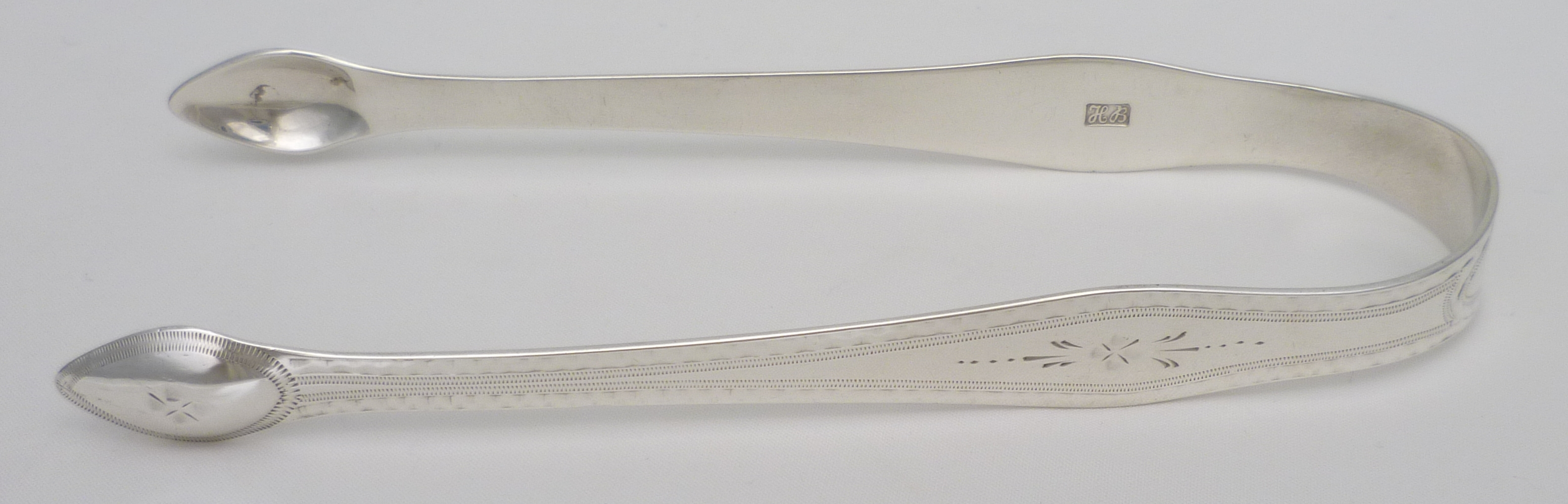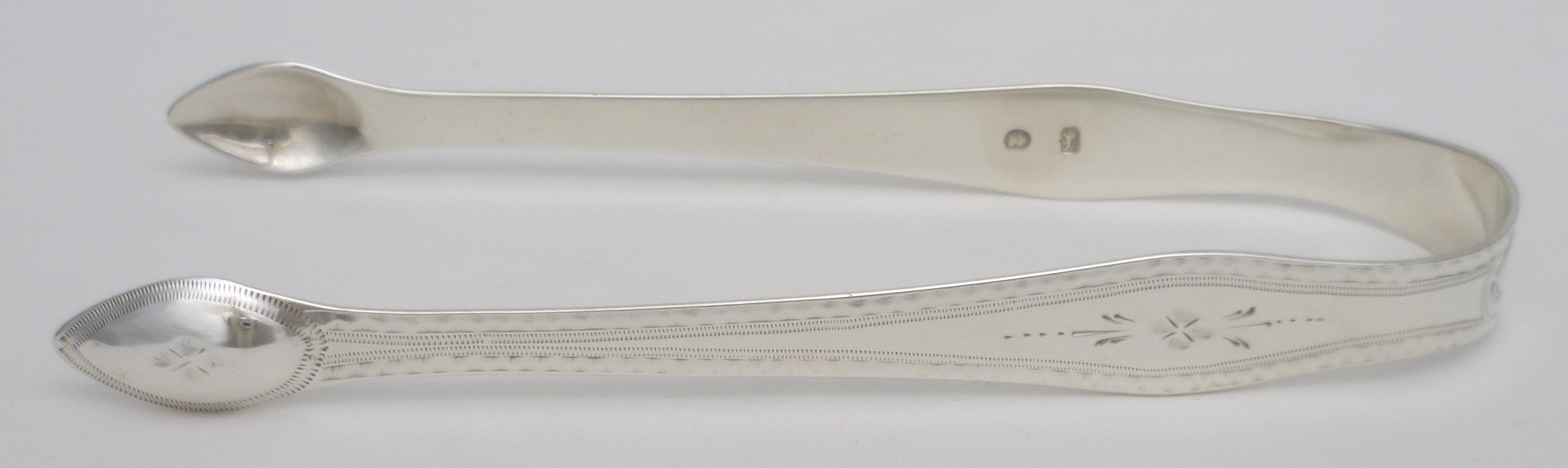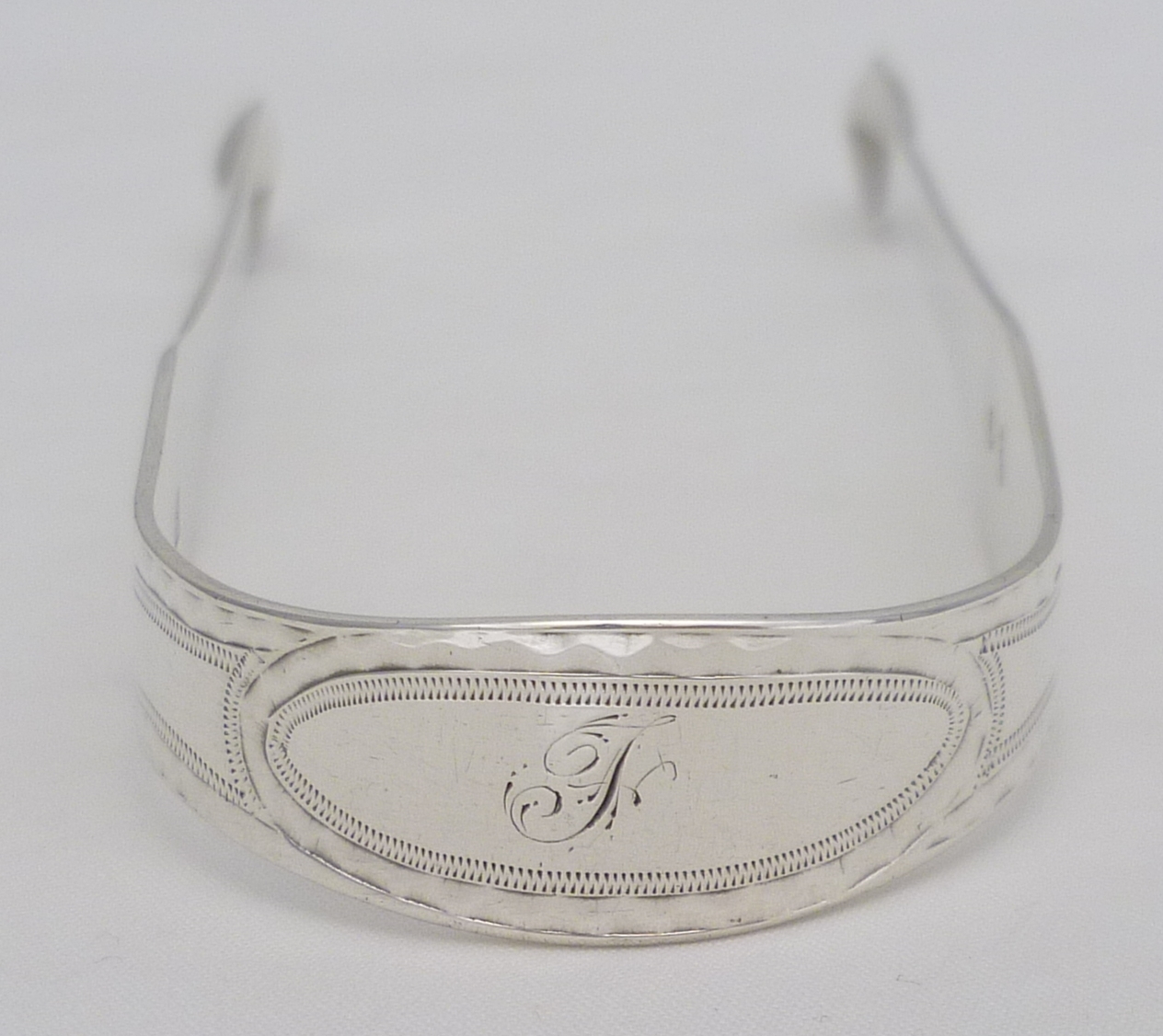 DESCRIPTION | Superb pair of antique English Georgian solid sterling silver Bright-cut Old English pattern sugar tongs with an initial engraving to the bow. |