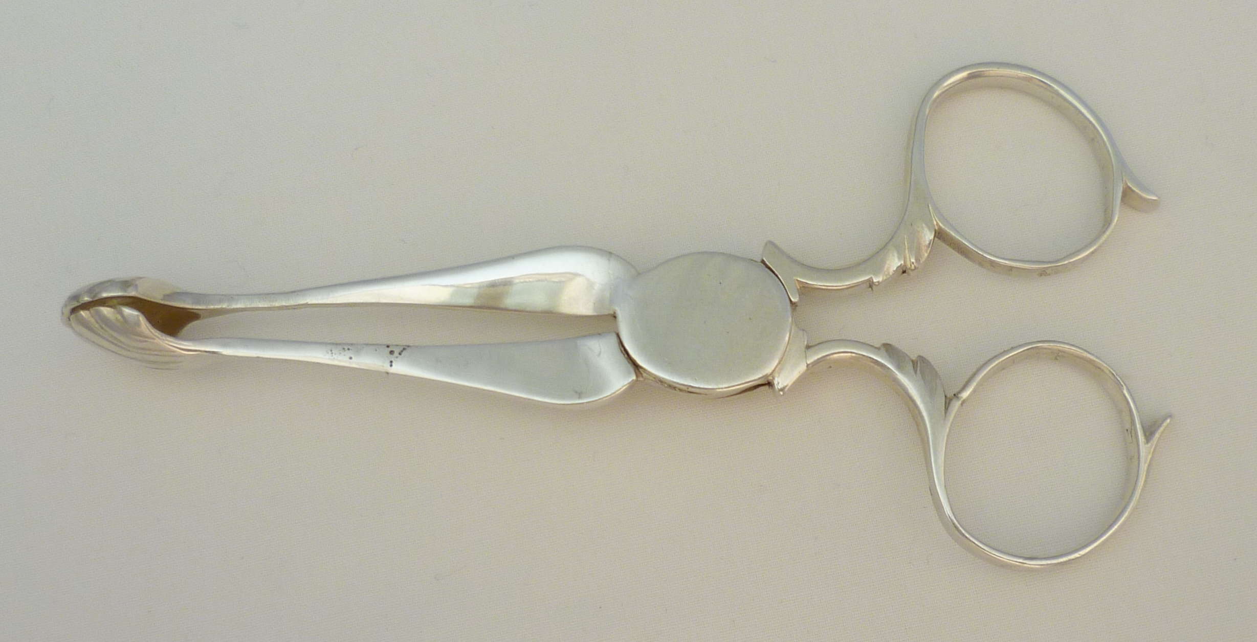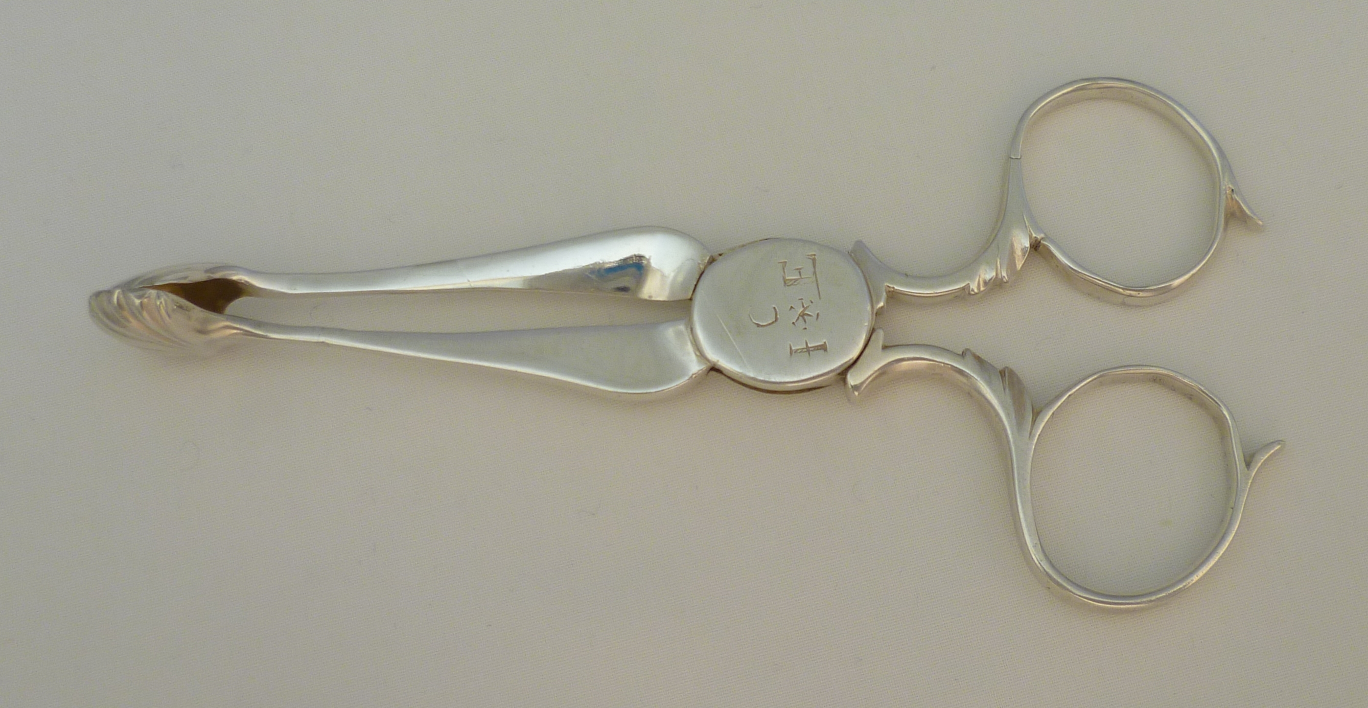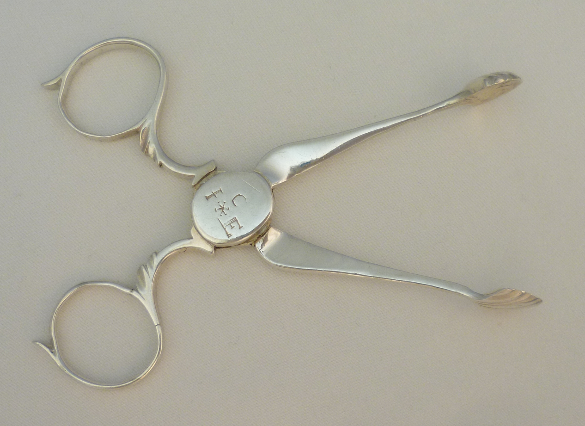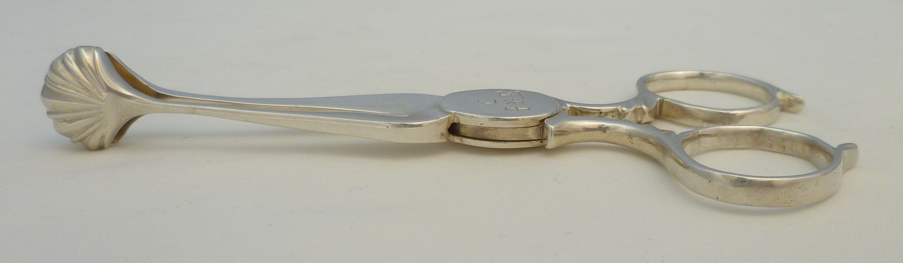DESCRIPTION | Pair of English Georgian cast solid sterling silver sugar nips or tea tongs with the original engraving 'C over I * E' to the box hinge, five lobe grips and tapering chamfered shafts. A robust pair still fit for action today. |