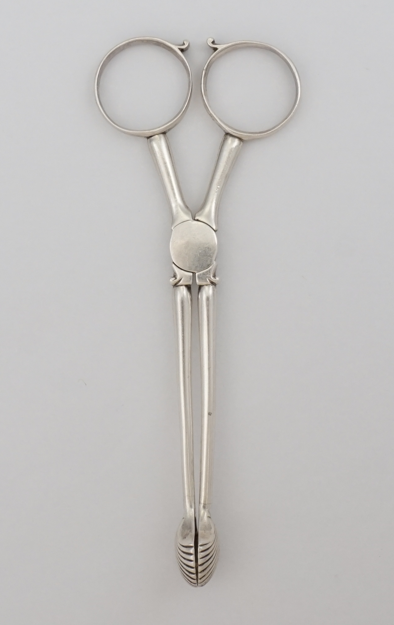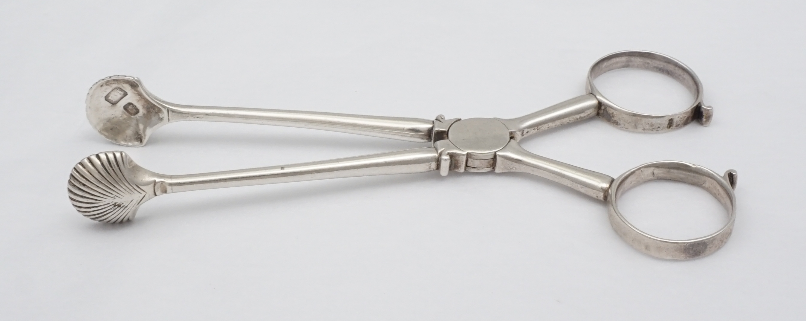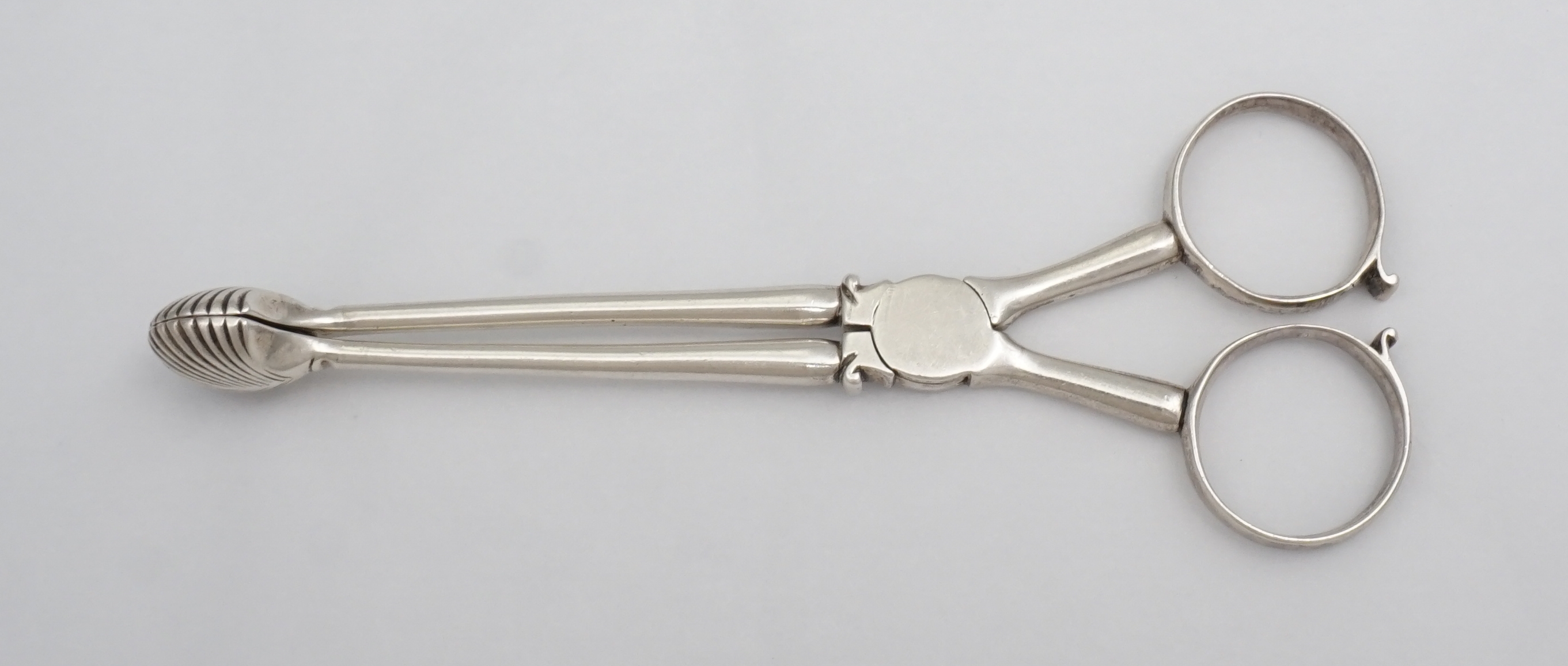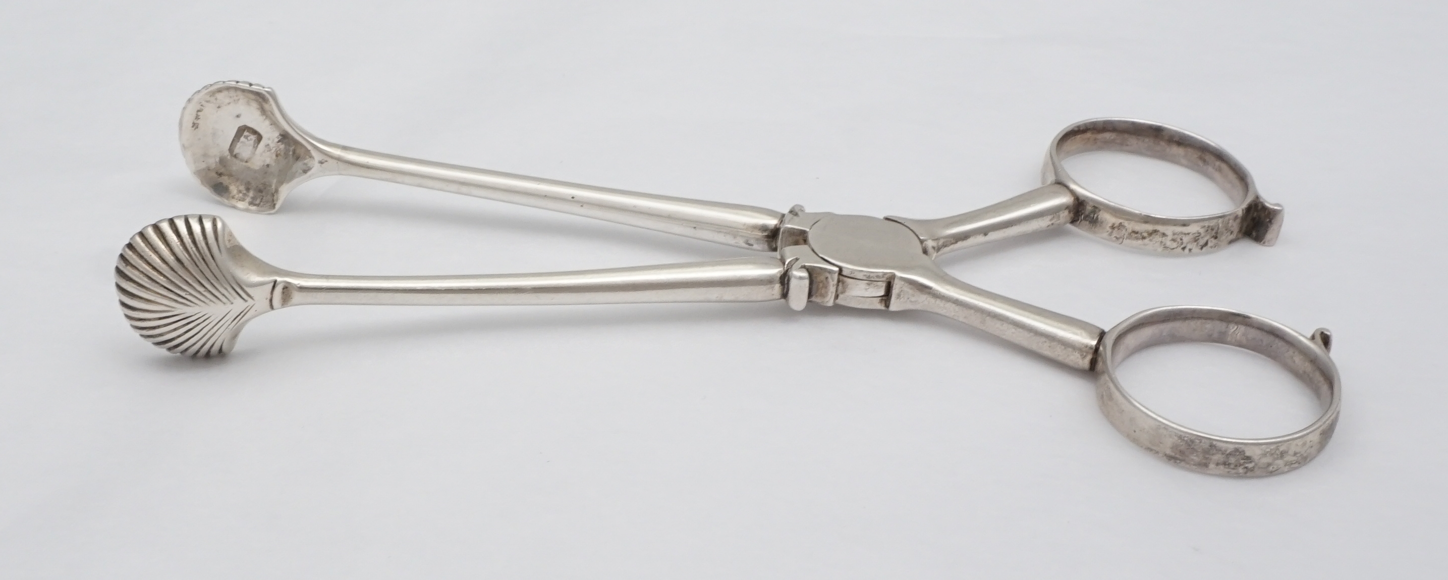 DESCRIPTION | Pair of antique English Georgian solid sterling silver sugar nips or tea tongs in astonishingly good original condition. Round finger rings, plain arms and shafts, sweet little box hinge and the rare chevron scallop grips. Stylistically more 1720s than 1730s except for the little round hinge that brings us into the 1730s. I have seen and handled thousands of Georgian sugar nips and concluded long ago that we must accept wear, damage and/or repairs due to their fragile design and construction using brittle cast silver. Here I am proved wrong. I can find no damage or repairs, the hinge action is still excellent and the hinge box has never been engraved or erased. This pair is just as Francis made them back in the early 1730s. Take a moment, enjoy looking at them, for you will never see their like again. |