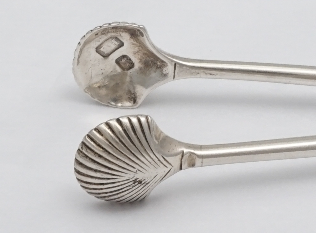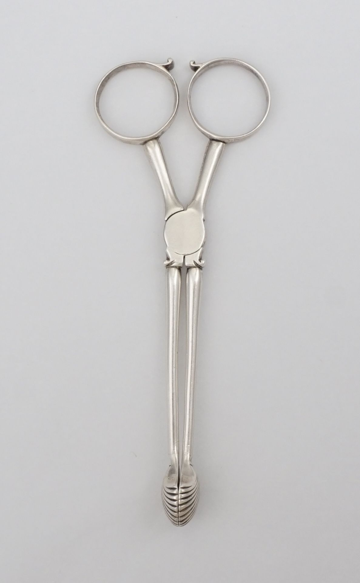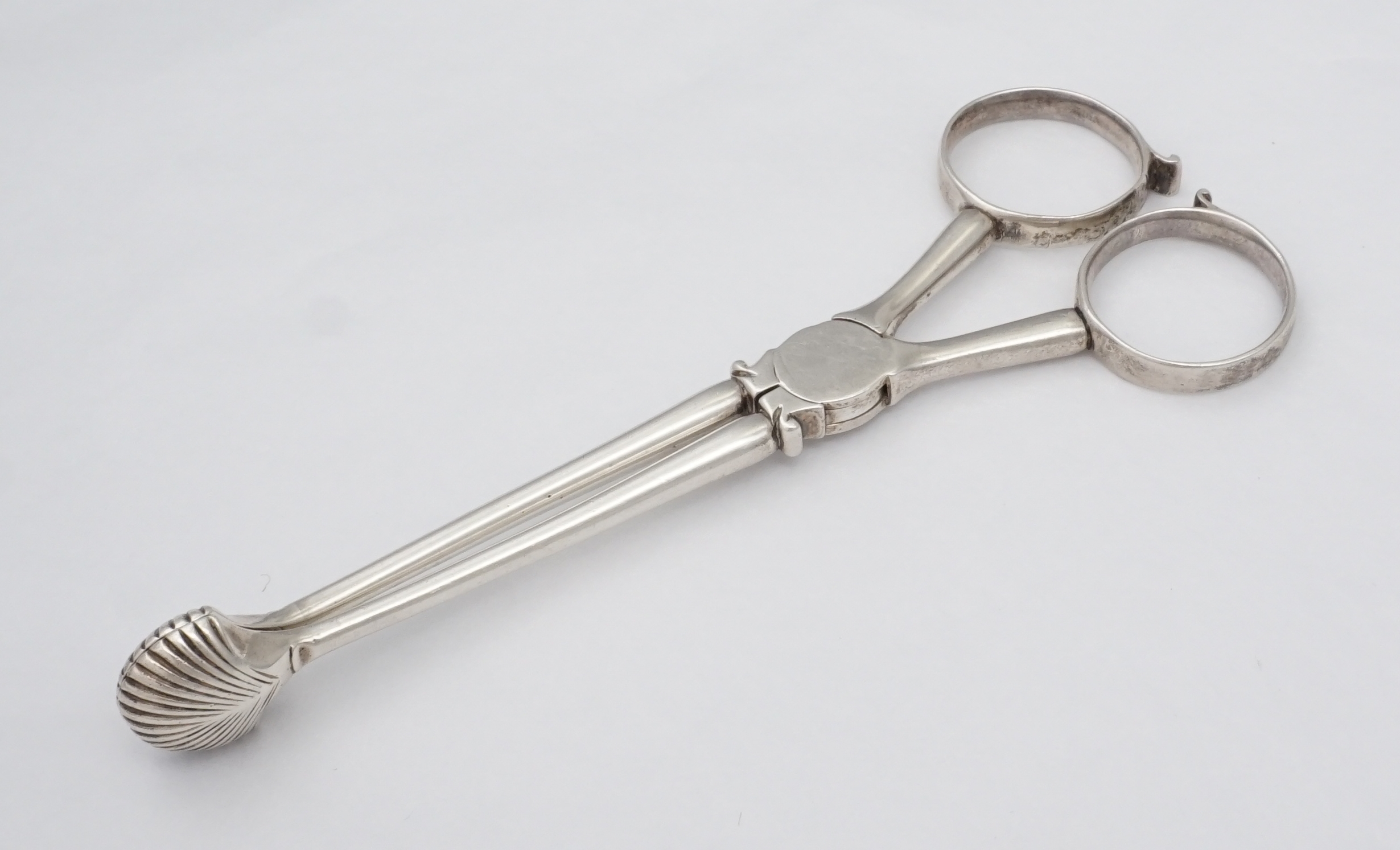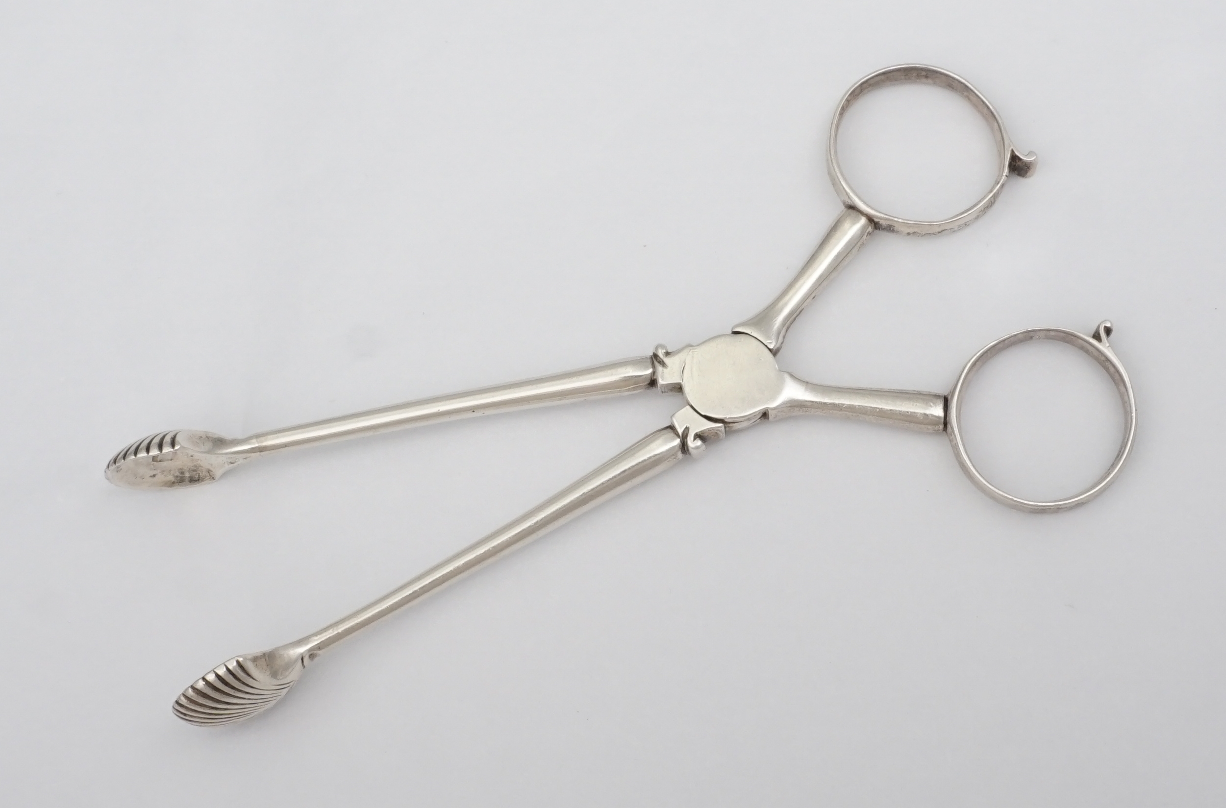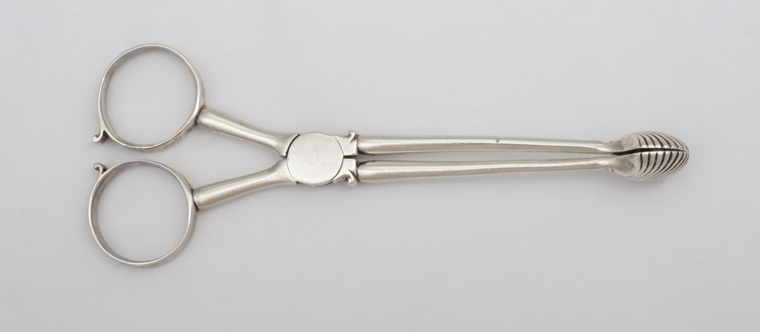 DESCRIPTION | Pair of antique English Georgian solid sterling silver sugar nips or tea tongs in astonishingly good original condition. Round finger rings, plain arms and shafts, sweet little box hinge and the rare chevron scallop grips. Stylistically more 1720s than 1730s except for the little round hinge that brings us into the 1730s. I have seen and handled thousands of Georgian sugar nips and concluded long ago that we must accept wear, damage and/or repairs due to their fragile design and construction using brittle cast silver. Here I am proved wrong. I can find no damage or repairs, the hinge action is still excellent and the hinge box has never been engraved or erased. This pair is just as Francis made them back in the early 1730s. Take a moment, enjoy looking at them, for you will never see their like again. |