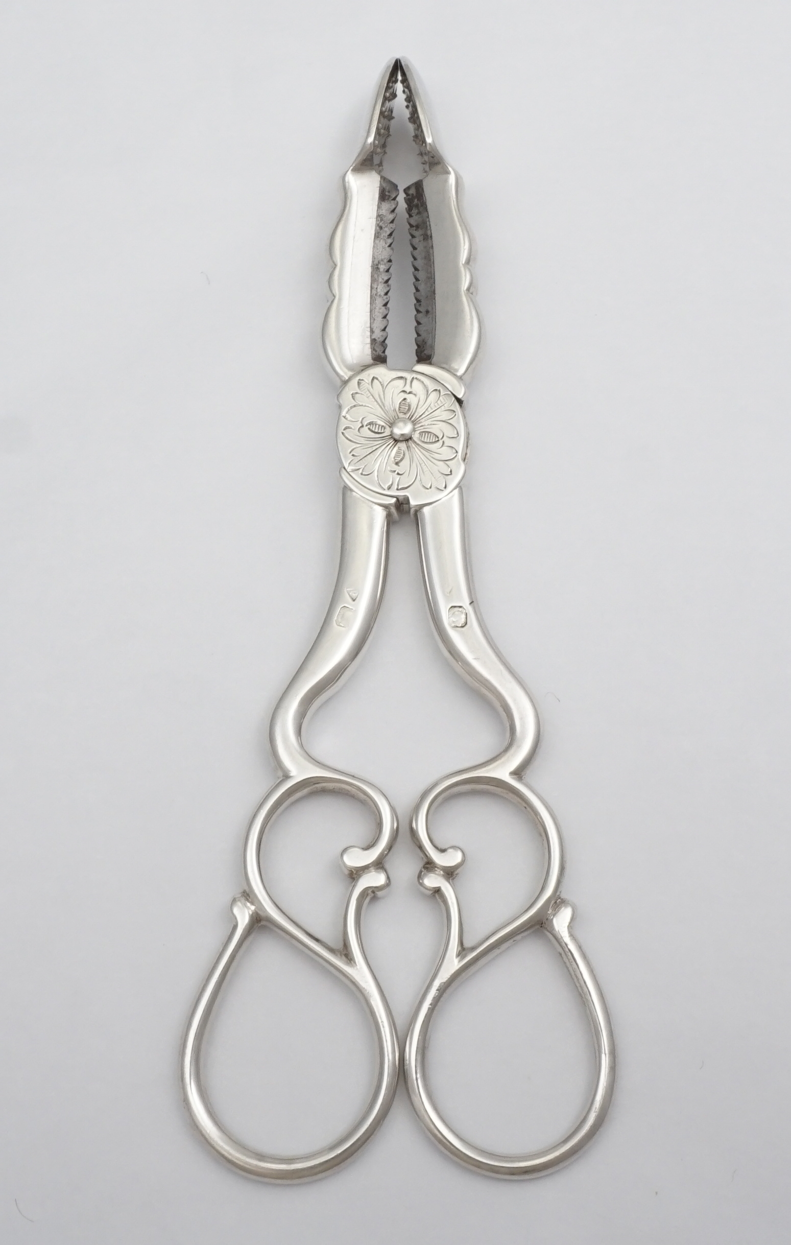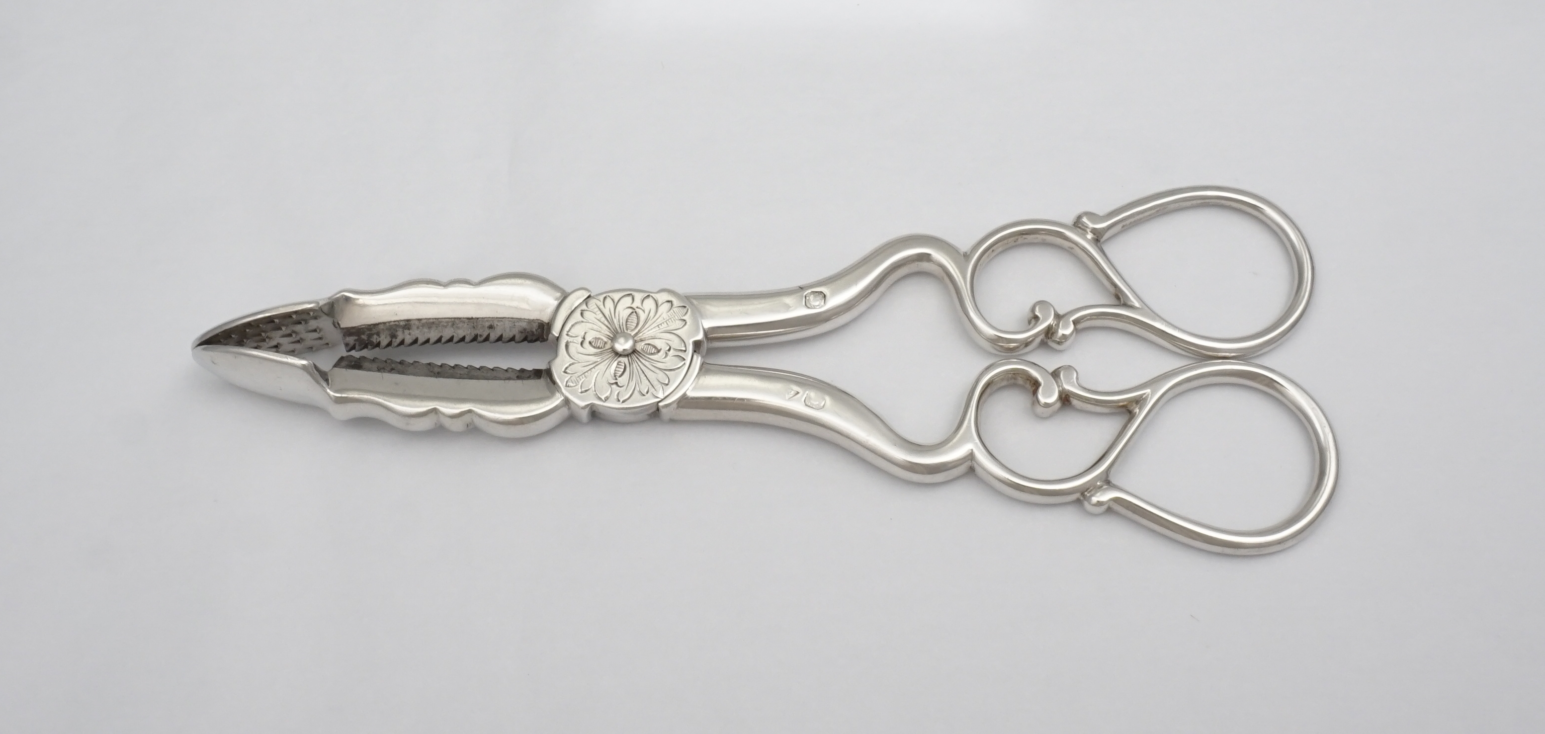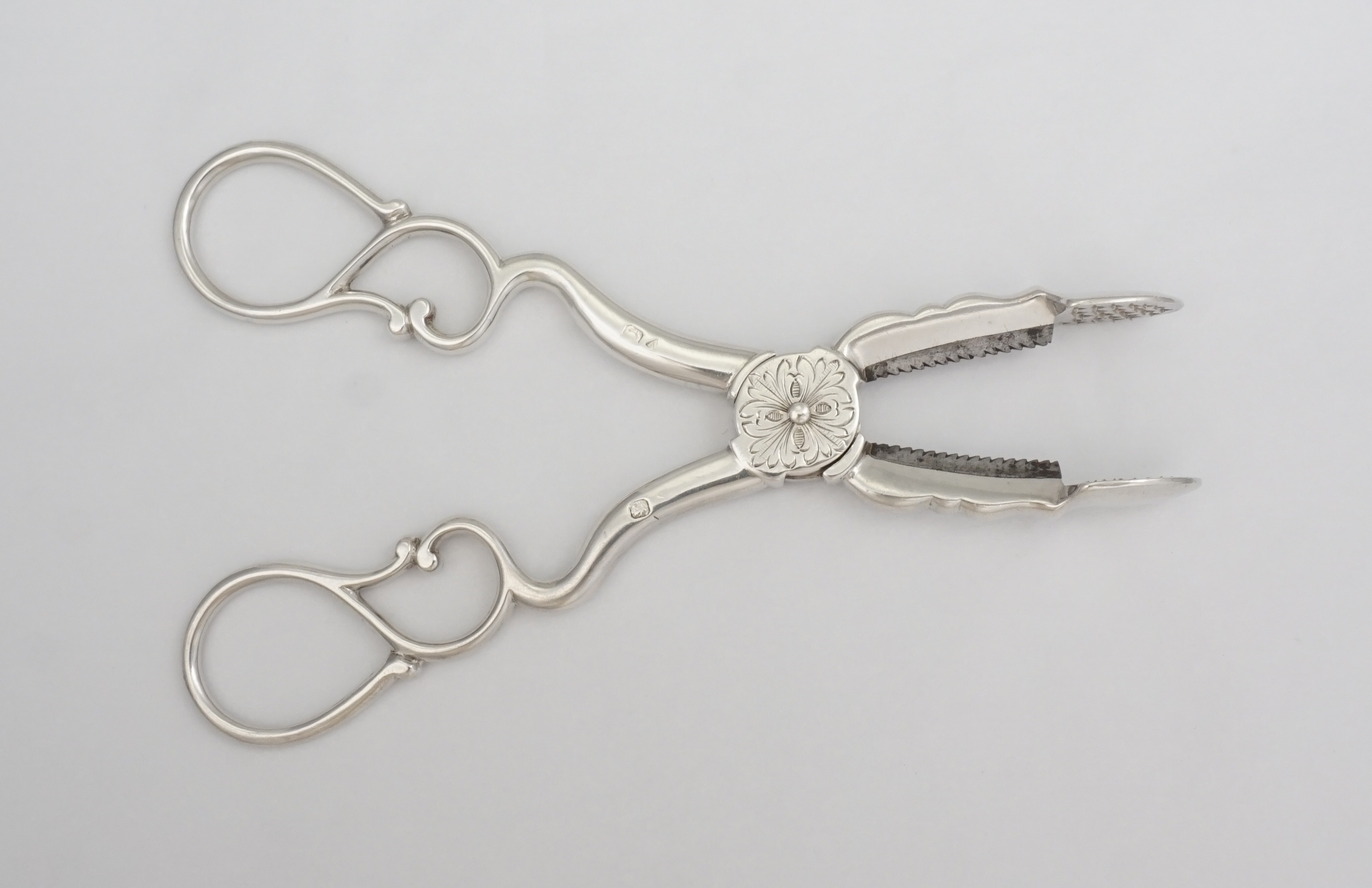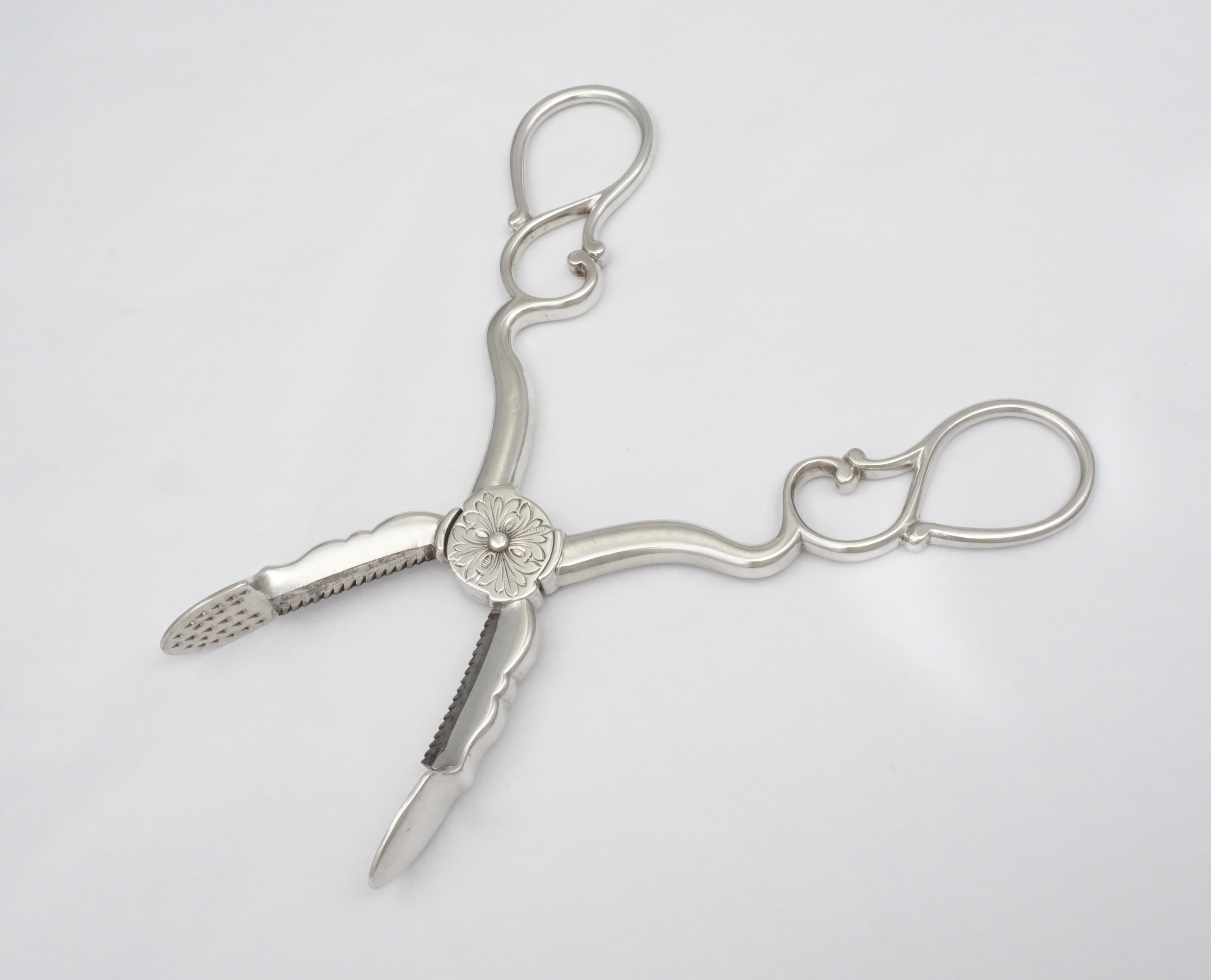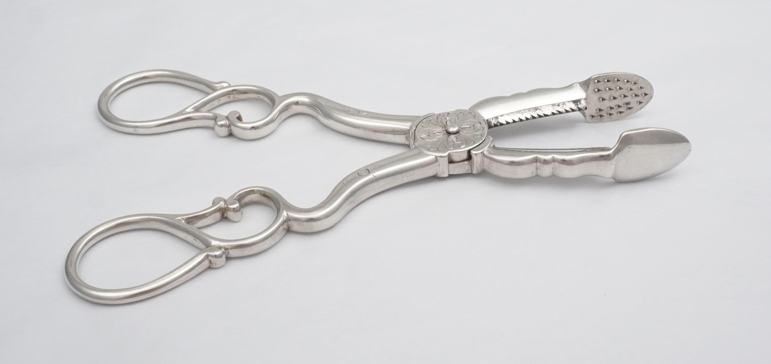 DESCRIPTION | Heavy duty pair of antique French 19th century solid high grade silver sugar nippers cum tongs with inset steel cutting teeth and a floral engraving to the hinge box. Up until around 1900 sugar came in a cone-shaped loaf that was rather hard. Special steel nippers or a mallet and chisel were used to first break up the loaf. Once smashed into suitable chunks the sugar would be placed into a sugar box and transferred to the dining or drawing room. These nippers would then be used to further trim the sugar and transfer it to you cup, pot or jug. |