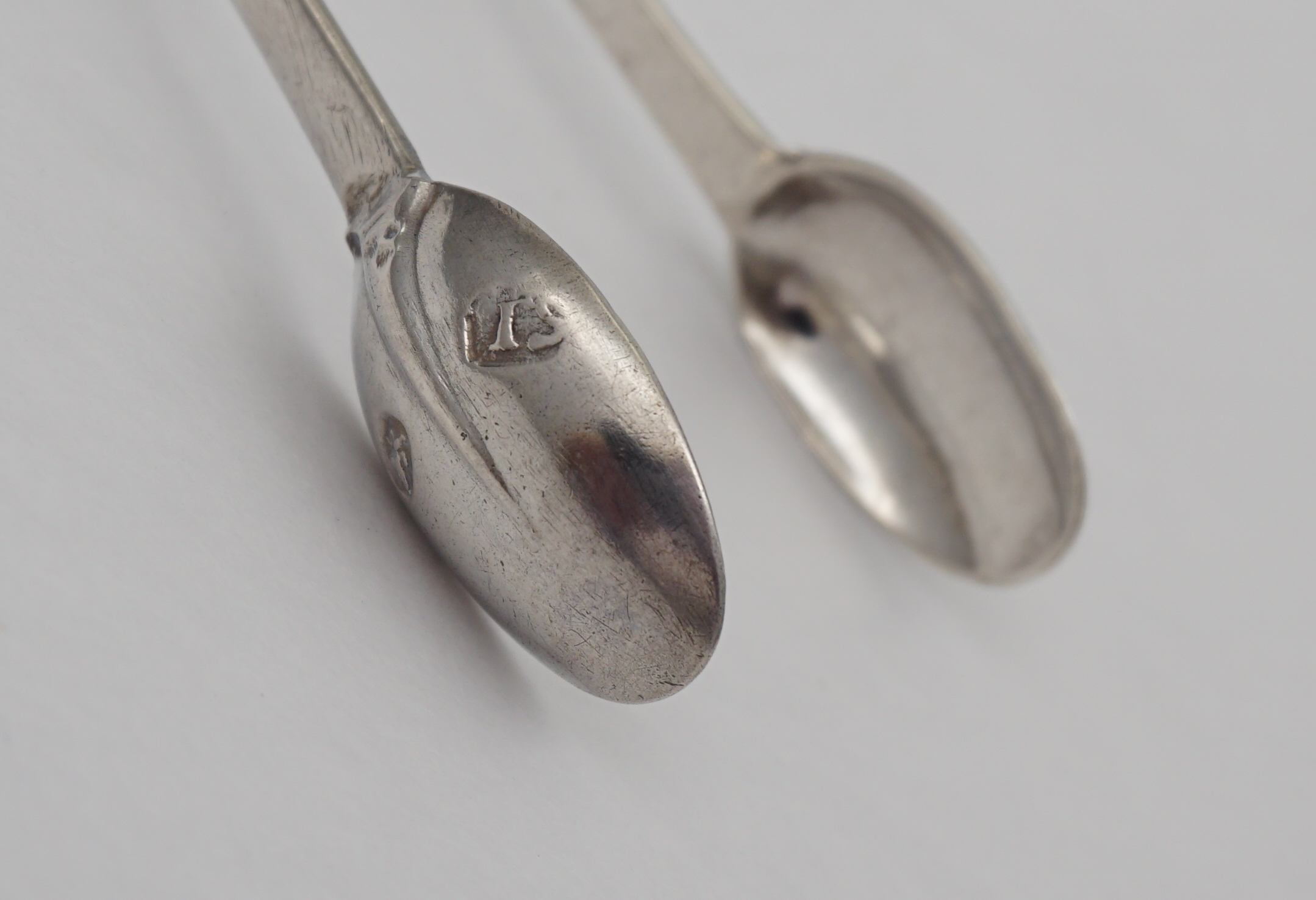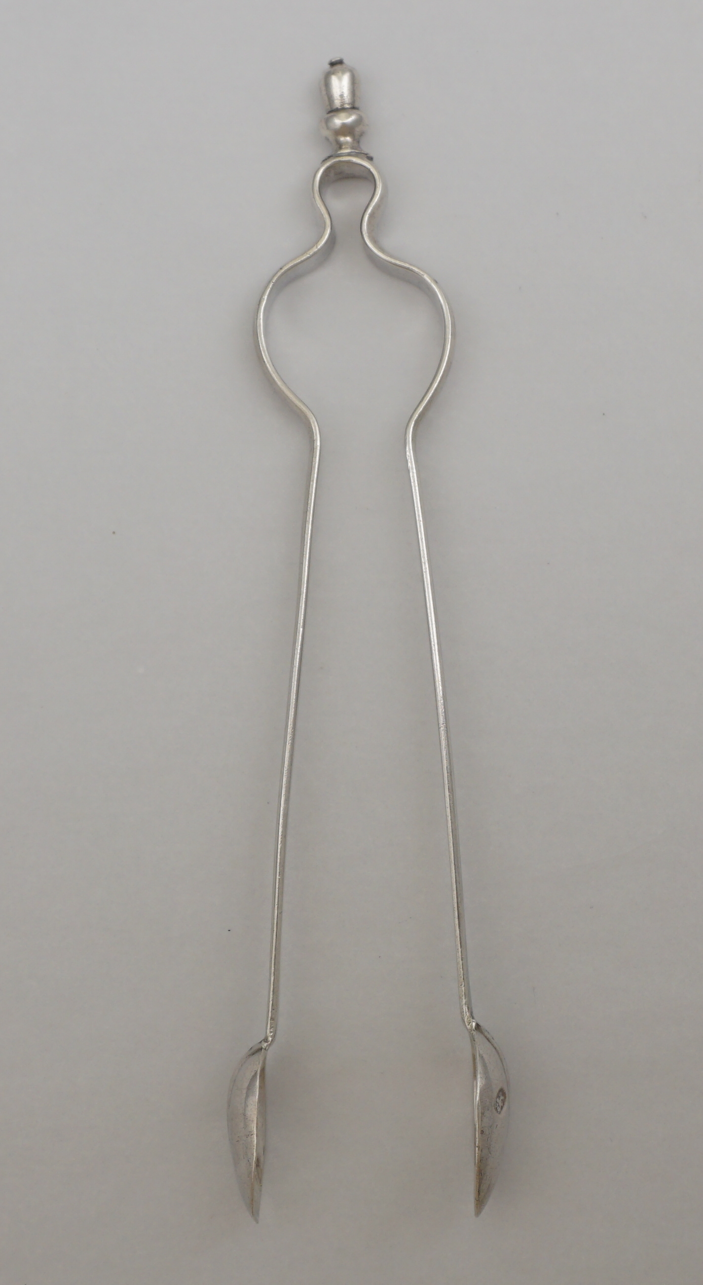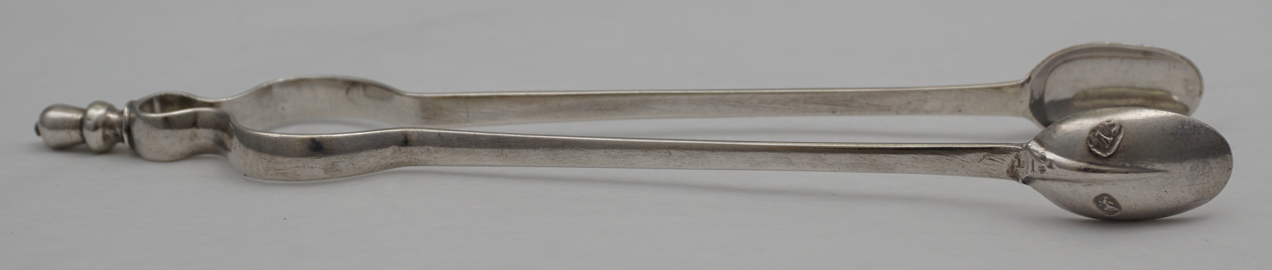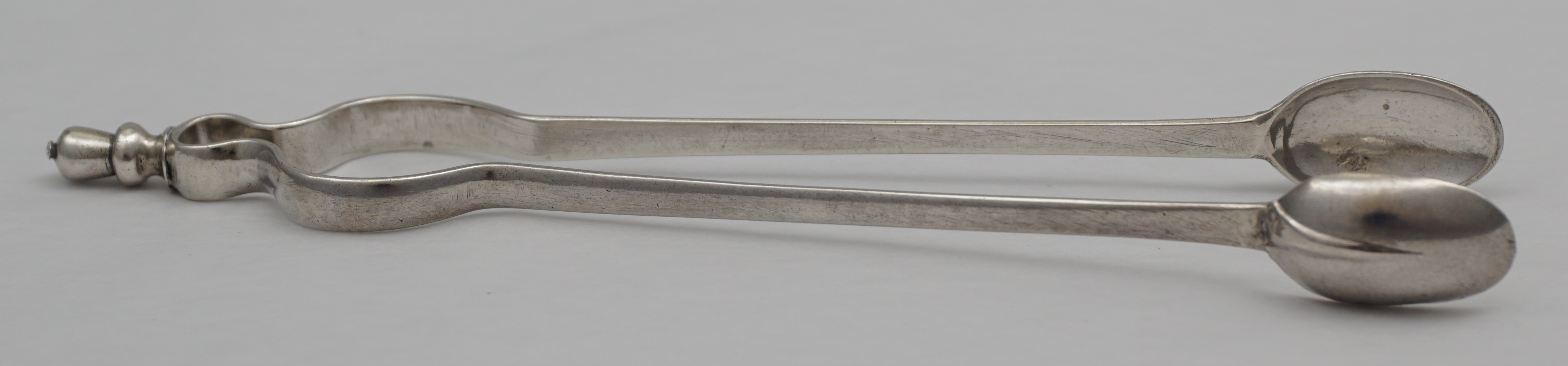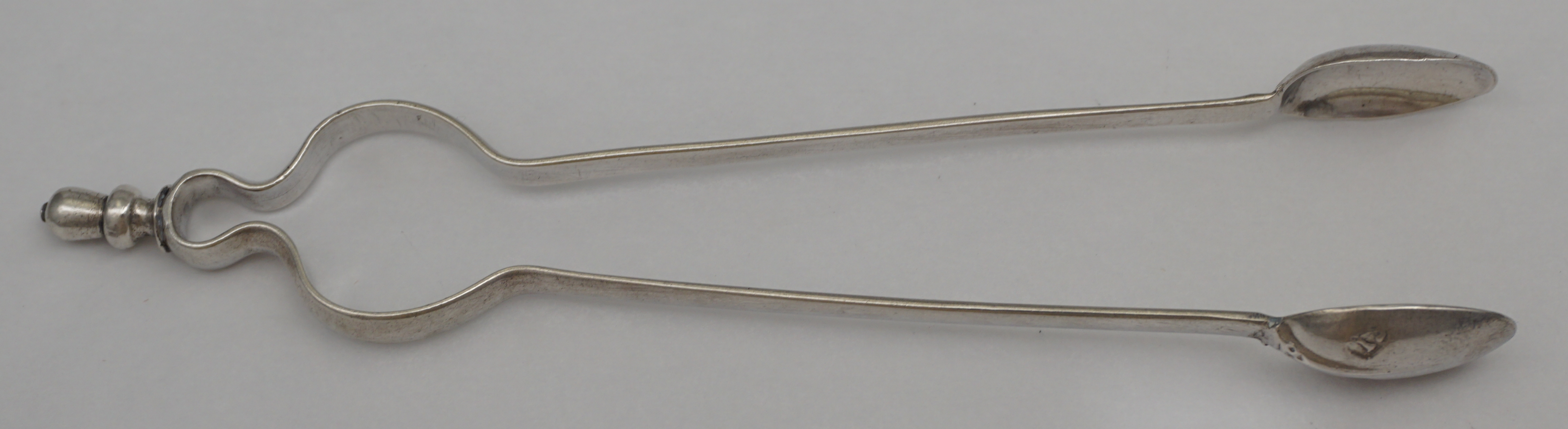 DESCRIPTION | Extremely scarce pair of antique provincial English George I solid sterling silver sugar tongs of andiron (fire tong) form with rat tail spoon bowl grips conforming to other flatware of the period and a baluster finial. |