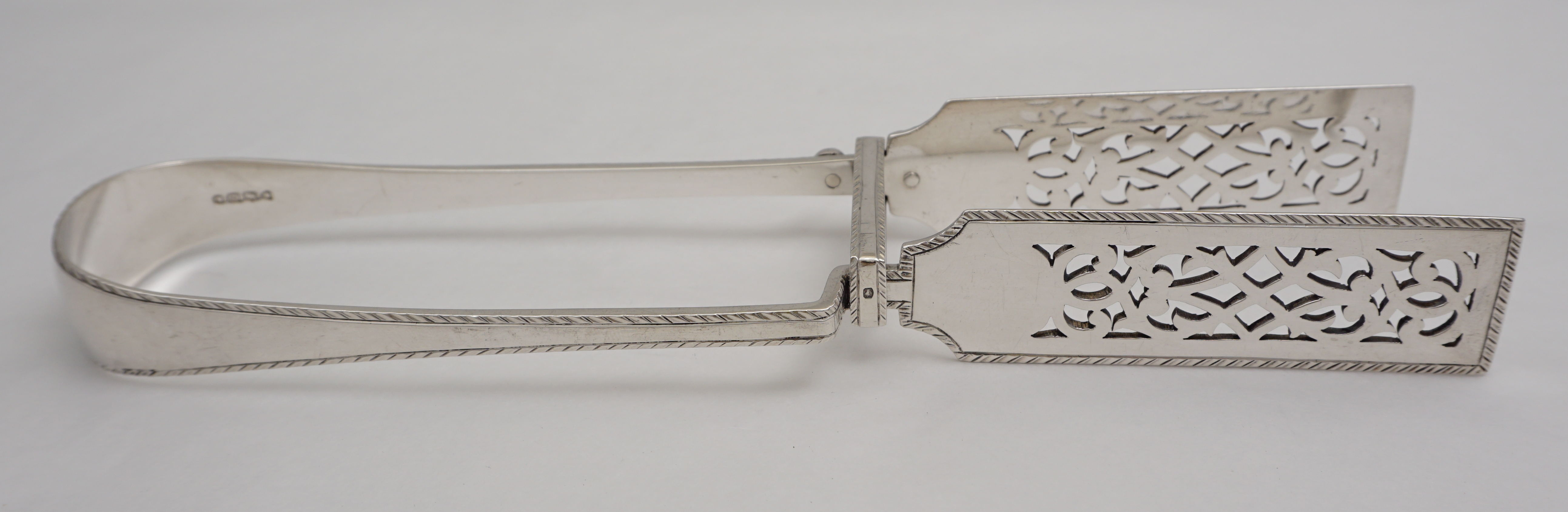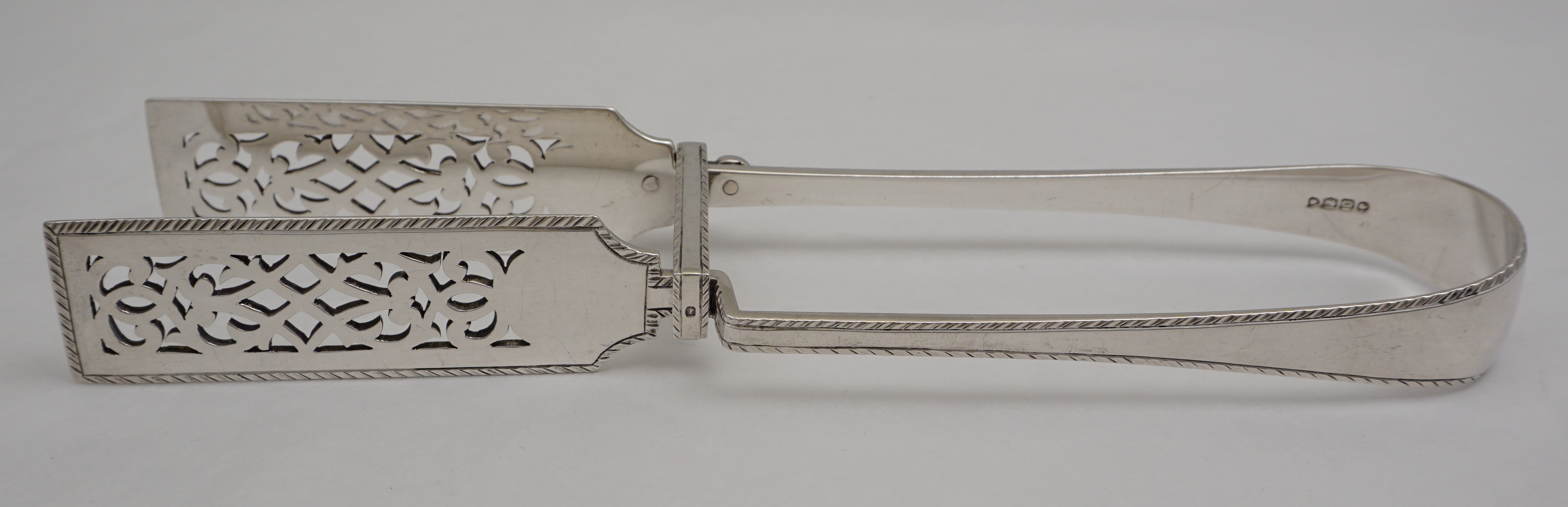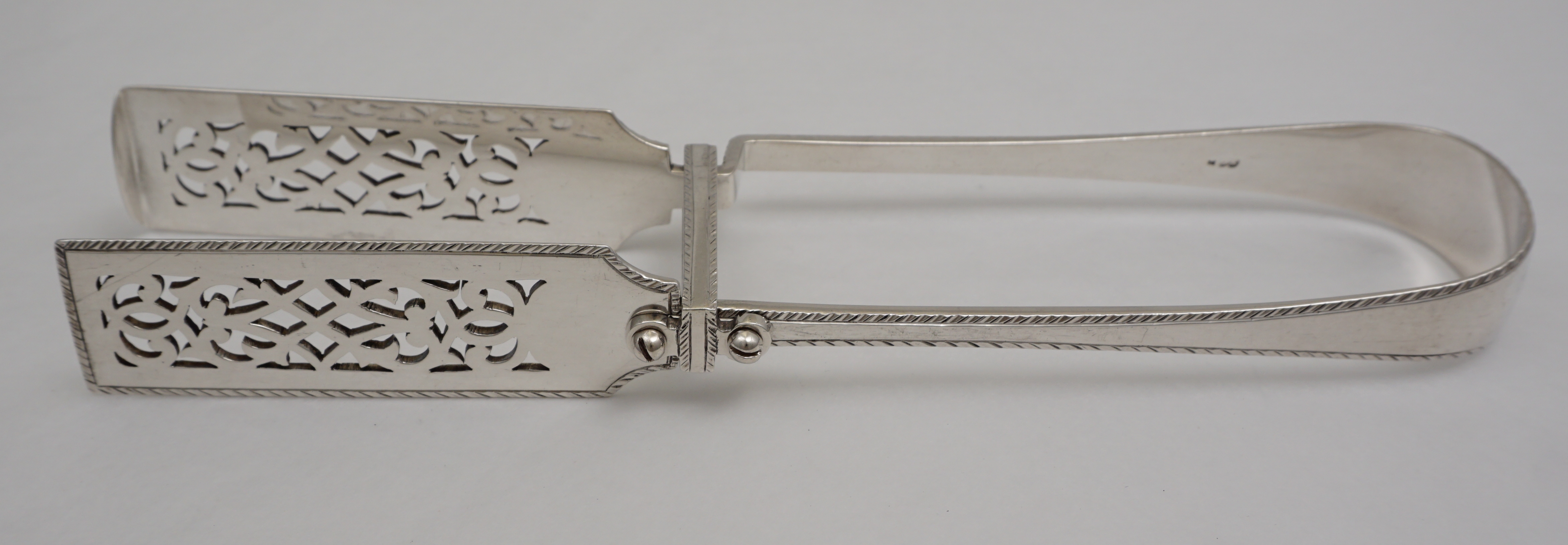 DESCRIPTION | Pair of very good antique English Victorian solid sterling silver Feather Edge Old English pattern serving (asparagus) tongs with a crest engraving to the bow. |