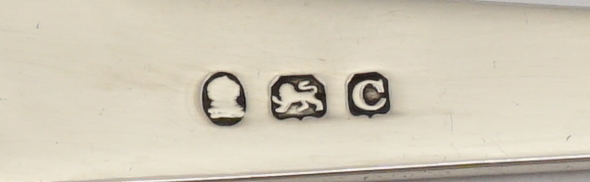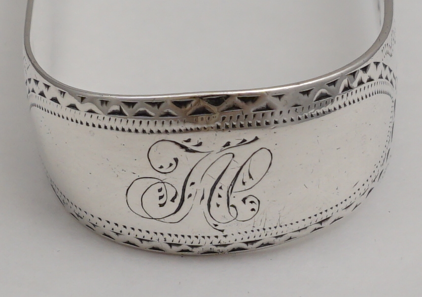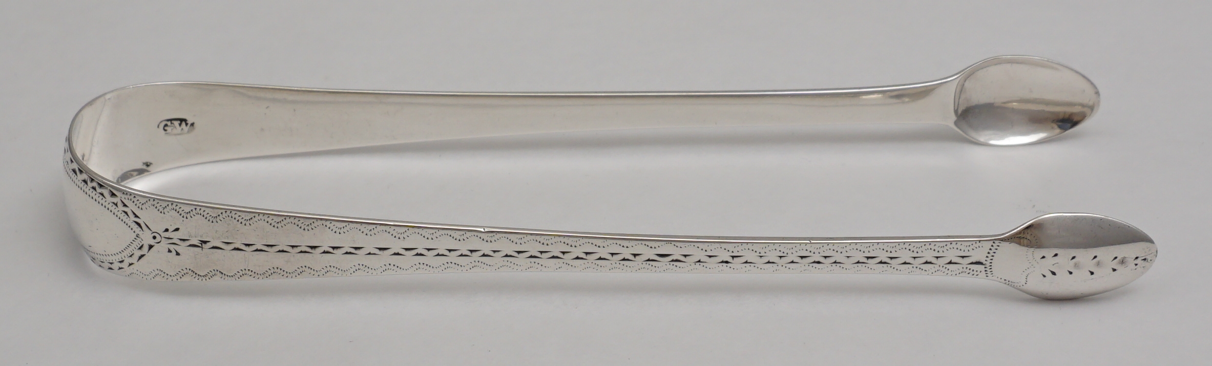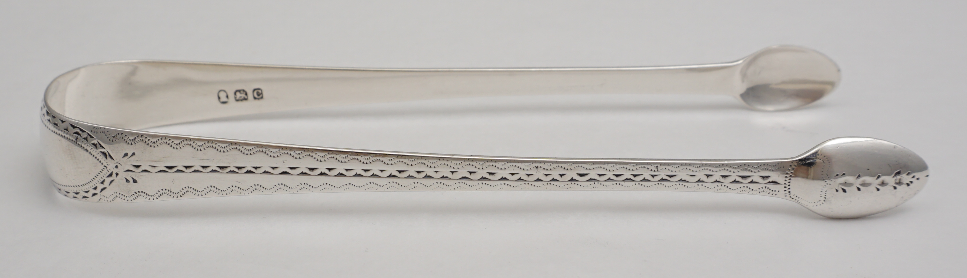 DESCRIPTION | Pair of antique English Georgian solid sterling silver Bright-cut Old English pattern sugar tongs with a monogram engraving to the bow. |