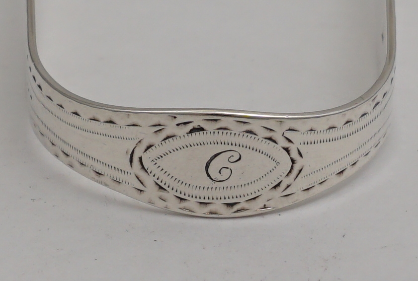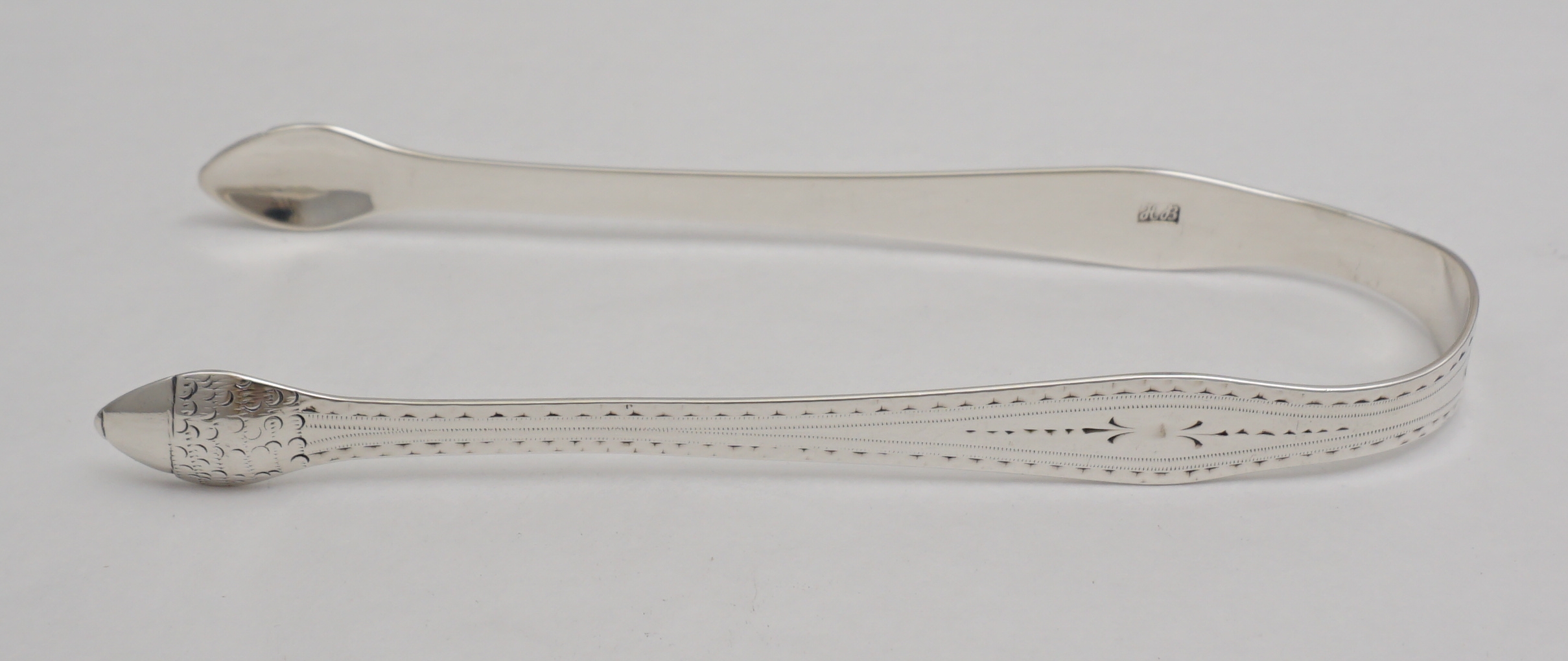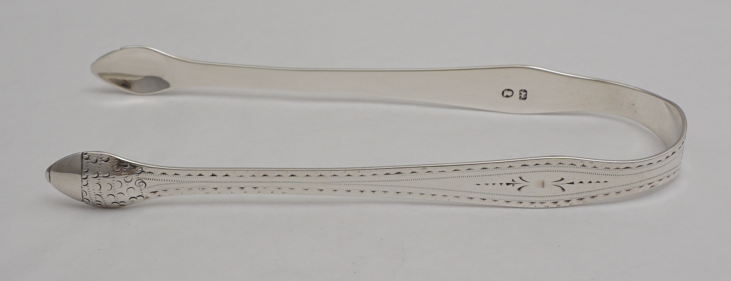 DESCRIPTION | Superb pair of antique English Georgian solid sterling silver Bright-cut Old English pattern sugar tongs with acorn grips and an initial 'C' engraving to the bow. |