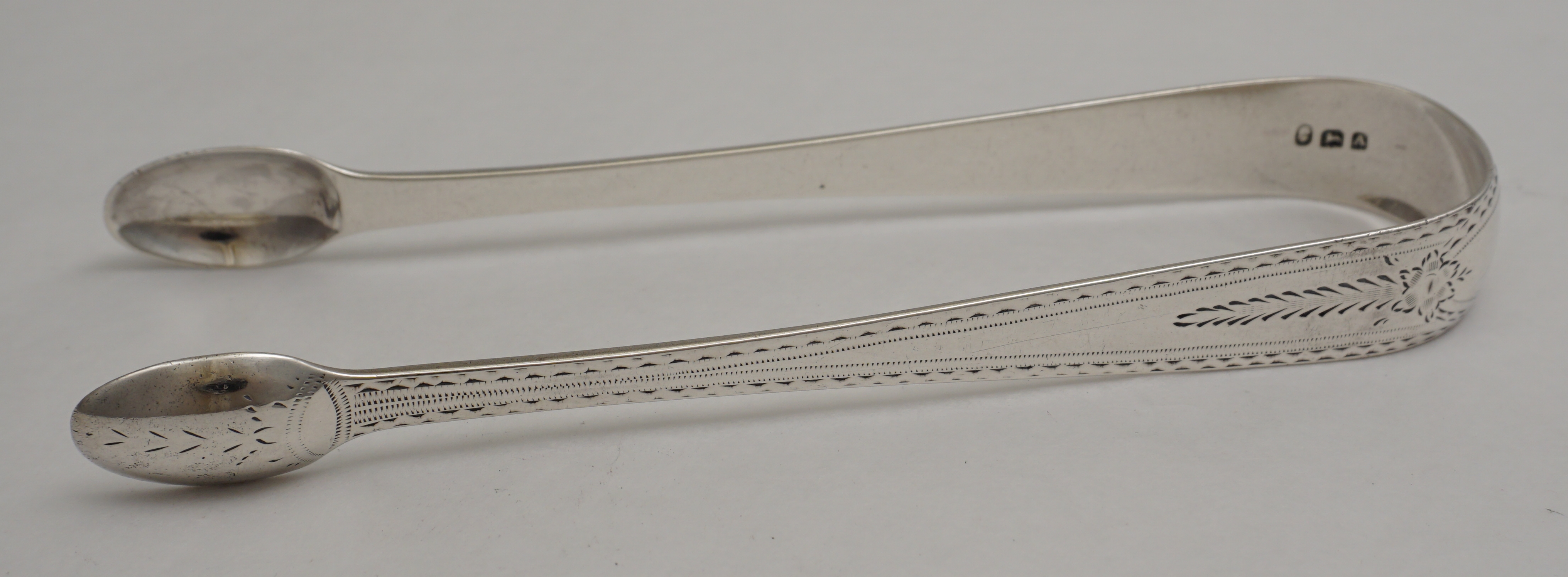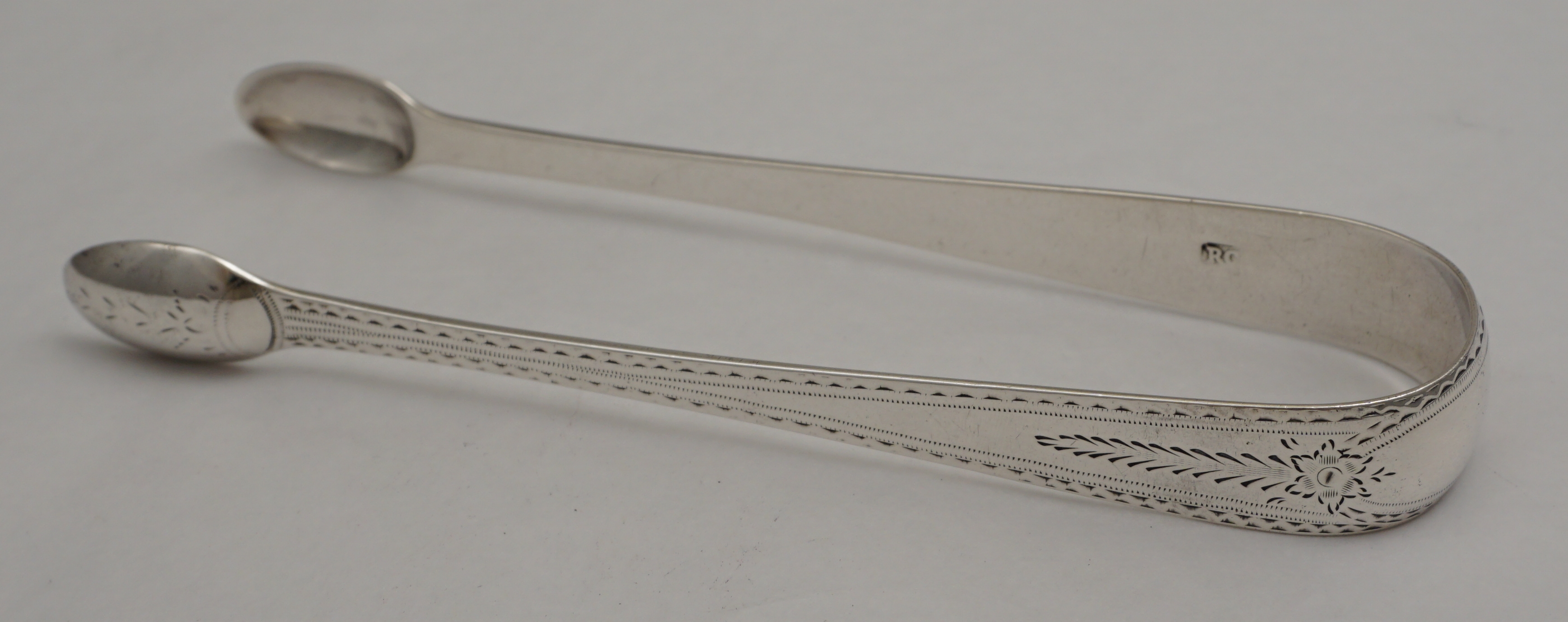 DESCRIPTION | Pair of antique English Georgian solid sterling silver Bright-cut Old English pattern sugar tongs with no engraving to the bow. |