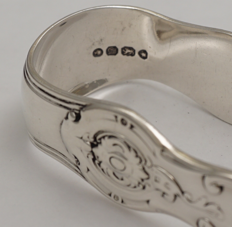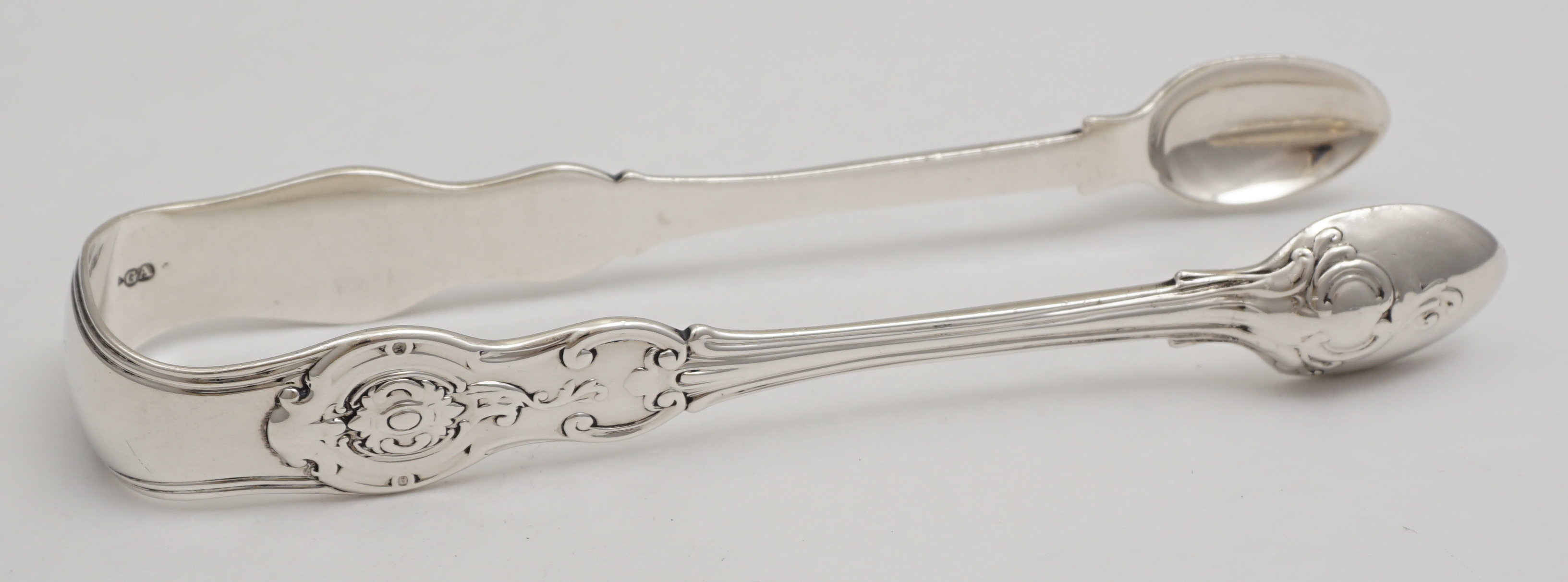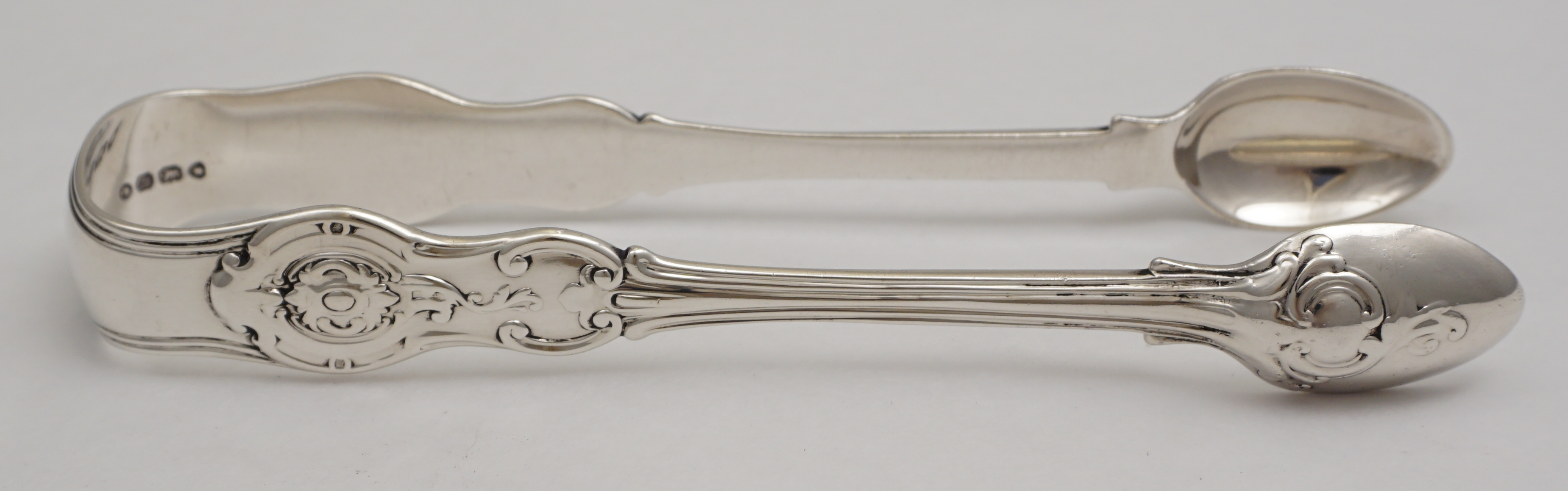 DESCRIPTION | Good and heavy pair of antique English Victorian solid sterling silver sugar tongs with an initial engraving to the bow. |