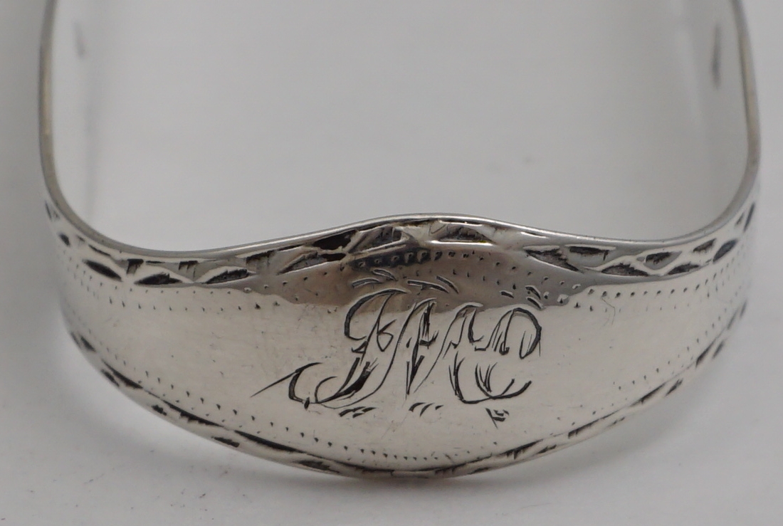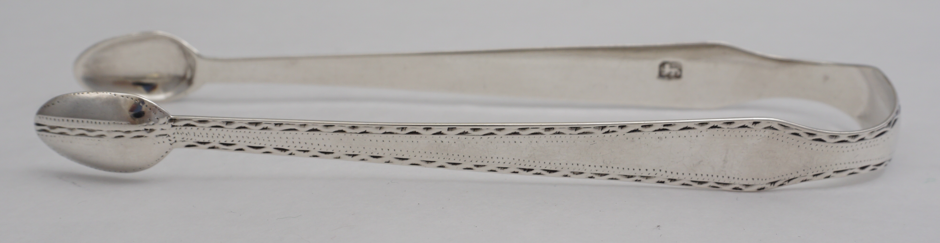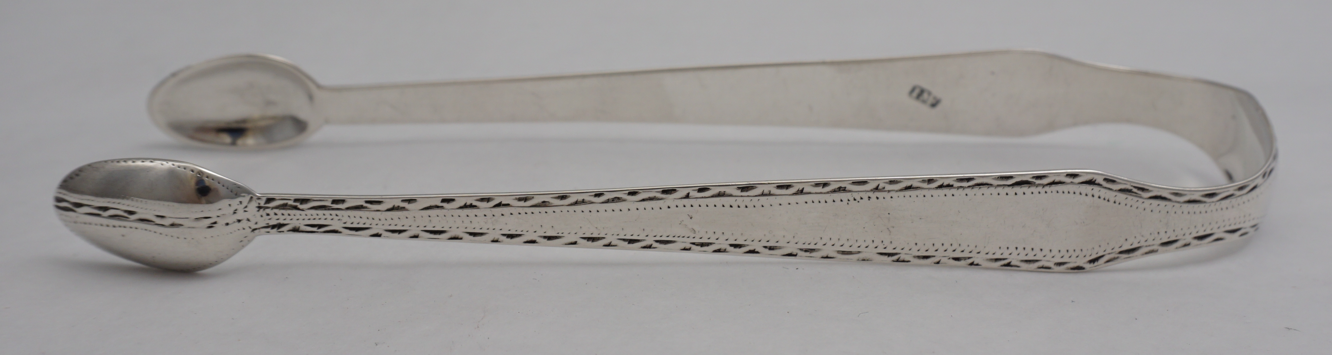 DESCRIPTION | Very good pair of antique English Georgian solid sterling silver sugar tongs with Bright-cut Edge decoration and a monogram engraving to the bow. |
