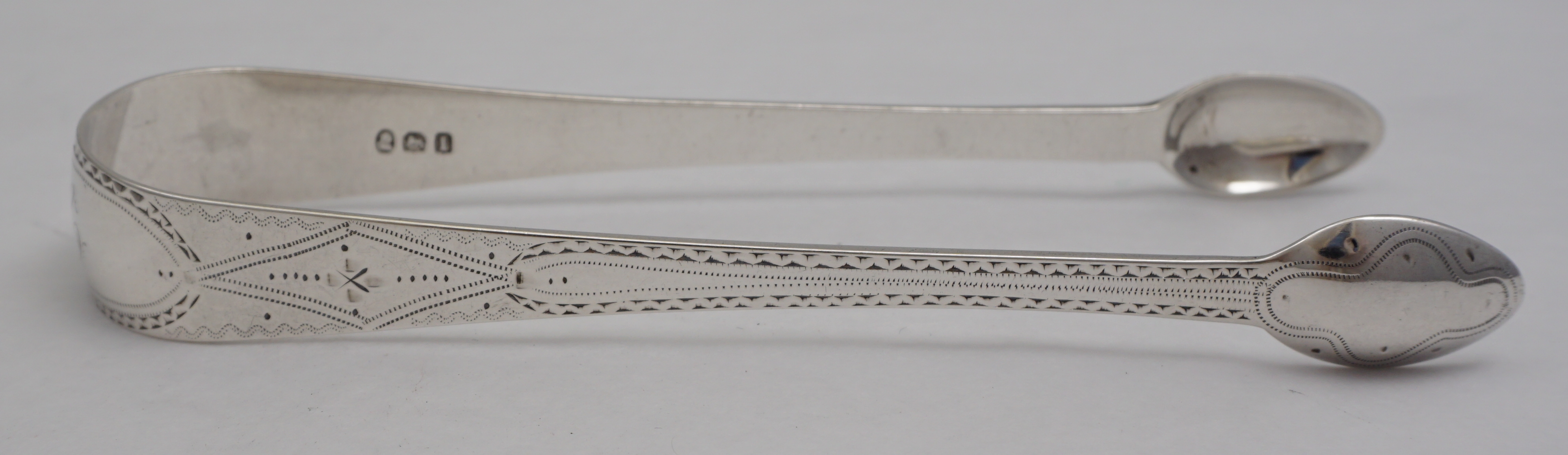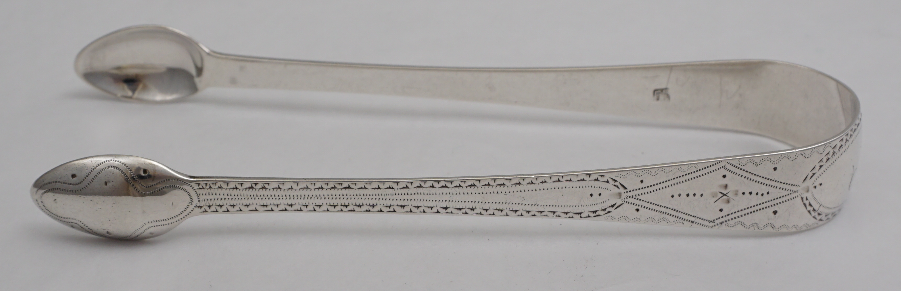 DESCRIPTION | Very good, larger and heavier pair of antique English Georgian solid sterling silver sugar tongs with Bright-cut engraved decoration and a monogram engraving to the bow. |