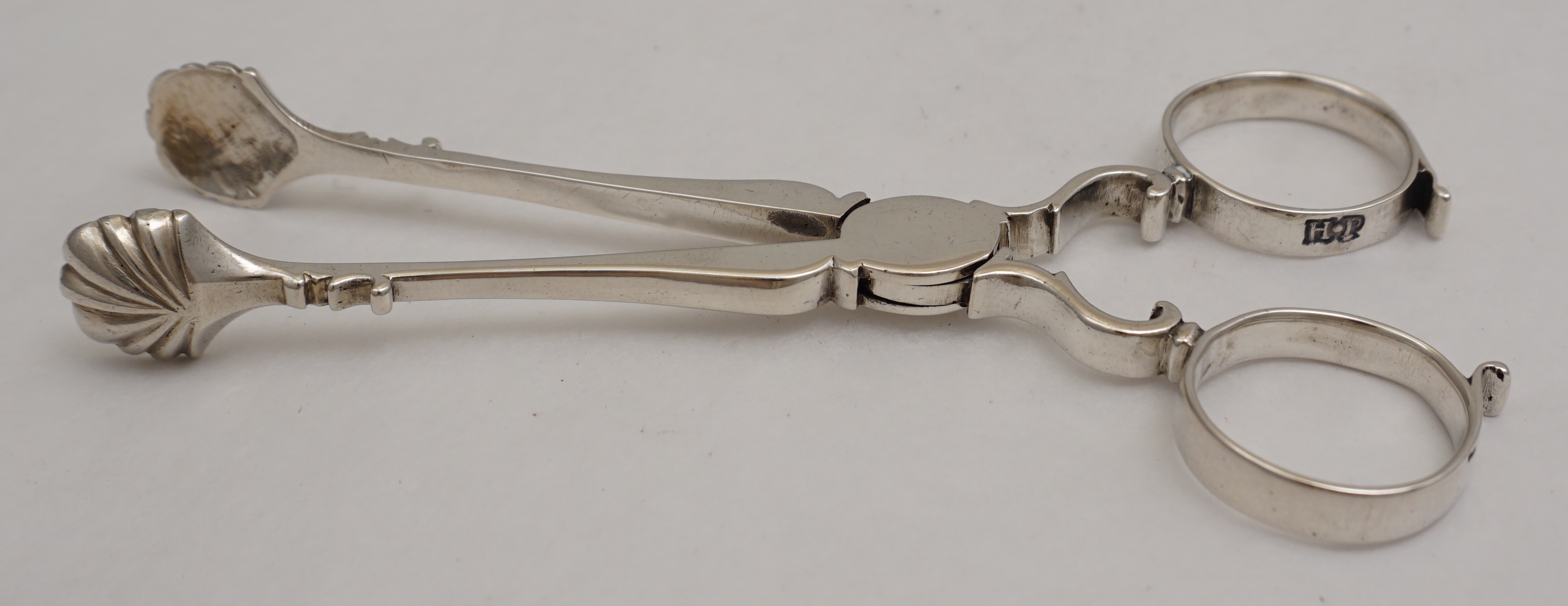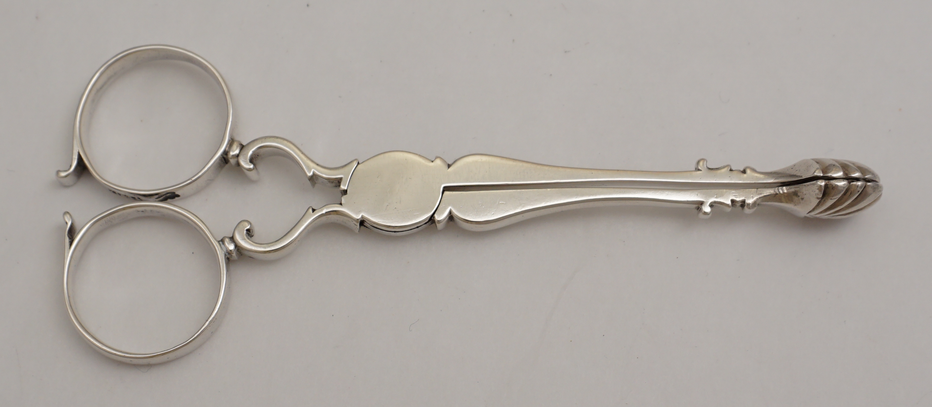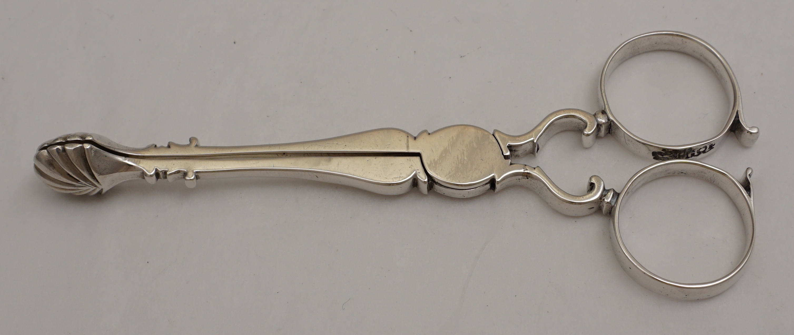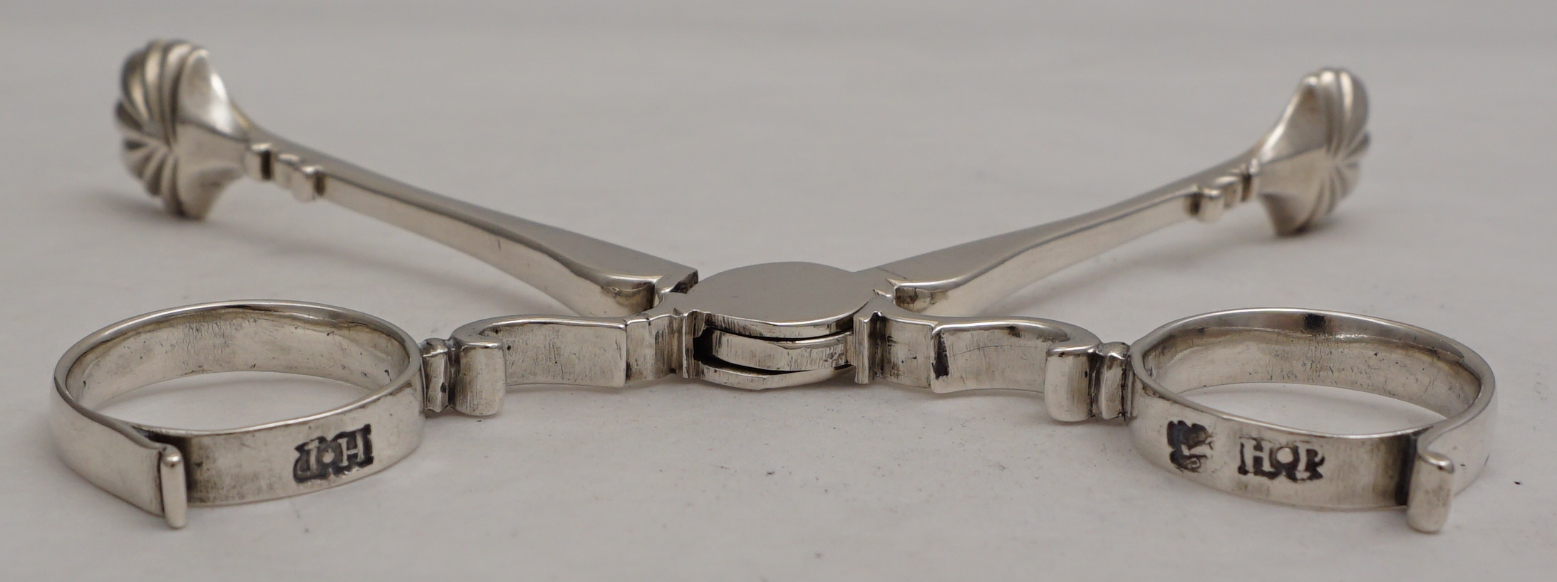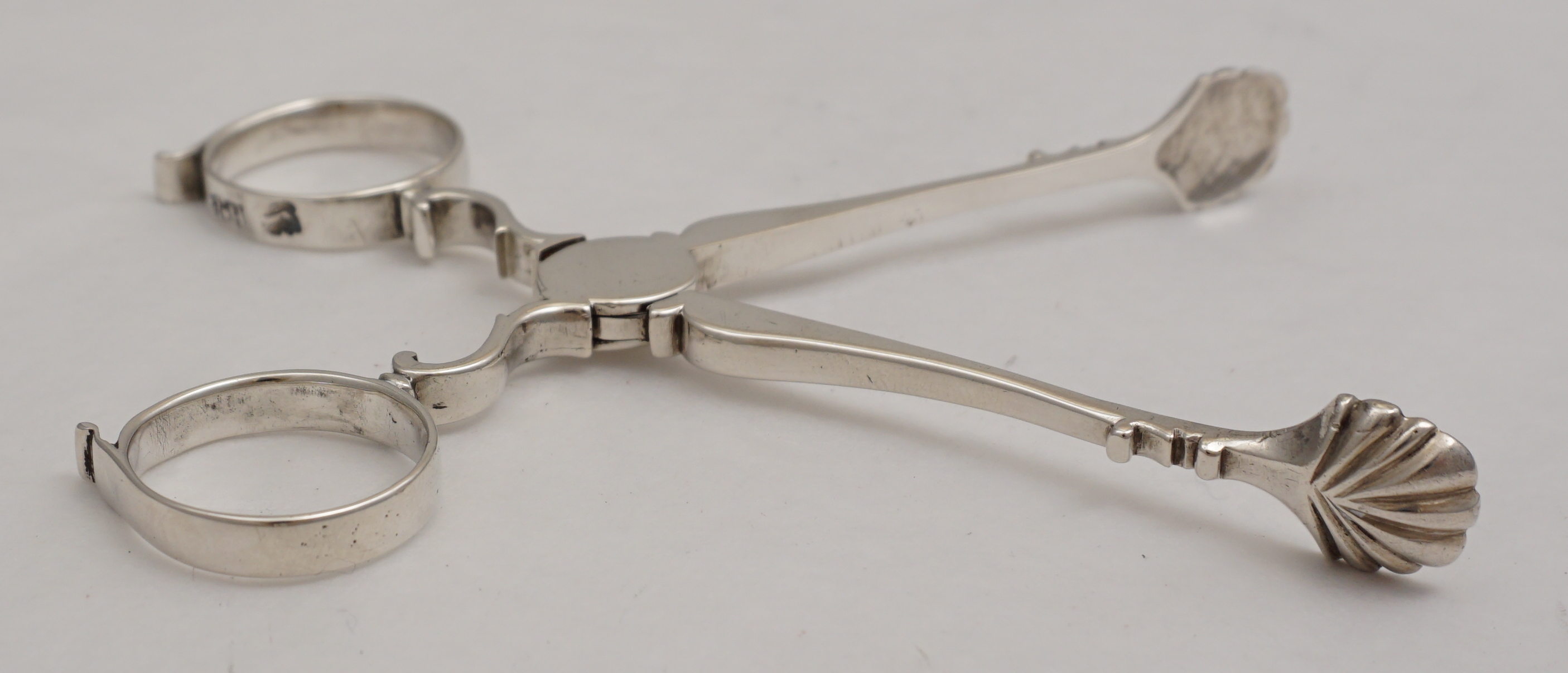 DESCRIPTION | Exceptionally good pair of antique English Georgian cast solid sterling silver sugar nips with flying scroll capped round finger rings, small box hinge, straight shafts and five-lobe grips. |