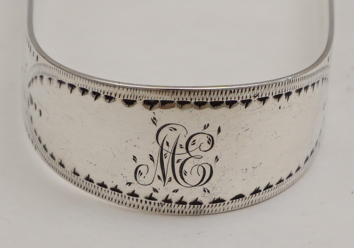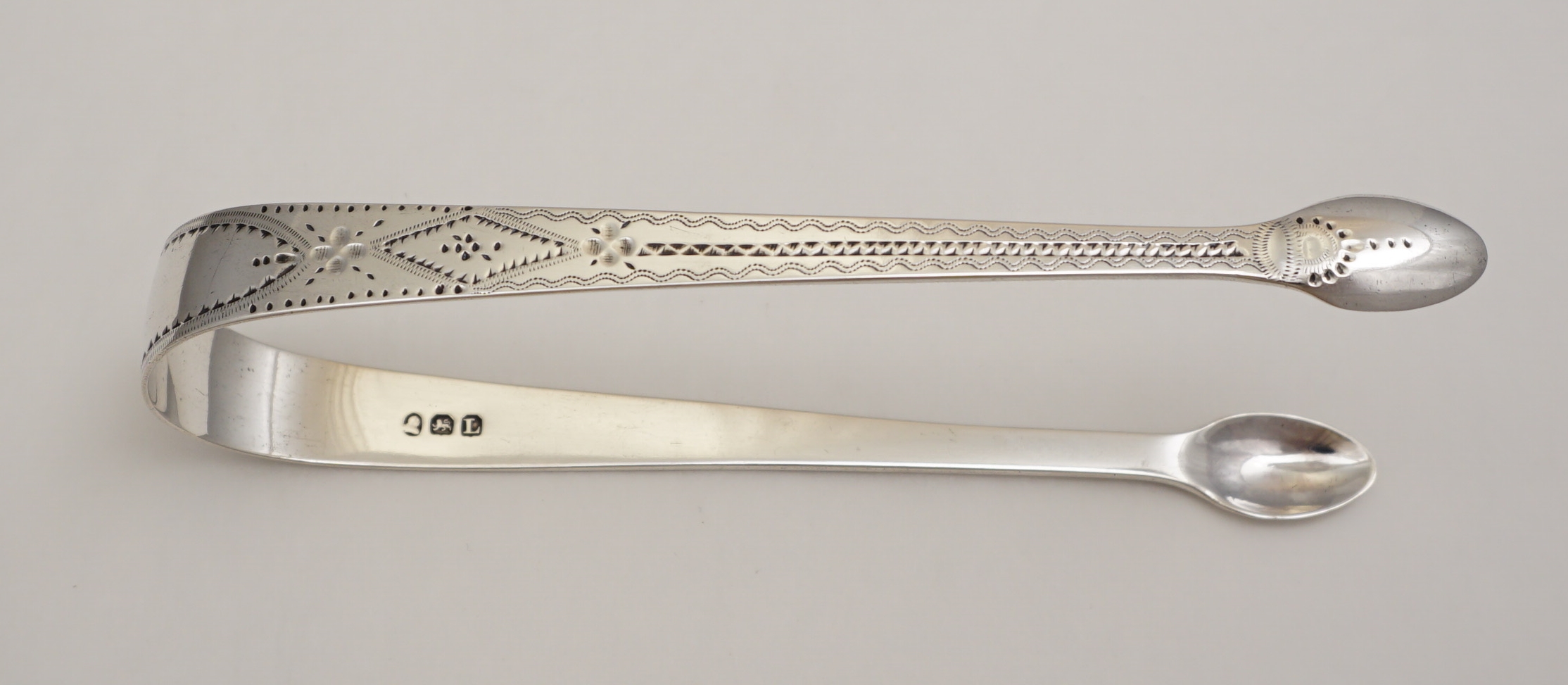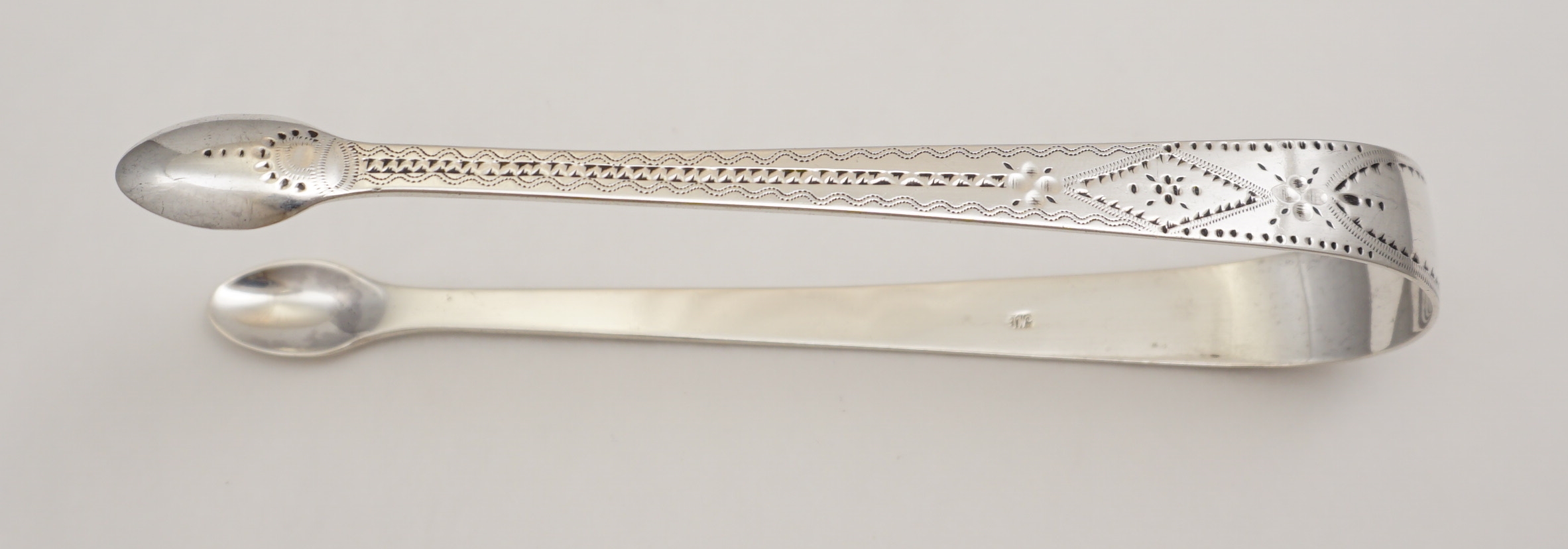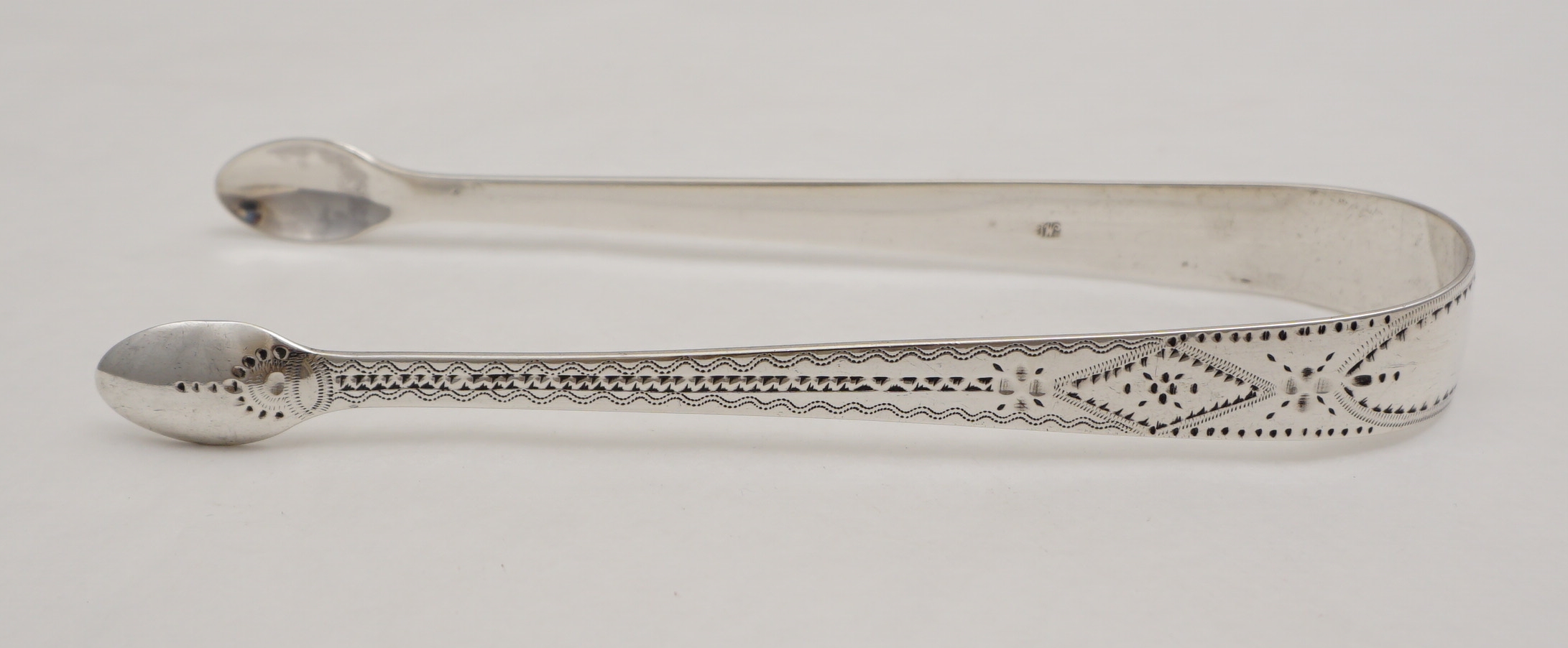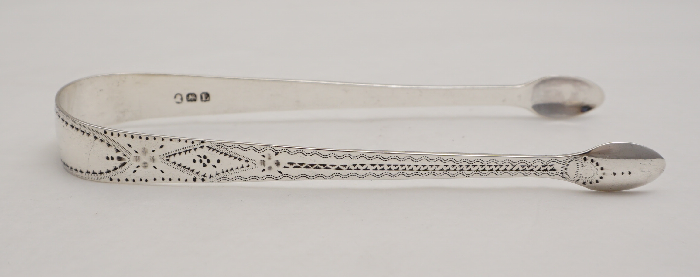 DESCRIPTION | Good pair of antique English Georgian solid sterling silver sugar tongs with a monogram engraving to the bow. |