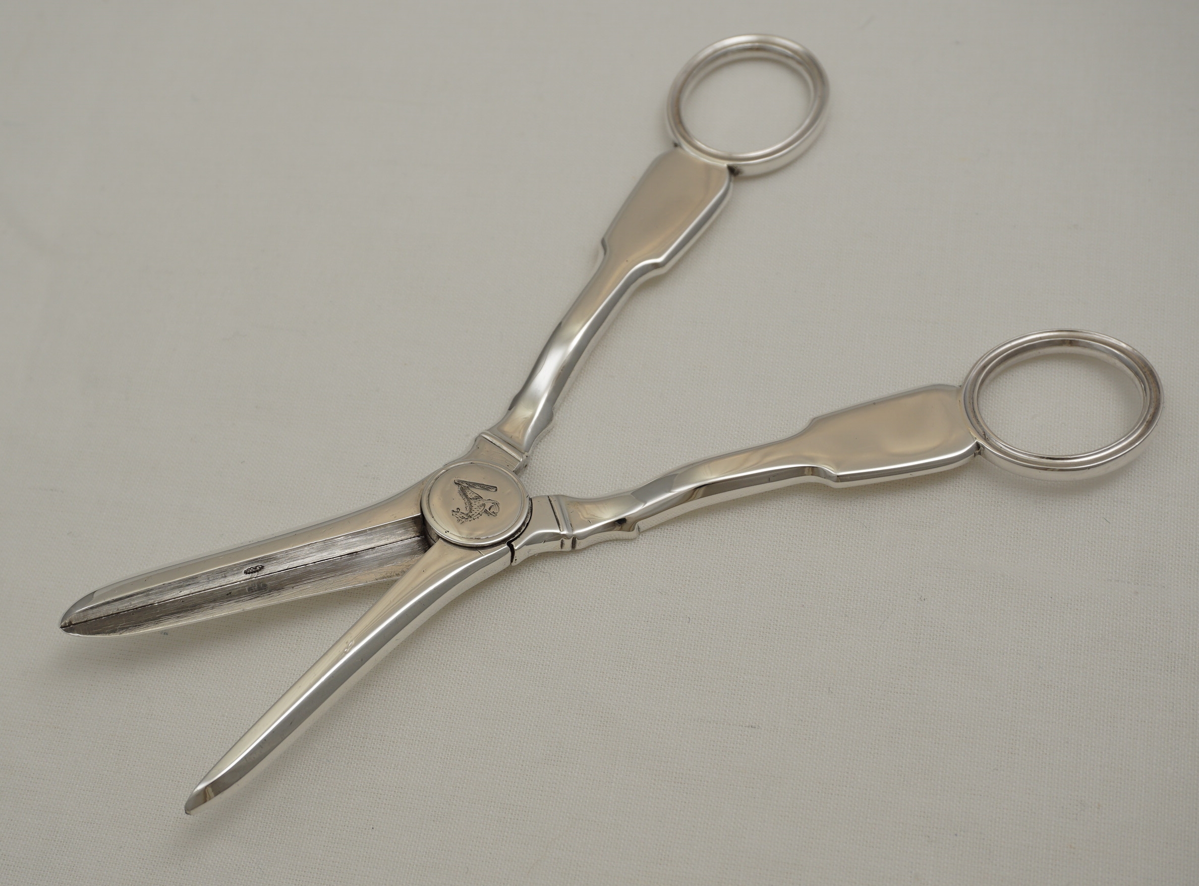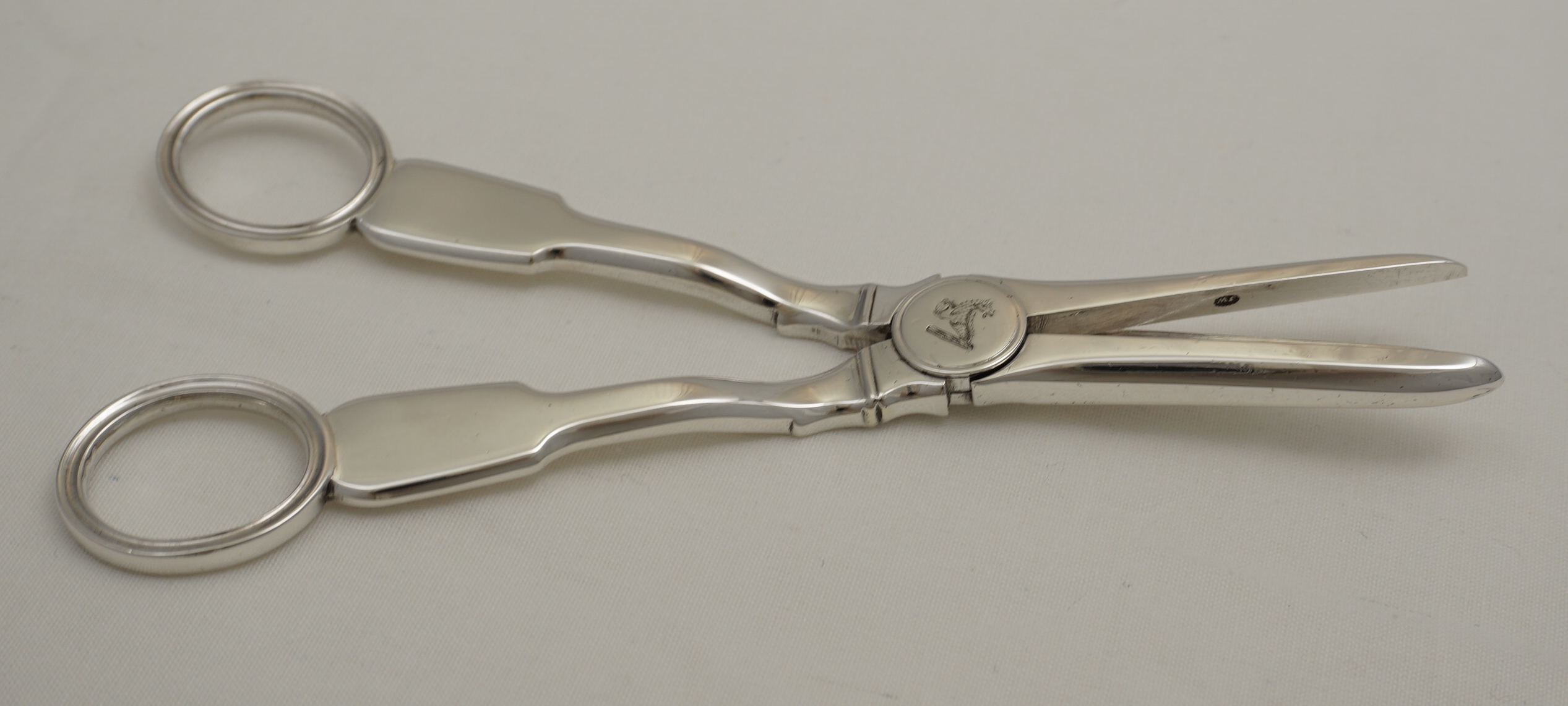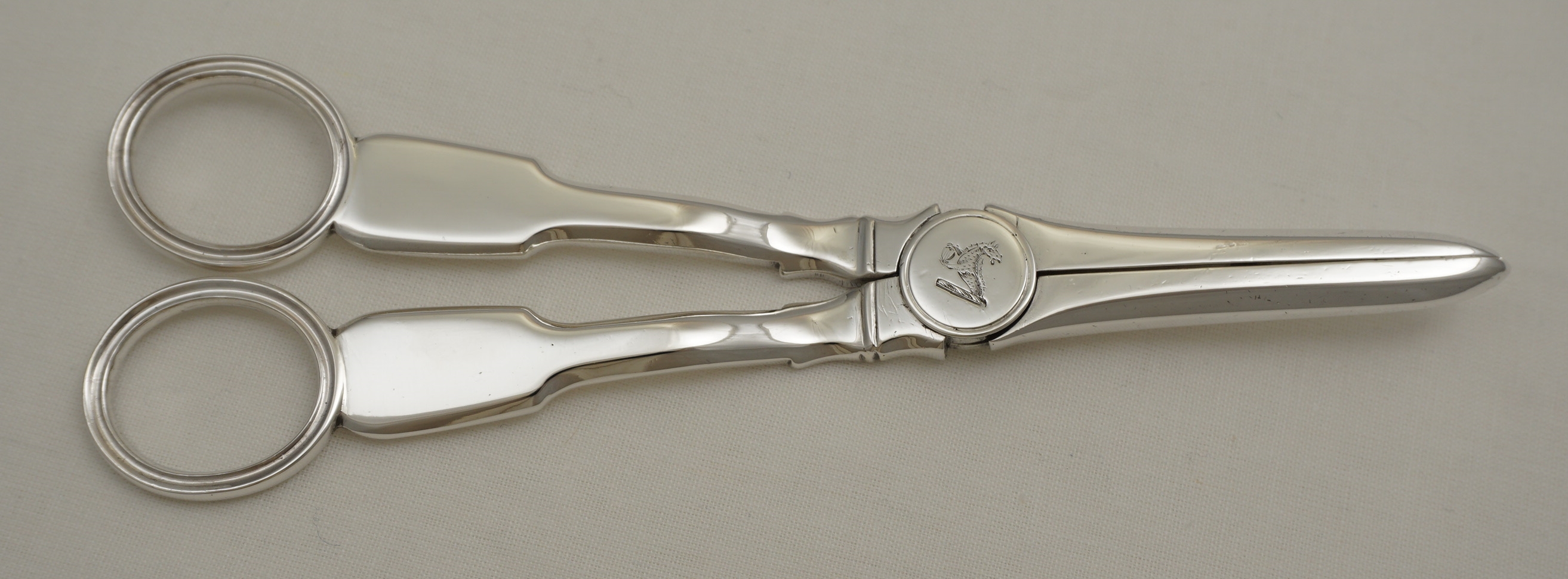 DESCRIPTION | Good and useful pair of antique English William IV solid sterling silver grape scissors (shears) with the original crest engraving to the box. |