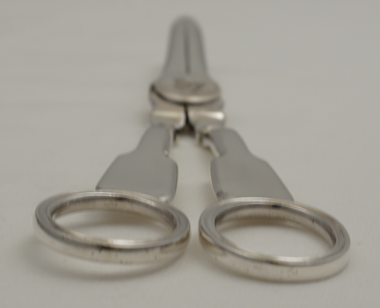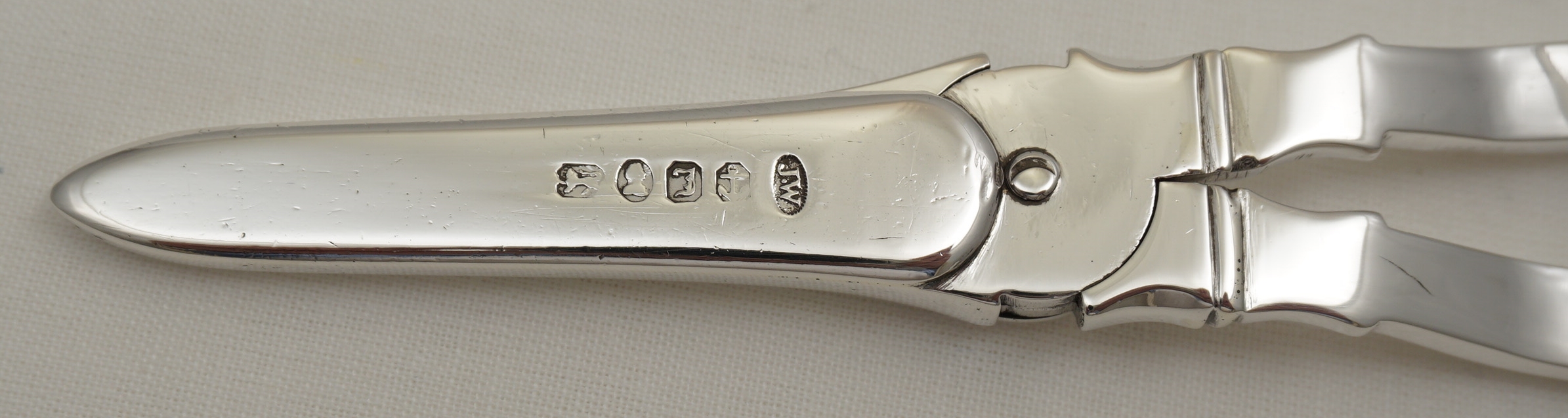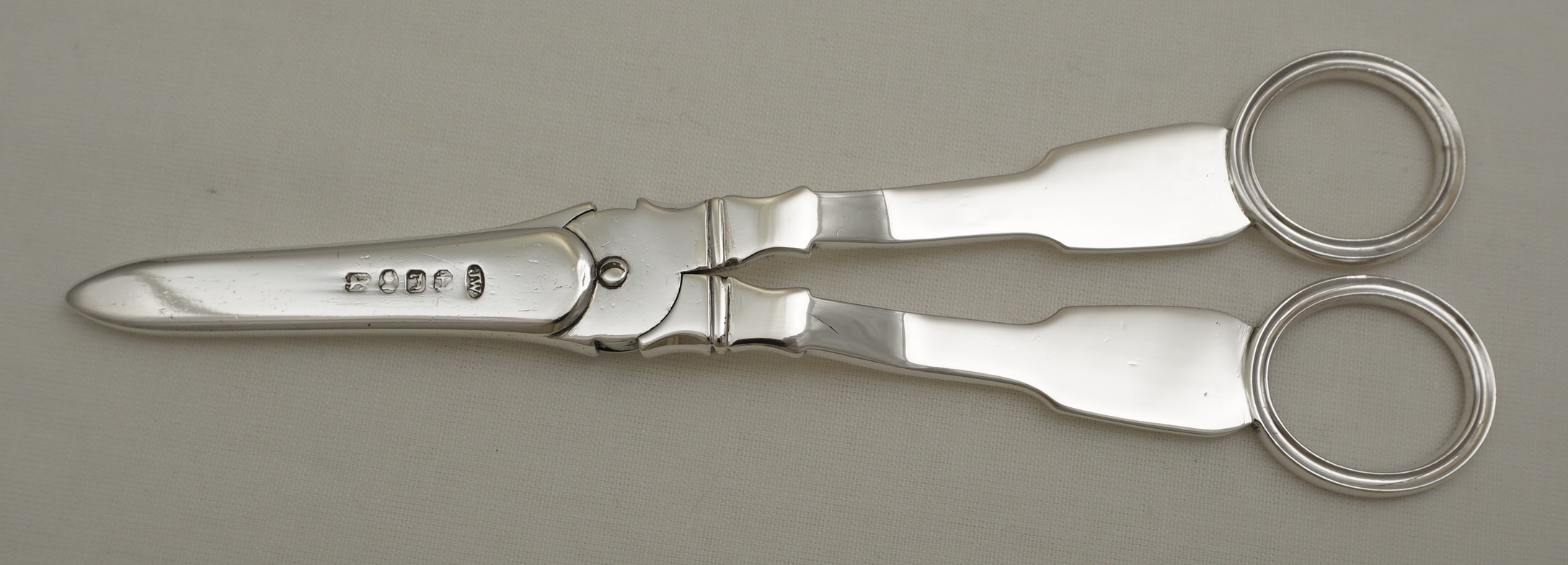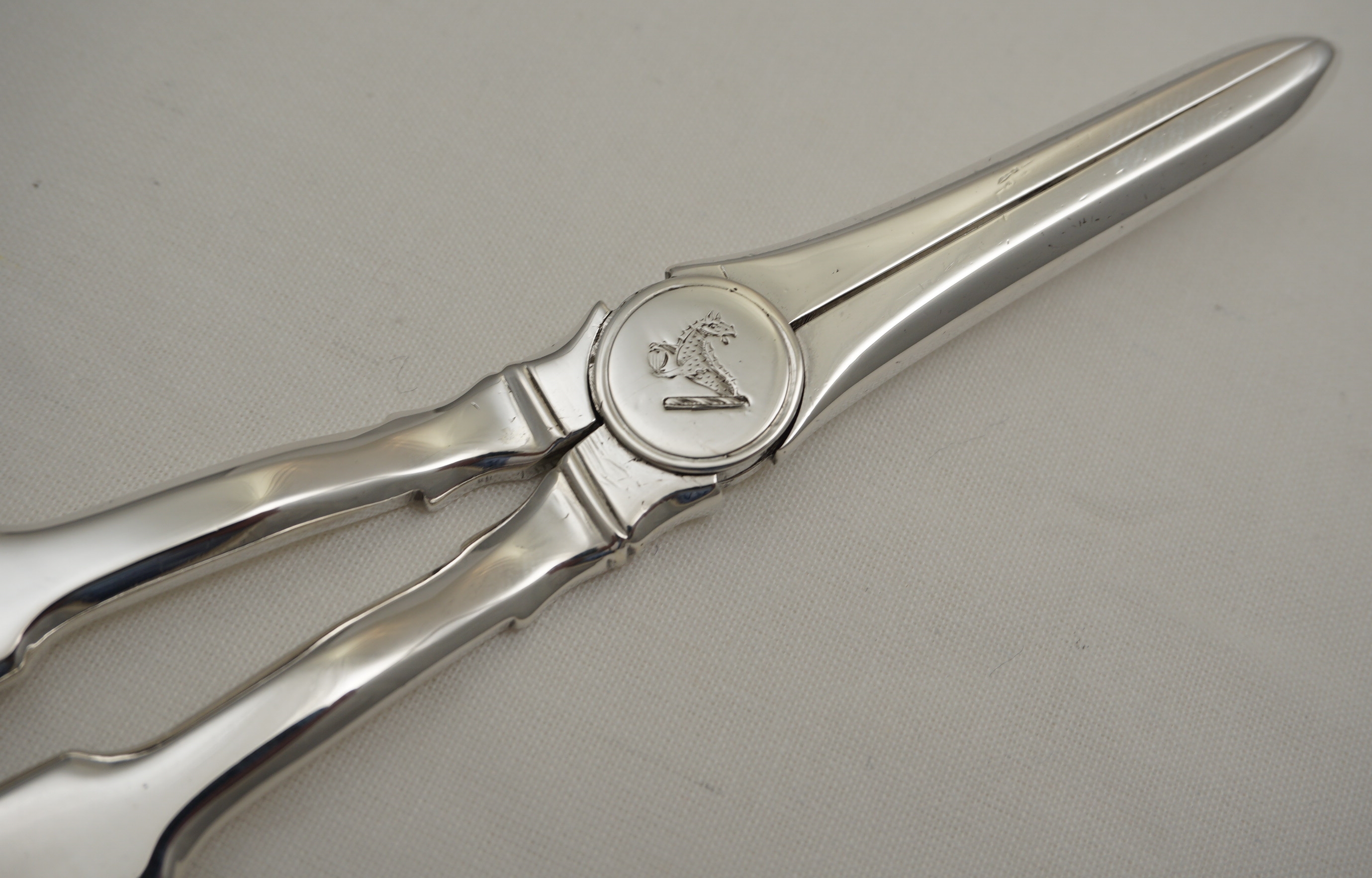 DESCRIPTION | Good and useful pair of antique English William IV solid sterling silver grape scissors (shears) with the original crest engraving to the box. |