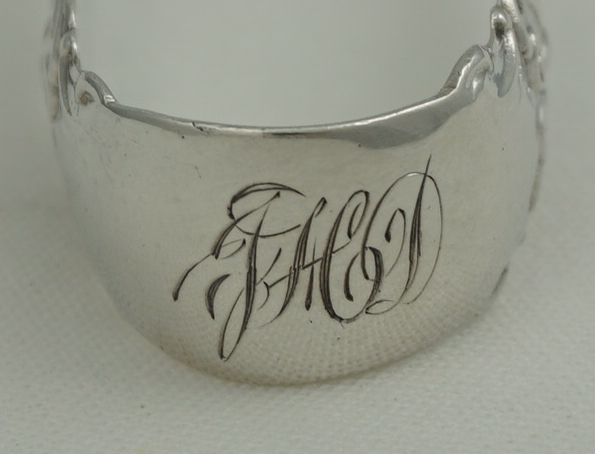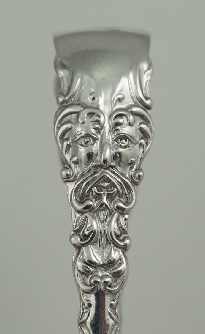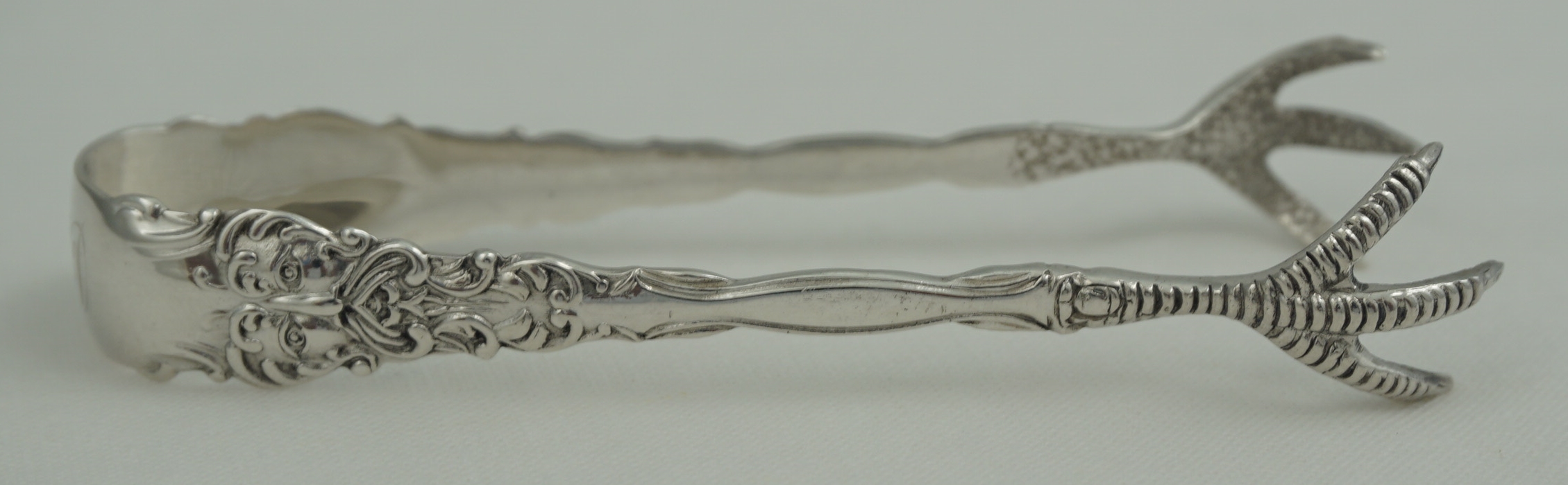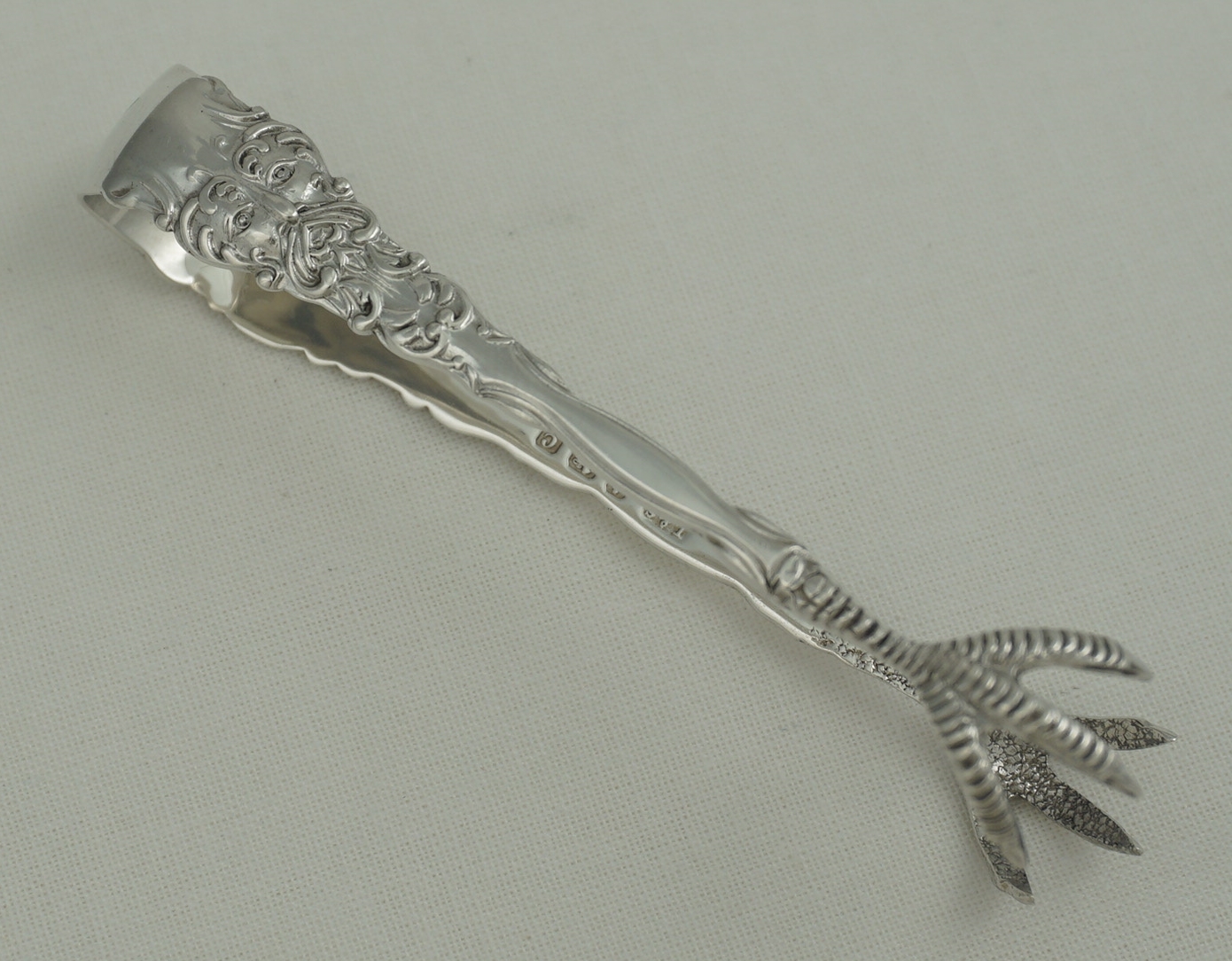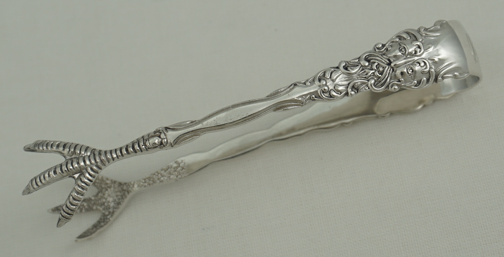 DESCRIPTION | Very good pair of unusually decorated antique English Edwardian solid sterling silver sugar tongs with claw grips and a monogram engraving to the bow. Within the cast decoration to each arm is the mask (head) of Bacchus. |