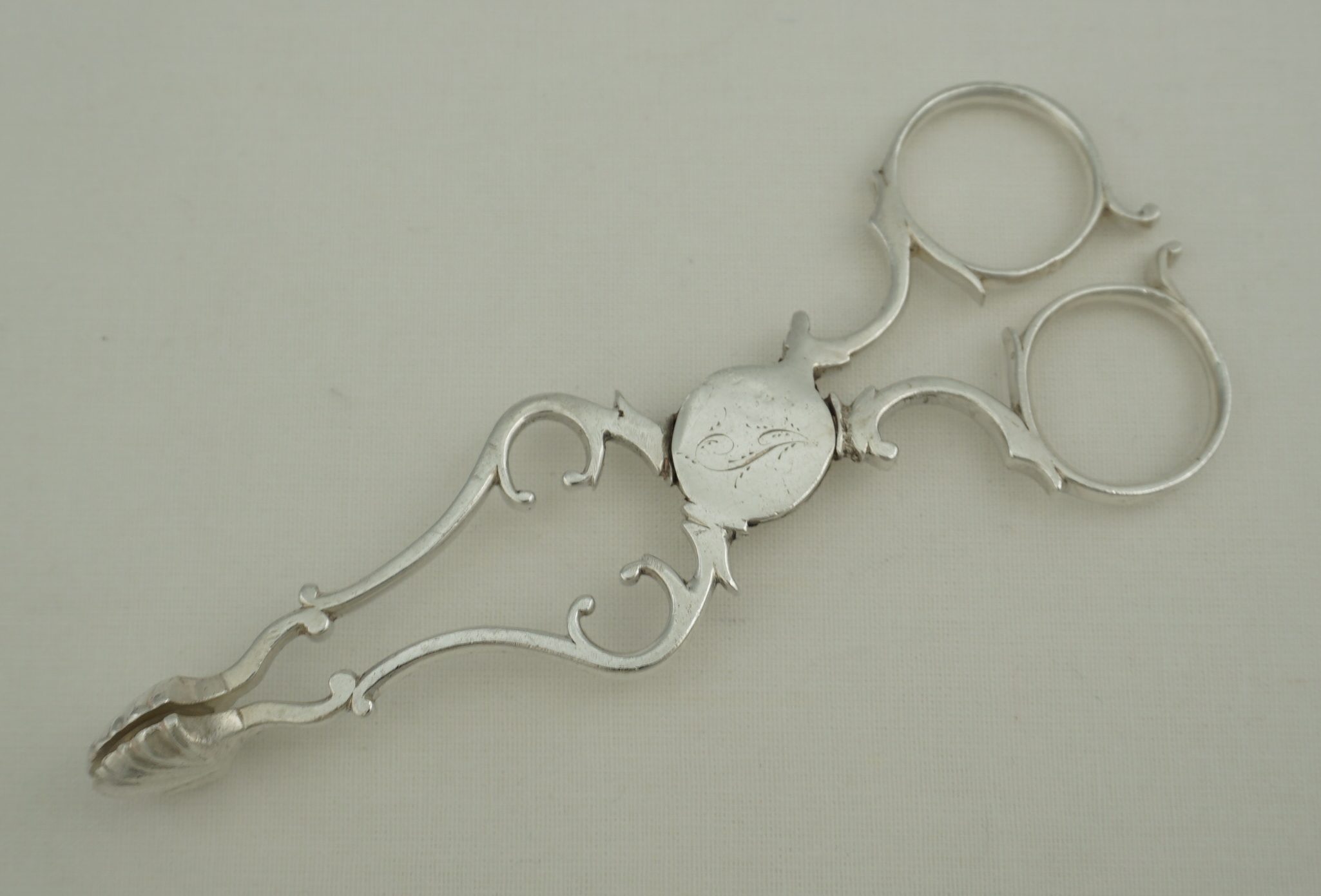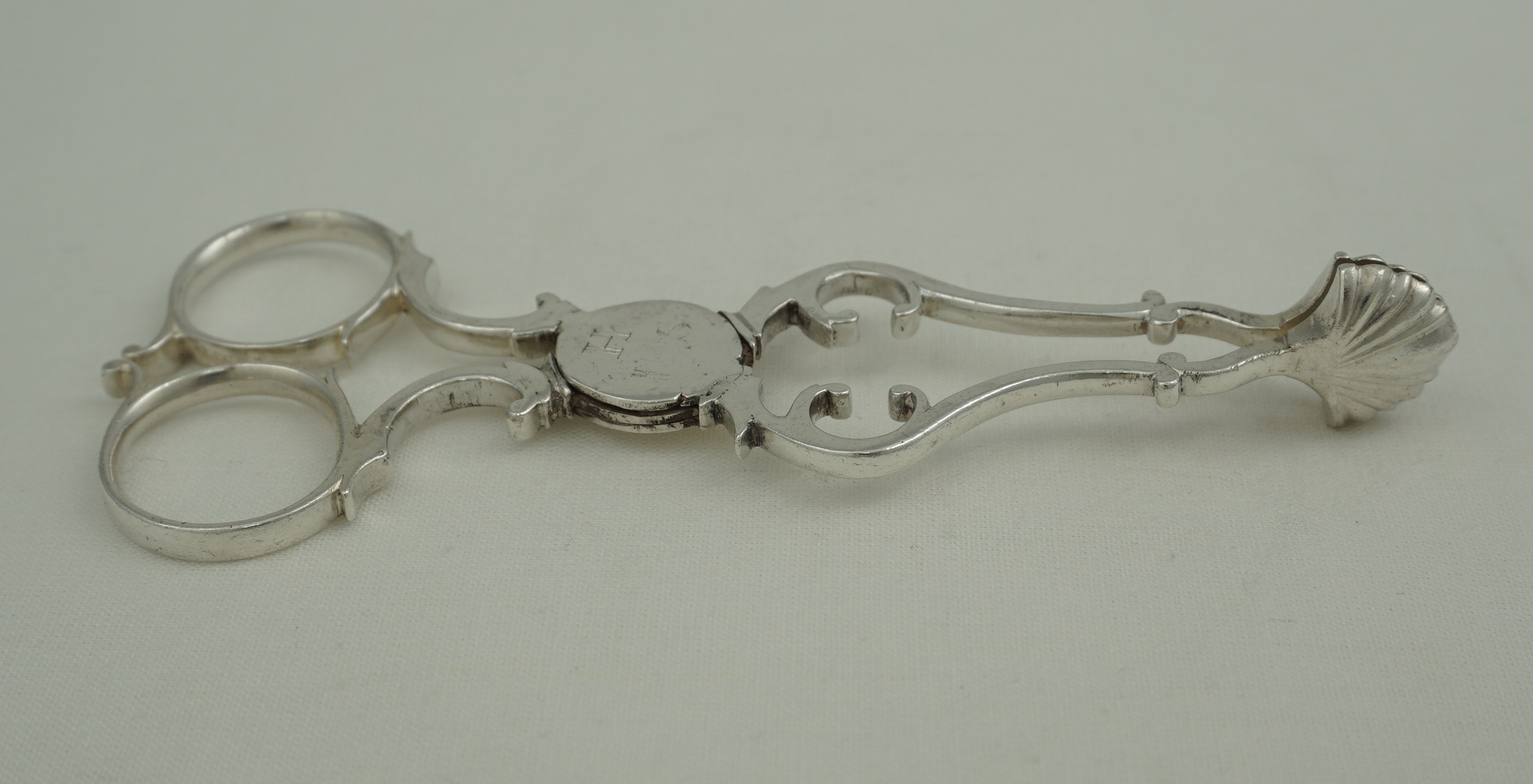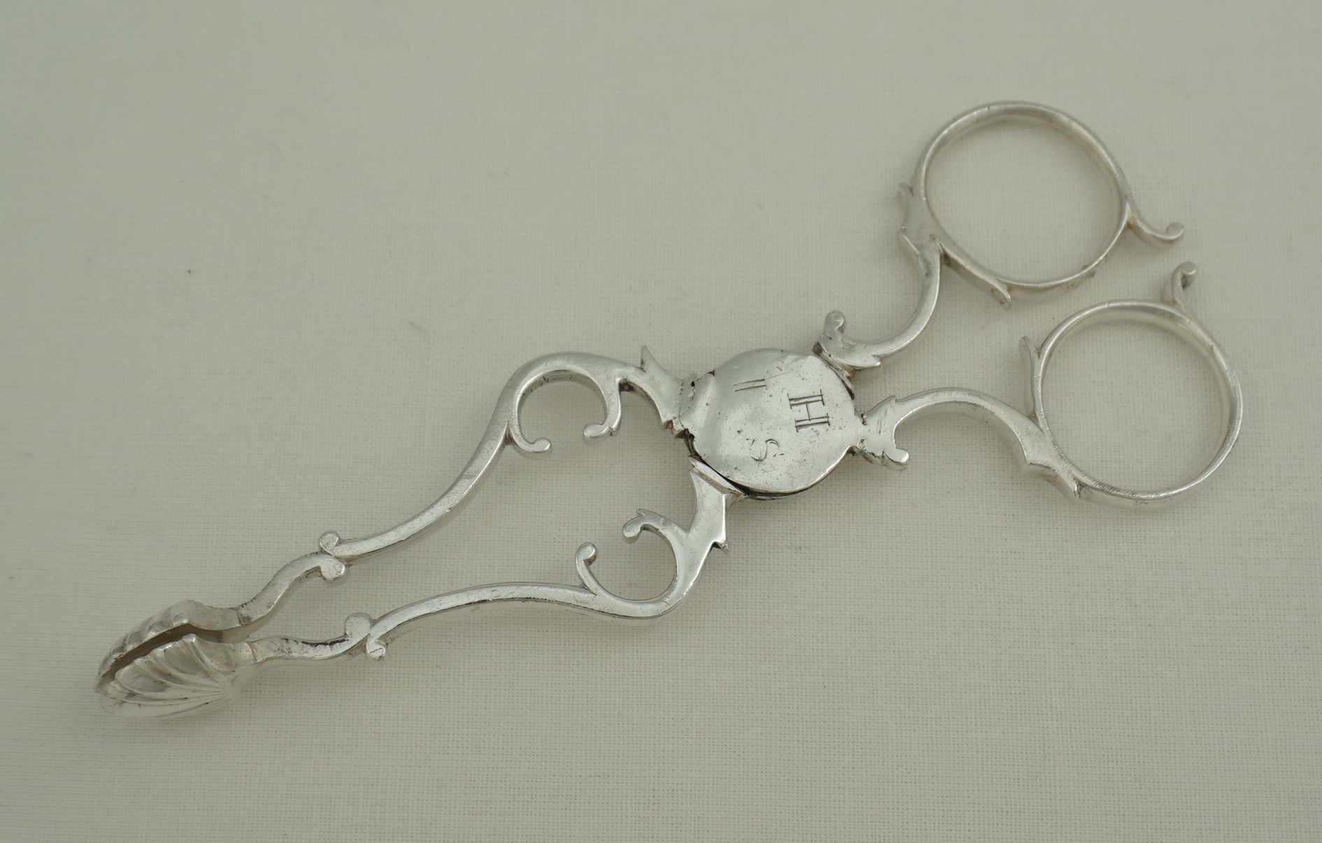 DESCRIPTION | Good pair of sturdy antique English Georgian cast solid sterling silver sugar nips with very good bulbous 5-lobe grips and with engravings to the box hinge. The H over I.S is the original engraving and most likely a marriage gift to Mr. I & Mrs. S with the surname H.... The cursive script with serifs initial engraving to the other side of the box hinge is in a slightly later style and so could be for one of the children. |