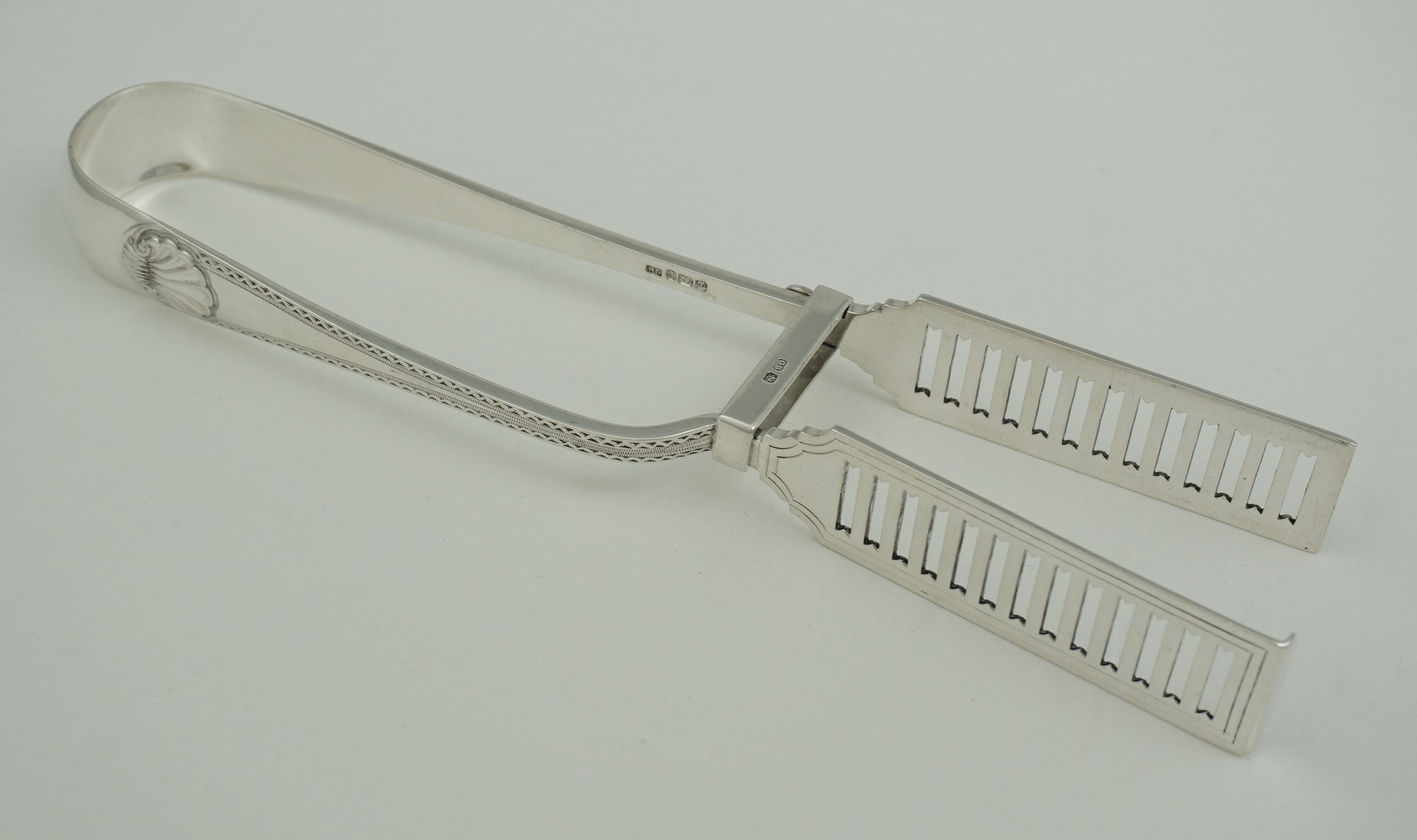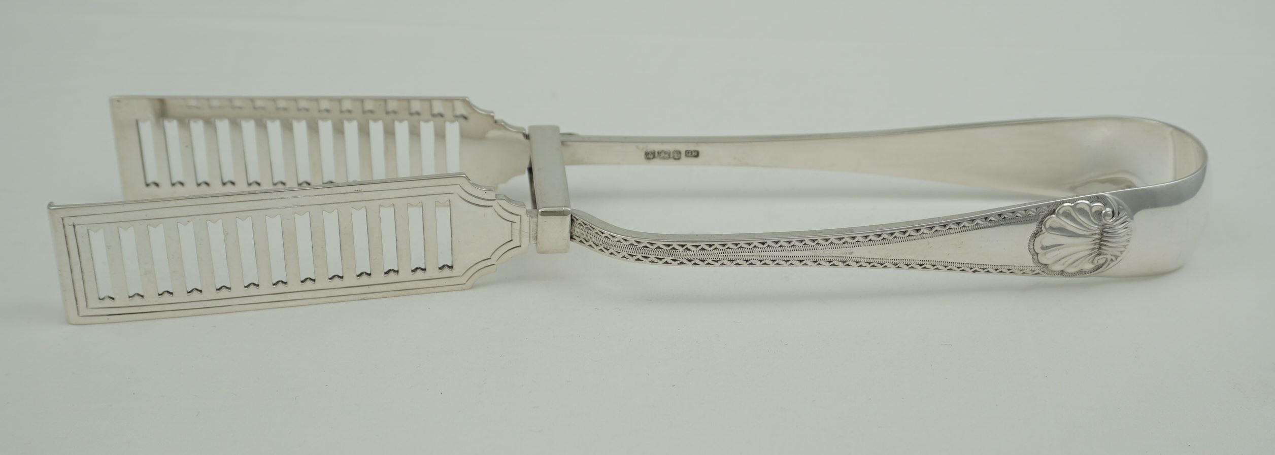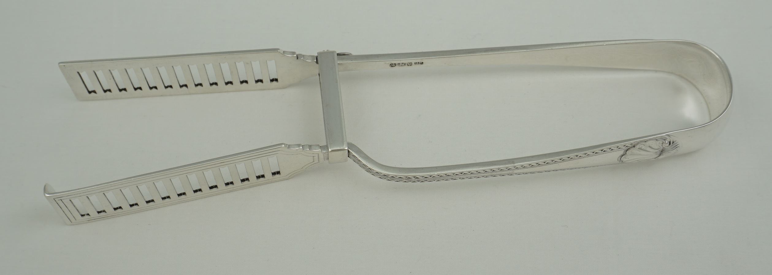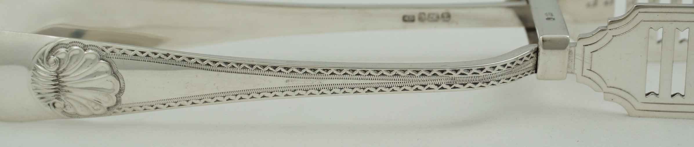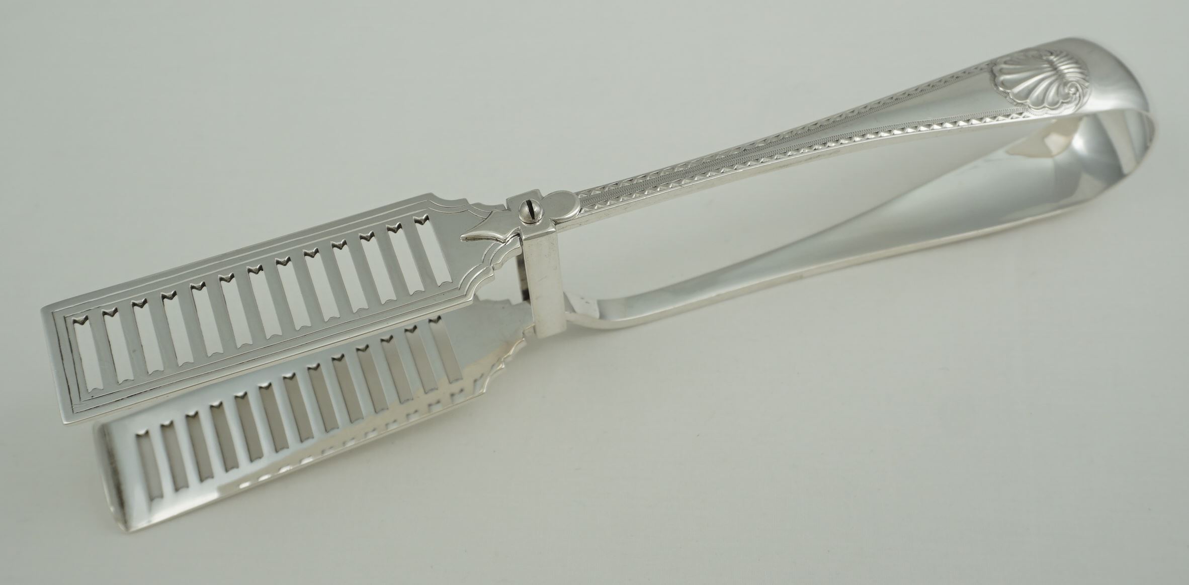DESCRIPTION | Very good pair of antique English Victorian solid sterling silver Old English Bright-cut Edge & Shell pattern serving (asparagus) tongs with a good crest engraving to the bow. |