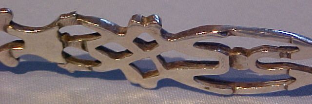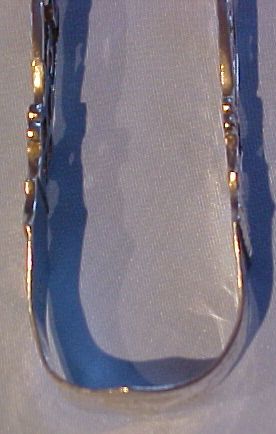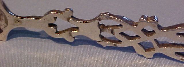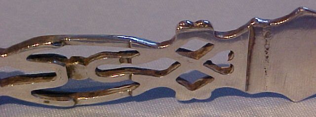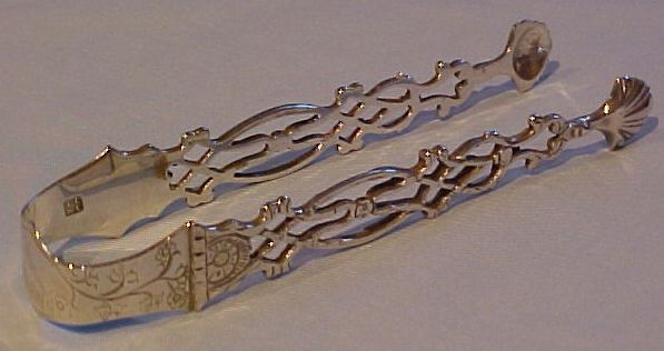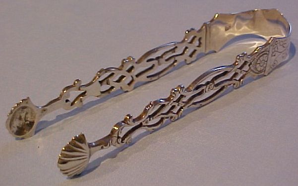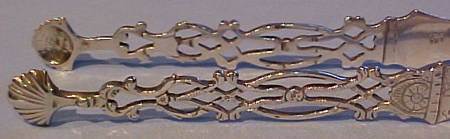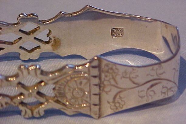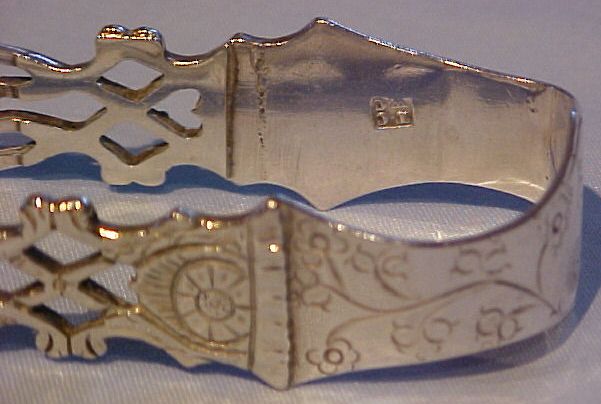 DESCRIPTION | Georgian silver cast and pierced arm sugar tongs with a crest and foliate engraved bow. Although twenty years too early to be dodgers of the tax on silver reintroduced in 1784, these tongs should have the makers mark and lion passant guardant. The assay has been avoided, perhaps to avoid the cost and trouble, and an unregistered mark struck twice. Grimwades has a little on this mark but Pickford in his Silver Flatware 1660-1980 has much more, see page 41 and page 200 for the tongs. |