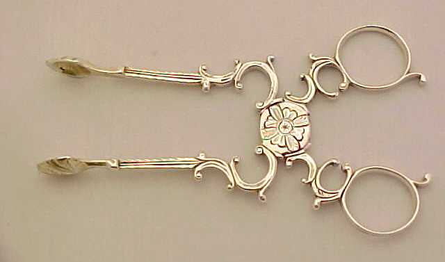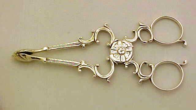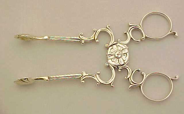 Extremely scarce pair of Georgian Irish silver sugar nips with a small initial engraving to one finger ring and a flower decorated hinge |