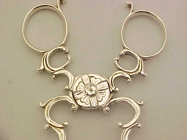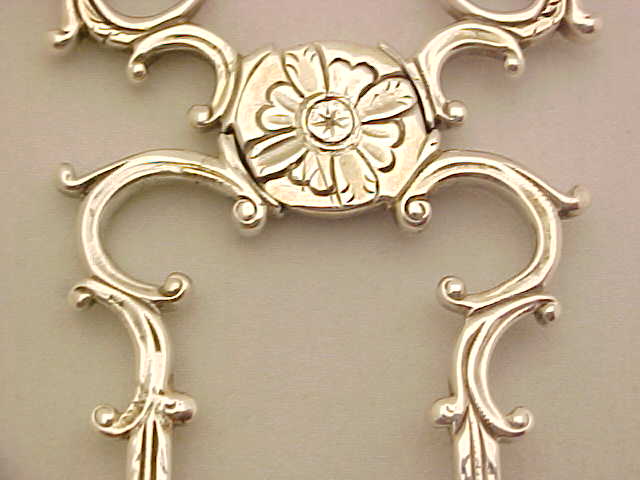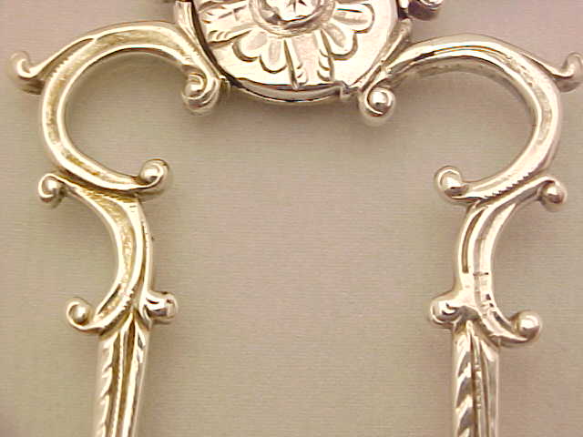 Images 4 and 6 below show the lower C scrolls, front and back. Look at the lower scroll on the right in image 4 and the left in image 6. A little silver appears within the engraved decoration. This could be evidence of a repair and it is a likely spot for one but I am not certain. |
